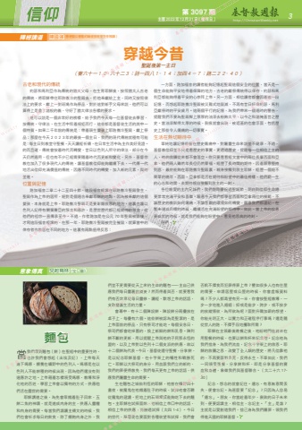 第 3097 期 主曆 2023年 12月 31日(禮拜日) http://ChristianWeekly.net 信仰 3聖誕後第一主日(賽六十一10- 六十二3;詩一四八1- 14;加四4-7;路二22- 40)古老和現代的傳統約瑟和馬利亞作為傳統的猶太父母,在生育耶穌後,按照猶太人古老的傳統,將耶穌帶往耶路撒冷的聖殿去,把他奉獻給上主,同時又按照律法上的要求,獻上一對班鳩作為祭品,對於這對新手父母來說,他們可以算得上是盡了諸般的義,守好了猶太律法各樣的要求。這可以說是一個非常好的榜樣,給予我們今天每一位基督徒去學習,按傳統、守律法、在生活中照着規矩而行,這些都是基督徒生活的其中一個特質。如果二千年前的傳統是:帶着頭生嬰孩上耶路撒冷聖殿、獻上祭品;那麼在今天2023年的最後一個主日,我們的現代傳統就極有可能是:每主日到教堂守聖餐、天天讀經祈禱、在日常生活中為主作美好見證。的而且確,傳統會按着時代而轉變,昔日以色列人所守的律法,部分在今天仍然適用,但也有不少已經需要隨着時代而更新和變化,另外,基督宗教也加入了很多現代人的傳統,讓基督教信仰能夠繼續下去,一代傳一代地活出信仰充滿價值的傳統,因應不同時代的轉變,加入新的元素,與時並進。位置與記憶路加福音二章二十二至四十節,這段福音經課在耶路撒冷聖殿發生,聖殿作為上帝的居所,絕對是個適合奉獻耶穌的地點,因為被奉獻的這個嬰孩,本身就是上帝。耶路撒冷聖殿正是要彰顯救恩的地方,這裏也讓以色列人記得有關彌賽亞的預言和應許,是歷世歷代都已經期待的救主,從他們的祖宗一直傳承至今。不過,作者路加是在公元 70 年聖殿被毀後,才寫這段福音經課的,在那一年,耶路撒冷聖殿被完全摧毀,就算當中的倖存者也散居在不同的地方。這裏有兩點值得反思:一方面,路加福音的讀者能夠記憶起聖殿這個安全的位置,當天是一個生命能夠平安地得着保障的地方,古老的獻祭傳統得以保存,約瑟和馬利亞都能夠得着平安的心崇拜上帝。另一方面,相信讀者都會因着這一段記憶,而想起耶路撒冷聖殿被災難式地毀滅,不再有昔日好像約瑟、馬利亞獻祭時的平安歲月。這兩個平行的記憶,為我們帶來一個適時的警告,提醒我們不要為聖殿髹上厚厚的油漆去粉飾太平,以今之和諧掩蓋昔之歷史。當油漆髹得太厚的時候,裂痕就會出現,被遮蓋的也會浮面,包括歷史上那些令人傷痛的一切事實。生活在熱切期待中單純地讓記憶停留在歷史傷痛中,對屬靈生命來說並不健康,不過,基督教信仰並不只是看歷史的事實,更透過歷史,提醒每一位相信上主的人,祂的救贖從來都不會落空。你只要看看經文當中的兩位長輩西面和亞拿,他們兩人雖然年長但仍然蒙福,經歷了長時間的期待,因着願意堅持到底,最終能夠在耶路撒冷聖殿裏,親身接觸到救主耶穌,經歷一個絕不簡單的晚年。西面、亞拿都是活在期待和盼望中的最佳榜樣,他們窮一生的心志和時間,去期待親自接觸到救主的一刻。各位親愛的主內兄姊們,我們剛剛慶祝過聖誕節,明白到信仰生命總要常常充滿平安和喜樂。願意今天我們都學習西面和亞拿兩位的模範,不論歷史的教訓如何傷痛,不論客觀的環境如何轉變,願意我們都謹記,在暫未達成目標的時候,繼續活在充滿盼望的期待中,如此,當上帝的旨意要成就的時候,就是我們能夠在盼望中,看見祂恩典的時刻。阿們。穿越今昔當我們想到麵包(餅)在聖經中的重要性時,也許我們會想起〈出埃及記〉,上帝每天賜下嗎哪,餵養在曠野中的色列人。嗎哪是在以色列人不能耕種的時候出現,因為他們還沒有到達應許之地。上帝藉着怎樣領受嗎哪,教導和淨化祂的百姓,學習上帝會以獨特的方式,供應他們活在塵世的需要。耶穌講道之後,為免會眾餓着肚子回家,五餅二魚的神蹟,就是道成肉身的主,供應人靈糧和肉身的需要。每當我們誦讀主禱文的時候,我們也會祈求每日的飲食,除了餵飽肉身之外,我釋經講道意象傳真 早起鳥林(文.圖)陳國強(香港聖公會聖約翰座堂座堂主任牧師)們豈不更需要從天上來的生命的麵包—主自己供應我們每日靈裹的需要?然而得着與否,就要看我們有否定意從每日靈修、讀經、默想上帝的話語,支取靈裏生活的力量。會幕中,有十二個陳設餅,陳設餅分兩疊放在桌子上,每疊有六個。這些餅被認為是聖潔的,是上帝面前的祭品,只有祭司才能吃。每個安息日,祭司們都會吃掉舊的,換上新鮮的餅和乳香。陳列餅不斷的更新,用以提醒上帝與祂的子民那永恆的盟約,以及上帝對以色列十二個支派的供應,故以十二個餅為代表。今日,基督徒遵守聖餐,分享餅,是以紀念耶穌基督,在十字架上的犧牲和戰勝死亡。耶穌以大祭司的身分,用血跟我們立的新約,我們的罪便得赦免,我們每天更有上帝的話語,供應我們屬靈生命的需要。生在麵包之城伯利恆的耶穌,祂曾在曠野四十晝夜,被魔鬼在祂餓着肚子的時候,試探祂會否聽從魔鬼的建議,把地上的石頭變成能夠吃下去的麵包。主耶穌在試探面前,祂相信上帝口中的話語,相信上帝的供應,而勝過試探 ( 太四 1-4)。今日的世代,基督徒也要面對各種欲望和試探,我們會否飢不擇食而犯罪得罪上帝?譬如很多人也有住屋的需要,申請居屋或公屋的時候,你會虛報資料嗎?不少人都渴望有另一半,你會按聖經教導,一步一步地進入婚姻;抑或是偷步、跨步,或不按步的放縱情欲,為所欲為呢?面對升職加薪