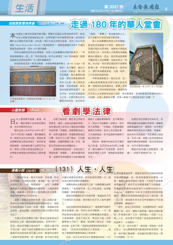 心靈絮語追蹤語言羣族教會本地歷史上最早的基督宗教活動,要算於英國佔治香港島的初年,當尚未設立教會及建造教堂之前,在軍政圈子的宗教禮儀集會;這些都是屬於非公開的內部活動。本地第一間正式成立的常規教會,是在 1844 年創辦的 Hong Kong Union Church ( 香港佑寧堂 )。這間堂會剛於本年 9 月遷回重建落成的新堂,迎向 180 週年會慶。然而若論開設恆常的公開聚會,則華人信徒羣體的活動可能更早。「中華基督教會合一堂」及「長洲浸信會」都可以溯源至 1843 年的暑期;兩間堂會都在近期先後舉行 180 週年會慶感恩。前述的佑寧堂是一間英語教會,由倫敦傳道會的教士 James Legge ( 理雅各 ) 主力籌組,協合洋人信徒一同創設。第二間英語教會,聖公會聖約翰座堂,原初主要服務政商界洋人社會。第三間英語教會,英語循道會,原初基本為服務軍旅圈子。由此可知,本地英語教會成立之初,主要目標在於牧顧既定的信徒,並非旨在「佈道」。事實上,來自歐美的人士,亦大多數早已具有基督宗教背景。華人信徒羣體的發展主旨和動態,跟這些英語教會大不相同。當那些年,英國才剛佔治香港島,宣教者才剛能長居香港工作,本地華人才剛開始有機會聽說天國福音。因此,當年那成員寥寥可數的華人信徒羣體,由起始就以「佈道」為主旨。長洲浸信會固然只能聚焦服事小島,中華基督教會合一堂的前人,幾乎成為隨後港島、九龍、新界,三片地域的佈道先鋒。中華基督教會合一堂的前源,是一小羣由倫敦傳道會的南洋福音基地回歸、操粵語的廣東籍信徒。事實上香港位於珠江三角洲東部的前端,遷移到來謀生的人口主要都來自這片地區,基本操粵語。香港的教會反映着本地的人口結構,以華人教會為主體;而華人教會又以粵語堂佔絕大多數。長洲浸信會一角 (2022 年 3 月拍攝 )中華基督教會合一堂舊堂前名牌匾 (2014 年 4 月拍攝 )第 3097 期 主曆 2023年 12月 31日(禮拜日) http://ChristianWeekly.net 生活 6看劇學法律走過 180 年的華人堂會李碧如區伯平(撰文、拍攝、繪圖)日本人懂得運用漫畫、動漫、電影、電視等媒介去推廣各種知識,是非常聰明的做法。最近在網上串流平台 Netflix 看了《石子與羽男》的劇集,看到編劇給每一集都先設定法律主題,透過故事去解釋某條法例如何執行,對民眾有甚麼規範,如何避免墮入法網而不自知,幫助人們對法例增加認識之外,亦學會怎樣透過法例保障自己應得權利。以第三集為例,講述男主角被法院委派,擔任一名被告的義務律師。被告擅自將人家辛苦十載拍成的電影改成所謂「快電影」的劇情解說放上網,結果流量甚高,對電影票房造成打擊,因為不少人看了解說,已知劇情概略,就懶得購票入場。於是,電影公司向被告提出侵權控告。這個案例相當典型。也曾在網上看過這種「快電影」,當時就覺得奇怪,這樣把本來兩個多小時的電影濃縮成十分鐘的精華解說,並不像預告片。預告片只給觀眾一些懸念,吸引你入場看戲。「快電影」把整齣電影劇情完全展現,基本上是完整故事,只欠細節描述,對只追情節的觀眾可能已經足夠。開始時,劇集中的被告並不覺得自己有錯,反而認為由於網上流量多,實為電影作了免費宣傳,很有可能推高電影入座率,導演應該感激他才是。這種歪理在現實世界多的是,而網絡侵權也的確屬於新事物。編劇透過劇集鋪陳分析,讓觀眾一步步看到侵權對創作者有多大傷害。到最後,被告終於承認錯誤,可是傷害已經造成,辛苦十載,傾盡心血和金錢拍出電影的導演意興闌珊,既沒有原諒被告,也不打算再拍電影。傷感的結局嚴正提醒觀眾,侵權——是極不道德的行為。《捨得》「真的很辛苦,幾天不能躺,不能睡,快沒氣的時候,不知道為甚麼,會想起,嗯,她平時說過的上帝,一求,就睡着啦。」去年,淑嫻帶着新婚不久的瑞士裔美國夫婿回港,上曉易家來吃飯,易媽第一次在其他人面前講述那次的事,曉易突然覺得自己特別幸福。接着,淑嫻說起她的夫婿,兩人認識之後,知道他如何饒恕曾經虐待他和母親的惡父,她就仿效他慢慢放下以前一些事。飯後,易媽拿出家庭相冊,誰料淑嫻一見她們和大舅父的舊合照就怔住了……大舅父竟是淑嫻的父親!曉易比誰都更加百般滋味在心頭。雖然她倆是表姊妹,好得不得了,但是一個非常照顧父母的孝子、一個狠心毒打孩子的父親,她至今依然在艱難地消化這件事情。舅婆早就說過他故意不讓人找到,甄瀚咫也曾託人幫她們登報尋親,卻一無所獲。如今她才相信在播放着當年威哥、威嫂把她有份合唱的詩班曲目錄成的歌集,這一直是她最寶貝的禮物。沙面,曾兩次擦身而過的小教堂,它的地下真會變成商業街嗎?她忍不住拉開書桌最下方的抽屜,那裏靜靜躺着陪伴她度過不少無聊時光的小小Walkman,旁邊那本 1998 年已經剪掉頁角的中國護照,翻開是密密麻麻的簽證和出入境印章;那一段人生,猶如當年首次在空中俯瞰的太平洋海岸線那般,蜿蜒曲折。而今,故居已形同寄居,往後還將如何?如果繼續「殺」項目,會像大衞那樣一聽見老闆的電話,手就發抖嗎?工作,值得擺上一切嗎?人生啊,人生,該怎樣才不虛度?她抬起疲倦得半合的杏眸子,十指緊扣……第二天,她又出發了。她知道,即使這一生都在路上,也以歡歡喜喜地做個安然的寄居者。這回,她打算忙裏偷閒,去給廣州的舊日室友一個大大的擁抱。 (完)大舅父的確是故意