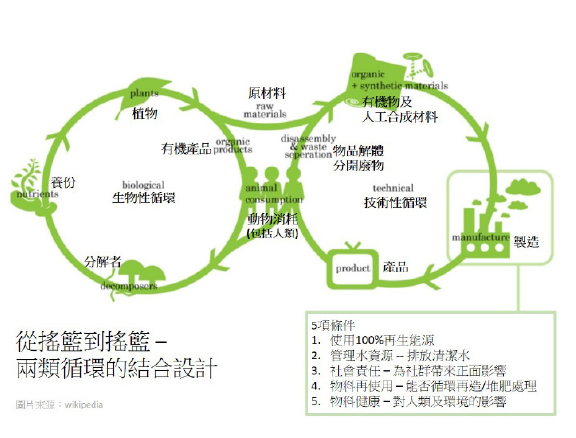 從搖籃到搖籃(Cradle to cradle)的意思,就是讓生產的原材料順利回歸它的出生地。綜合的概念就是: