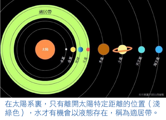 生物需要液態水來維持身體運作,水要維持液態就要在0℃至100℃之間的環境。行星的表面溫度主要由她與太陽的距離決定,綜觀全個太陽系,只有地球和火星與太陽的距離,令她們的表面溫度可讓水維持在液態。
