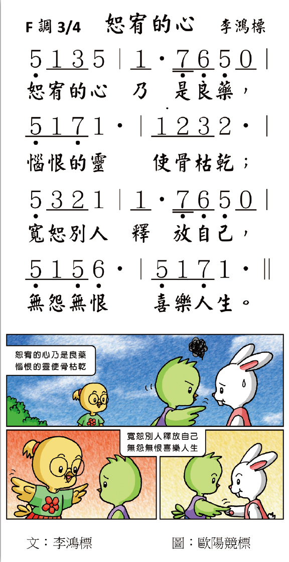 恕宥的心乃是良藥,惱恨的靈使骨枯乾;寬恕別人釋放自己,無怨無恨喜樂人生。