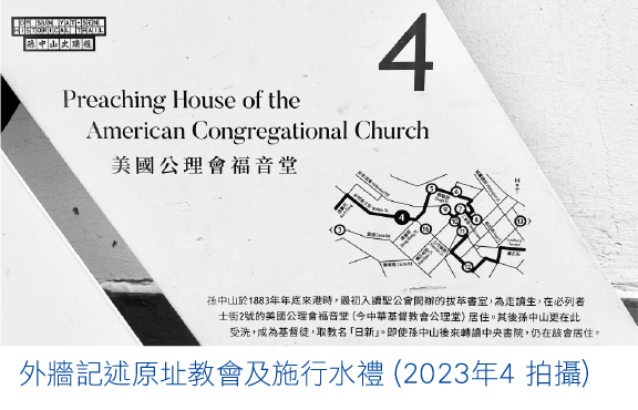 位於中環半山的「香港新聞博覽館」,是由廢置多年的必列啫士街街市改造而成。場館外牆的行人道上,豎有一個紀念裝置;原來這處是「孫中山史蹟徑」第4站,這裏最早期是美國公理會的福音堂,孫中山曾在福音堂寄住,也在這裏聽道歸信,於1883年領受水禮。紀念裝置有如一份向公眾展開的「見證單張」,讓路過行人清晰閱讀這段史蹟。