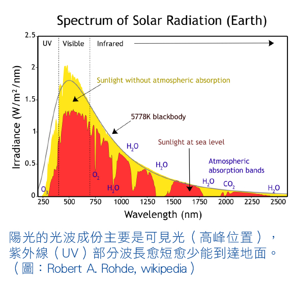 (陽)光是電磁波,包含不同波長的波段,可見光光譜(波長380nm至700nm) 讓我們看到世界的色彩,其他波長的光譜如紅外線和紫外光,有着不同功能。比可見光的波長長一點的稱為紅外線(波長780nm 至1mm),大家最熟悉的是其「攜帶訊息」功能,常用於不同電器遙控,也應用於光纖通訊中,這些是近紅外線(波長較接近紅光700nm)。 而波長較長的遠紅外線,為地球表面提供熱能。地球從太陽獲得的能量中,有超過一半是靠吸收紅外線。陽光中的紅外線配合大氣中的溫室氣體,除了令地球的溫度能保持穩定,也協助調節氣候。