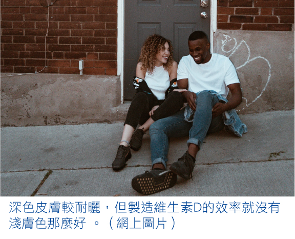 陽光裏的紫外線(UV)因應波長,可分為UVA、UVB、以及最短波長的UVC。UVB 能激發身體的皮膚細胞合成維生素D,從而協助人體的新陳代謝:活化的維他命D在小腸裏能促使鈣質吸收、維持適當的血鈣與磷濃度、讓骨頭的礦物化正常,也能預防低血鈣引起的肌肉抽搐。缺少了它,小孩會患佝僂症,成人會有骨質疏鬆。