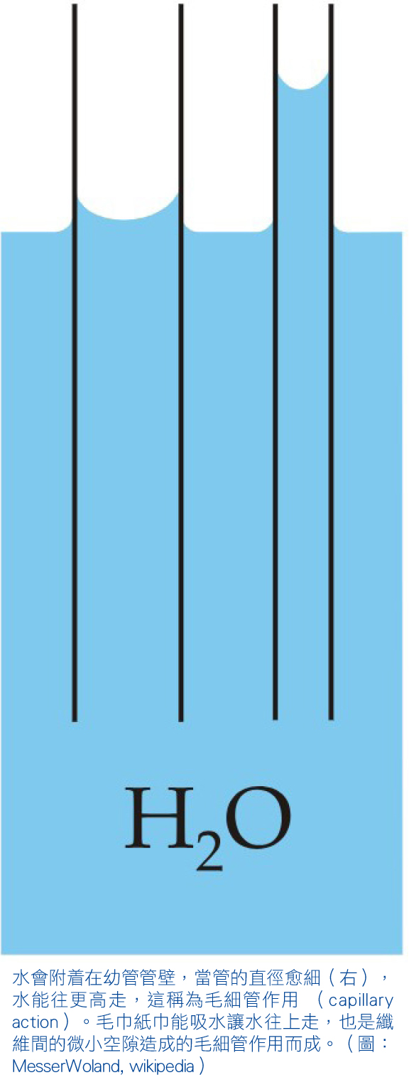 水分子(H2O)本身會緊密地彼此吸引,這種內聚力(cohesive force)會形成表面張力,平時見到在平面上形成的水滴就是靠這種表面張力來維持立體形狀,不像其他液體在平面上會散開。它們也容易與周邊環境形成微弱的吸引力,稱為附着力(adhesive force)。在管道裏液體周圍能附着管壁,當管道狹窄,能依附管壁的面積與液體的體積比例升高,液體就會自動流向管道裏,足夠令它克服地心吸力而上升,這就是毛細管作用(capillary action)。