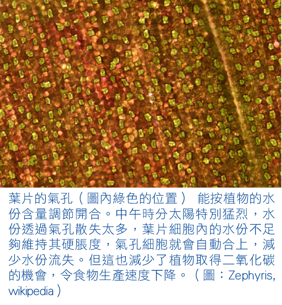 面對酷熱天氣,人類會多喝水來調節體溫。植物既不能行走,無法逃避烈日,也不像人類方式「飲水」,植物生存所需的水份從泥土而來。要令水反地心吸力向上移進植物體內,需要不同方法配合才能成事。