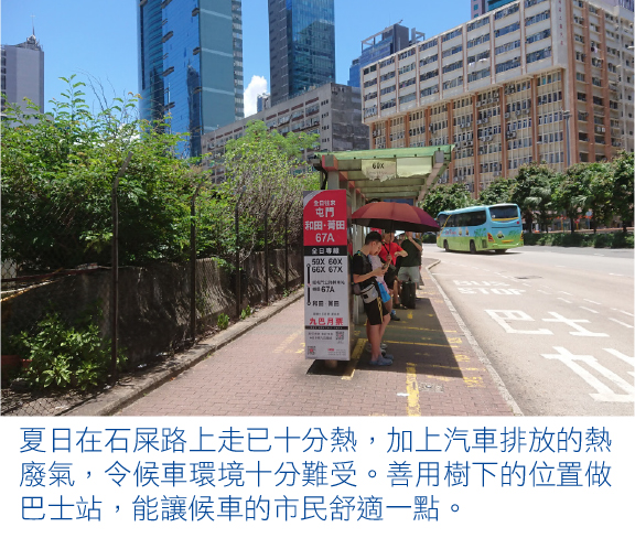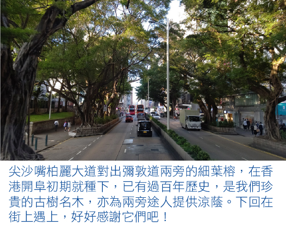 「榕樹頭下好遮蔭」。別少看植物的吸水機制,同樣是遮擋陽光,樹蔭下的溫度總比在建築物簷蓬下低,就是因為植物的蒸騰作用,吸收了附近空氣的熱力所致。水的比熱容很高,要令液態水變成氣態需要吸收很多能量。所以當樹的樹冠愈大,葉片數量愈多愈密,透過蒸騰作用形成的降溫效果愈明顯。在行人道上多種樹,除了讓空氣清新一點,也能讓附近溫度降低,協助人類遮蔭避暑。路上的樹也許佔了一些地方,但只要它們健康生長,能讓環境更宜居。