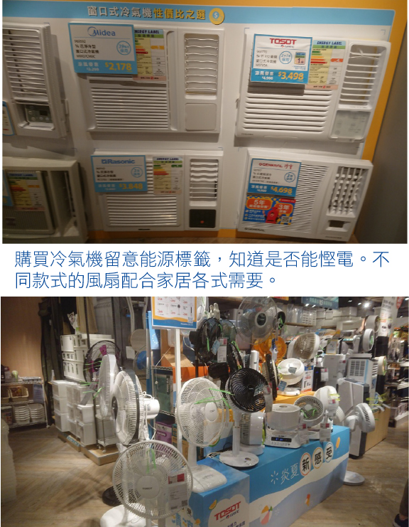 回到家居,環境狀況我們能調節,將冷氣溫度調高一、二度,配搭風扇使用,用電量減約四分之一,並且因有明顯流動的空氣,讓人感覺更舒爽。若是想要詳盡環境分析與冷氣配搭使用參考,可到消委會網站:https://www.consumer.org.hk/ 內「消費全攻略 / 懶人包」分頁,搜尋「冷氣機」,內含大量實用貼士助我們更有效使用冷氣。