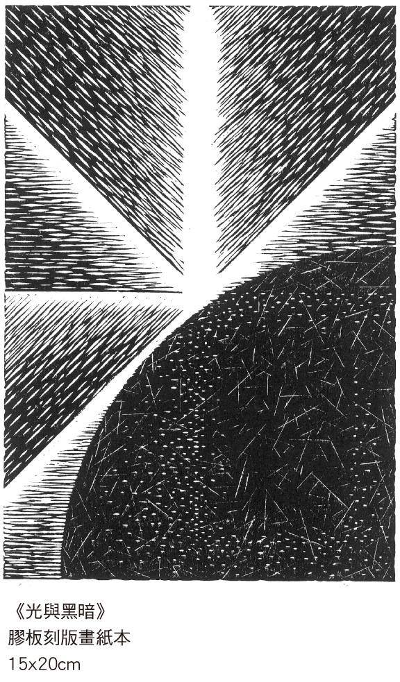 作為建築師,我對幾何圖形有着濃厚的興趣,如果在抽象的幾何圖形中能夠帶出信仰的意義,會是十分有趣的基督教藝術實驗。於是,我透過結合幾何圖形、文字以及符號,創作了一系列的版畫作品,《光與黑暗》是其中之一。
