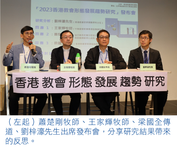香港教會更新運動研究主任劉梓濠先生發布「2023 香港教會形態發展趨勢研究」結果,量性問卷於去年11月至今年3月進行,回卷率達71%,質性訪談部分則於今年6月完成。研究發現只有三分一堂會考慮或計畫改變現行運作模式,未有發展成趨勢。惟他指出,不同堂會對運作模式有不同理解,一般理解為聚會形式改為彈性地點或分散式聚會,但有「已改變堂會」將信徒領袖的培育及社區服侍,視為運作模式改變的一部分。