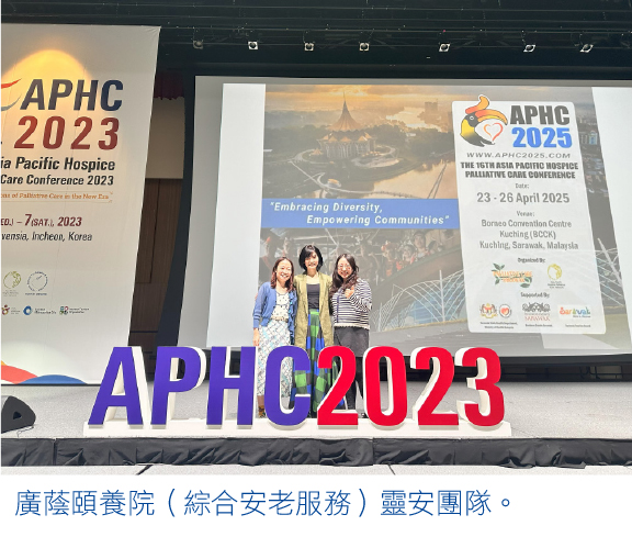 第十五屆亞太臨終關懷會議(Asia Pacific Hospice Palliative Care Conference)在韓國首爾舉行,來自27個地區,約1280位致力於晚期照顧的醫生、護士、社工、心理學家、教授等參與,而香港華人基督教聯會廣蔭頤養院(綜合安老服務)亦被邀請分享透過「靈安護理」(Namaste Care)照顧末期癌症長者的臨床經驗。