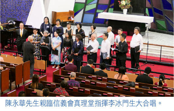 當音樂響起,李冰門生的嘹亮歌聲充滿整個聖殿,扣人心弦。凝望着聖堂彩色玻璃窗上的大型十字架,伴隨着開場歌曲〈齊來歡欣〉(Let Us Rejoice) 的大合唱,好像上主親自呼喚我們每一位同來歡欣讚美祂,但同時也好像呼喚我們:「來!安靜在主前。」原來這首歌是陳永華作曲家以李景雄牧師指定選用詩篇的內容譜出動人的樂章來記念李冰老師,歌詞正是帶出生命短暫,離別也是暫時,因着永恆盼望使我們可以在悲傷中有希望,以致我們能歡欣讚美上帝,這正正也是當年李牧師面對太太李冰老師離逝時的感受。陳先生熱愛音樂,百忙中也抽時間親臨指揮,充份展現並承傳愛心的精神和意念,李牧師在音樂會上也向陳先生親自道謝與祝福。