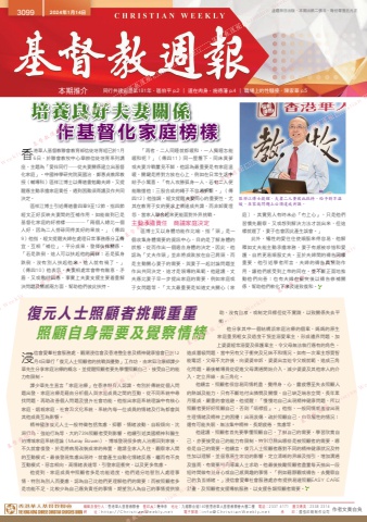編輯及發行人:香港華人基督教聯會 督印人:陸幸泉 地址:九龍聯合道140號香港華人基督教聯會大樓二樓 電話:2337 4171 圖文傳真:2338 2314網 址:http://ChristianWeekly.net 電子郵箱:[email protected] 承 印:國強印刷制作公司 作者文責自負3099 2024年1月14日 逢禮拜日出版.本期出紙二張半.每份零售五元正本期推介 同行共建迎進第181年.區伯平 p.2 ∣ 道在肉身.施德藩 p.4 ∣ 職場上的性騷擾.陳家華 p.5復元人士照顧者挑戰重重照顧自身需要及覺察情緒香港華人基督教聯會教育部信徒培育組已於1月6日,於聯會教牧中心舉辦信徒培育系列講座,主題為「愛伴同行──從夫妻關係建立出基督化家庭」。中國神學研究院莫國治.鄭惠貞教席教授(輔導科)區祥江博士以傳道書勉勵夫婦,又提醒應主動承擔家庭責任,遇到困難須商議及作共同決定。區祥江博士引述傳道書四章9至12節,指四節經文正好反映夫妻間的互補作用,如能做到已是基督化家庭的好榜樣────「兩個人總比一個人好,因為二人勞碌同得美好的果效。」(傳四9)他指,經文提醒夫婦在處理日常事務應分工得宜,互相「補位」,平分成果,發揮伙伴關係。「若是跌倒,這人可以扶起他的同伴;若是孤身跌倒,沒有別人扶起他來,這人就有禍了。」(傳四10)他表示,夫妻相處常會帶有敵意、矛盾,又或敷衍回應,事實上夫妻支援主要着重解決問題及情感兩方面,幫助他們彼此扶持。浸信會愛羣社會服務處、觀潮浸信會及香港整全普及精神健康協會已於12月4日舉行「復元人士照顧者的挑戰與優勢」工作坊,由家庭治療師譚少華先生分享家庭治療的概念,並提醒照顧者要先學懂照顧自己,接受自己的能力有限制。譚少華先生直言「家庭治療」在香港鮮有人認識,有別於傳統從個人問題出發,家庭治療是藉由分析個人與家庭成員之間的互動,從不同系統中尋找問題,再助改善個人問題及提升社會功能。他指出家庭系統理論中有核心家庭、姻親家庭、社會及文化系統,系統內每一位成員的情緒及行為都會與其他成員互為影響。精神健康復元人士一般特徵包括焦慮、抑鬱、情緒波動、自殺傾向、沈溺行為、強迫行為等,大約73%照顧者受到影響。他續引述美國精神科醫生的博域家庭系統理論(Murray Bowen),博域發現很多病人治癒回到家後,不久就會復發,於是將病房改裝成家的佈置,邀請全家人入住,觀察家人間的互動模式。最後發現焦慮出現時,就會產生自動化情緒反應,繼而有不良互動模式,惡言相向、高情緒表達等,引發家庭衝突,以及更多焦慮。他提到,家庭成員中照顧者多是功能過度,他們過分地替別人處理事情,特別為別人而憂慮,認為自己比他們更理解他們的需要;而被照顧者多是功能不足,比較少為自己應負責任的事情,期望別人為自己的事情提供協「再者,二人同睡就都暖和,一人獨睡怎能暖和呢?」(傳四11)同一屋簷下,同床異夢或夫妻冷戰屢見不鮮,他認為最重要是有家庭溫暖,關鍵是將對方放在心上,例如在日常生活中給予小驚喜。「有人攻勝孤身一人,若有二人便能敵擋他;三股合成的繩子不容易折斷。」(傳四12)他強調,經文提醒夫妻同心的重要性,尤其在教育子女的要求上須達成共識,而非卸責埋怨,當家人聯合起來更能面對外界挑戰。主動承擔責任 商議家庭決定區博士又以身體功能作比喻,指「頭」是一個收集身體需要的資訊中心,目的是了解身體的狀態,從而作出一個適合身體的決定。因此,他認為「丈夫作頭」並非將成敗放在自己肩頭,而是主動關心妻子的需要,與妻子一起討論問題並作出共同決定,這才是領導的風範。他建議,丈夫應比妻子早一步提出家庭的需要,例如家庭或子女問題等,「太太最重要是知道丈夫關心(家庭),其實男人有時未必『冇上心』,只是他們習慣先觀察,又或想到解決方法才說出來,但這樣就遲了,妻子也會因此產生誤會。」此外,犧牲的愛往往使順服來得容易,他解釋如丈夫能主動承擔家務,妻子有感被珍惜和愛護,自然更易順服丈夫。至於夫婦間的禱告同樣重要,他引述學者所言,夫婦的禱告具預防作用,讓他們感受到上帝的同在,並不斷正面地推動他們向善;也有夫婦在衝突後以禱告修補關係,幫助他們軟化下來及達致復和。培養良好夫妻關係作基督化家庭榜樣區祥江博士提醒,夫妻二人要彼此扶持,給予對方溫暖,在家庭問題上必須達成共識。助,沒有目標,或制定目標但從不實踐,以致關係失去平衡。他分享其中一個結構派家庭治療的個案,媽媽的原生家庭重男輕女及過度干預並溺愛案主,形成邊界問題,加上婆婆經常溺愛及保護案主,令父母無法執行應有的角色,造成層級問題,當中另有父子衝突及兄妹不和情況。如有一次案主想買智能電話,父母不允許後,向婆婆申訴,婆婆出言迫令父親就範,造成三角化問題。最後輔導員從促進父母溝通開始介入,減少婆婆及其他家人的介入,定立界線、去三角化。他續言,照顧者很容易同情耗盡,覺得身、心、靈疲憊至失去照顧人的熱誠及能力,只有不斷地付出憐憫及關懷,自己缺乏喘息空間,長年累月積成,嚴重的會逃避。他提醒:「慢慢地自己出現精神健康問題,所以照顧者要好好照顧自己,否則『唔襟捱』。」他指,一般同情耗盡會出現生理情緒及精神上的困擾;出現哀傷、疏於照顧自己、自我犧牲的情況;還有可能失眠、無法集中精神、長期疲倦、焦慮等。他建議,照顧者首先要學懂