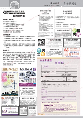 第 3099 期 主曆 2024 年 1 月 14 日(禮拜日) http://ChristianWeekly.net 廣 10告歡欣僱傭嚴格挑選菲印傭工適合不同家庭需要提供專業顧問服務經驗豐富服務真誠查詢21558177新新工程承接水電油漆泥水各項裝修工程取價公道歡迎教會及主內肢體電90819077免費報價陳弟兄誠聘總幹事總幹事入職條件:1. 牧師或信徒領袖均可;2. 神學學位及大學學位;3. 十年以上之牧會或教會聯合事工經驗;4. 熟識本聯會之組織與事工;5. 具行政、財務及人事管理之經驗;6. 能獨立處理一切中英文書信及文件;7. 能操流利粵語、普通話及英語。總幹事職責:1. 遵照本聯會會章所定之宗旨,推動及執行本聯會會議決定,處理本聯會一切事工,審定聯會發出之一切書信文件。2. 領導及督導本聯會屬下受薪員工,有效履行其職責及推動會務。3. 須出席本聯會會議及活動,或須代表聯會出席機構及堂會重要慶典,即使不在例常辦公時間之內,仍應屬其工作職責及工作時間。應徵辦法:應徵者請親繕申請函,附履歷及期望待遇,並撰寫一篇不多於2000字文章,表達對香港華人基督教聯會未來發展及抱負;連同諮詢人等資料,於二零二四年一月十五日前,寄九龍聯合道一百四十號香港華人基督教聯會大樓,香港華人基督教聯會主席親啟,信封請註明〔應徵總幹事〕,合則約見。所有應徵函,均予保密處理。倘於二零二四年二月二十九日前仍未予約見者,則其申請視作不被接納論。(資料只作招聘用)平民映室收費特平室內燈光人像,專拍親子、畢業、婚紗、情侶及家庭相,包修圖,收費由$399至$1299。請到facebook欣賞作品。預約/查詢98776368(whatsapp)主內兄姊9折優惠。 香港聖公會聖保羅堂誠聘助理行政幹事職責‧ 負責日常行政文書工作,包括:接聽電話,資料輸入,文件整理及存檔,信件分發,辦公室及本堂用品採購等。‧ 負責每週週刊編制及資料輸入‧ 協助本堂相關的事務工作職位要求‧ 有良好中、英書寫能力‧熟悉電腦操作,中文輸入法及Microsoft Office軟件應用(Excel、Word、PowerPoint)。尤其Publisher軟件應用會優先考慮。‧ 具良好溝通技巧、組織能力、團隊精神及能獨立處理工作‧ 性格開朗,好學及有耐性合適及有意者請連同申請信,詳細履歷及要求待遇電郵至[email protected]。本堂提供僱員福利包括醫療計劃,年終雙糧及在職培訓。中華便以利會誠聘香港仔堂聘傳道應屆神學畢業均可幹事中學畢業電腦文書多媒體製作會計經驗週六日當值履歷[email protected]或寄九龍油麻地砵蘭街90號地下人事部招聘用中華便以利會誠聘筲箕灣堂聘傳道神學畢業負責小型教會牧養。福音幹事主力福音事工兼行政文書事務。履歷蒙召見證寄[email protected]或油麻地砵蘭街90號人事部收招聘用中華便以利會誠聘長洲堂招聘半職幹事中學畢業熟電腦文書有事奉心志能獨立處理教會行政事務週六日上班履歷[email protected]或九龍油麻地砵蘭街90號地下人事部收招聘用生命河浸信會按立牧師典禮生命河浸信會將於一月二十八日(主日)下午三時,假香港七姊妹道一百八十號地下鰂魚涌浸信會舉行鄭雪凌傳道按牧典禮。按牧團成員包括曹偉彤牧師 鄺振華牧師 李國雄牧師黃浩興牧師 鍾惠瑜牧師 收報人:姓名/名稱:_______________________________________________________電 話:_______________________________________________________地 址:__________________________________________________________________________________________________________________________訂閱者簽名:__________________________ 日期:_____________________□新訂 □曾經訂閱 □續訂(訂戶編號:_______________________)◆ 請填妥訂閱單,選擇以下方式繳款: 1. 銀行入帳(中國銀行戶口號碼:012-677-1-015286-9)(帳戶名稱: 香港華人基督教聯會),請連同訂閱單及入數紙傳真或電郵至本報。 2. 轉數快(中國銀行:快速支付系統識別碼:160278230)(帳戶名稱:The Hong Kong Chinese Christian Churches Union),留意付款人過數後,必須提供轉數文件副本傳真或電郵給本報,以供核實及開收據之用。 3. 郵寄支票(支票抬頭請寫:香港華人基督教聯會),並連同訂閱單寄回本報辦事處:香港九龍聯合道140號香港華人基督教聯會大樓。 4. 親臨本報辦事處付款。訂閱單一年52期(零售每份HK$5)其他類別:1. 大量訂閱:本港團體訂戶(十份或以上) 七五折;(二十份或以上) 六折。2. 海外訂戶:報費八折+郵費;(長者/神學生/學生)*:報費半價+郵費。*須出示有效證明地址:香港九龍聯合道 140 號香港華人基督教聯會大樓 電話:2337-4171 圖文傳真:2338-2314 E-mail: [email protected]訂閱費本地(原價 $480)一般優惠價$380長者/神學生/學生 * $240中國、澳門、台灣地區 (平郵原價 $495;空郵原價 $770)一般優惠價 平郵$440空郵$700長者/神學生/學生 * $365 $630教會物業待售深水埗青山道二樓全層,建築面積2350平方呎,適合教會聚會、機構辦公或提供社區服務用途,售價一千五百五十萬元,有意請電25280186。 Christian Weekly 總幹事職責:基督教週報5. 具行政、財務及人事管理之經驗;6. 能獨立處理一切中英文書信及文件;7. 能操流利粵語、普通話及英語。Christian Weekly 3. 十年以上之牧會或教會聯合事工經驗;4. 熟識本聯會之組織與事工;5. 具行政、財務及人事管理之經驗;基督教週報 Christian Weekly 香港聖公會聖保羅堂誠聘助理行政幹事職責基督教週報主曆 2024 年 1 月 14 日 Christian Weekly第 3099 期 (禮拜日)Christian Weekly (資料只作招聘用) 基督教週報約見。所有應徵函,