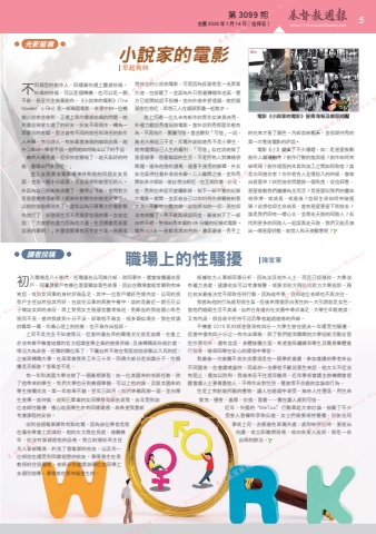 第 3099 期 主曆 2024 年 1 月 14 日(禮拜日) http://ChristianWeekly.net5不同類型的創作人,同樣最怕遇上靈感枯竭。枯竭的時候,可以是個轉機,也可以是一蹶不振,甚至完全放棄創作。《小說家的電影》(The Novelist’s Film) 是一部韓國電影。故事中的一位暢銷小說家金俊熙,正遇上寫作靈感枯竭的問題。她到書店探望久違了的好友,好友不再寫作,轉為一間書店的老闆。書店會有不同的前任和現任的創作人共聚,有老詩人、有放棄當演員的咖啡店員,她在工餘時,學習手語。金問她如何做出以下的手語:「雖然天還亮着,但很快就變暗了,趁天氣好的時候,盡情出門享受吧。」金又去跟舊友電影導演朴和他的同居女友見面,金是一個十分認真,又容易感到被冒犯的人。朴認為自己的風格改變了,變得很清新。金問對方是甚麼變得清新呢?原來朴對製作的態度改變了。以前的強迫感消失了,當年以為只要專注於電影製作就行了,卻發現生活不是甚麼容易的事。女友也說:「大家都在盡力而為地活着,生活哪會是甚麼容易的事啊!」朴重提舊事有否令金生氣。朴原本想按金的小說拍電影,可是因為投資者是一名黑幫大佬,也就罷了。金認為朴只想着賺錢和名氣,雙方已經開始話不投機。金向朴借來望遠鏡,她把鏡頭愈拉愈近,即想三人在鏡頭那邊一起散步。路上巧遇一位久未有新作的青年女演員吉秀,朴極力勸說秀復出拍電影。當朴說到秀那麼年輕有為,不再拍片,實屬可惜。當金聽到「可惜」一詞,無名火頓起三千丈,斥罵朴該知道秀不是小學生,她有選擇自己人生的權利,「可惜」似在說她做了甚麼錯事、過着錯誤的生活,不是所有人對賺錢感興趣。連珠炮發的謾罵,連番不接受的解釋,朴女友也氣得拉着朴急說告辭。二人離開之後,金和秀開始多次傾談,彼此想法相近,也互相欣賞,於是,金、秀和拉來姪兒當攝影師,拍下一部平實的紀錄片電影。期間,金反省自己以前的寫作感覺被刻意誇大,不斷地小題大做,自信感知的一切,現在卻沒有感覺了。秀不斷點頭認同金,最後拍下了一部自然不過,發揮出秀本質的 45 分鐘的紀錄式電影。電影《小》一直都是黑白色的,畫面最後,秀手上小說家的電影早起鳥林光影留痕電影《小說家的電影》宣傳海報及劇照組圖的花束才著了顏色。內部首映那天,金很期待秀的第一次看這電影的評語。電影《小》提出了不少議題,如:是甚麼推動創作人繼續創作?創作行動的進與退?創作如何突破瓶頸?創作過程的本真和加工之間如何取捨?誰是志同道合者?合作者各人全情投入的時候,會做出甚麼來?試把這些問題換一個角度,從信仰看,甚麼推動我們繼續為主而活?是甚麼叫我們的靈命或停滯、或成長、或退後?信仰生命如何突破瓶頸?若想信仰生命成長,當有甚麼要留下和捨去?誰是我們同有一樣心志,並肩走天路的同路人?若找到更多的同路人一起認真走天路,我們又能否演出一場甚麼好戲,給世人和天使觀看呢?初入職場是八十年代,任職廣告公司媒介部,除同事外,還會接觸廣告客戶,同事及客戶有幾位喜愛聽談黃色故事,因此在職場會經常聽到有味笑話,或對女同事的身材評頭品足,其中一位客戶嗜好色情內容,公司的男客戶主任自然投其所好,在談完公事的商務午餐中,談的是最近一期花花公子雜誌女郎的身段,席上對男女生殖器官露骨描述,對鄰座的我這個小角色視而不見。當時我感到十分不安,卻敢怒不敢言,很多類似場合,我在背誦詩篇第一篇,作爲心理上的抗衡,也不敢作出投訴。上司不是完全不知道情況,但當時廣告界的職場文化就是這樣,社會上亦沒有像平機會這樣的官方組識宣傳企業的道德界線;及後轉職政府統計處,情況大為改善,任職的職位高了,下屬自然不敢在我面前說些難以入耳的話;之後再轉職大學,在高等教育界工作三十年。同儕大部分是知識分子,性騷擾是否絕跡?答案並不是。有一年和美國大學合辦了一個暑期課程,由一位美國來的老師任教,除了他帶來的學生,我們大學也分到幾個學額,可以上他的課,及跟美國來的學生接觸交流。第一年效果不錯,翌年三四月,我們準備再辦一屆,並向學生宣傳。這時候,收到已畢業的女同學發電郵告訴我,去年受到該位老師性騷擾,擔心這屆學生亦有同樣遭遇,故希望我重新考慮課程的安排。收到這個電郵讓我有點吃驚,因為該位學者是我在廣告學會上認識的,他的太太我也見過,接觸幾年,從沒有懷疑過他的品格。我立刻通知系主任及人事部職員,約見了發電郵的校友,以及另一位相信也遭受到同樣經歷的校友。事情發生在男教授的住宿賓館,老師分別邀請該兩位女同學上去個別指導。事情就在那時候發生的。根據校方人事部同事分析,因為涉及校外人士,而且已經離校,大學沒有權力查處,建議校友可以考慮報警,或要求校方寫信向對方大學投訴。兩位校友最後決定不採取任何行動。因為這件事,我和這位老師也不再交往。我曾為他的行為感到很生氣,但後來慢慢明白男性的一大引誘就是女色。當他們婚姻生活不美滿,自然往身邊的社交圈中尋求滿足,大學生年輕貌美,又有內涵,很容易令把持不定的學者越過道德的界線。平機會 2019 年的調查發現有四分一大學生曾在過去一年遭受性騷擾,但當中僅有四十分之一有作出舉報,除了我們經常聽聞的大學迎新活動含冒犯性環節外,還有言語、身體接觸方面。希望當局繼續和學生及職員