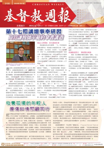 編輯及發行人:香港華人基督教聯會 督印人:陸幸泉 地址:九龍聯合道140號香港華人基督教聯會大樓二樓 電話:2337 4171 圖文傳真:2338 2314網 址:http://ChristianWeekly.net 電子郵箱:[email protected] 承 印:國強印刷制作公司 作者文責自負3100 2024年1月21日 逢禮拜日出版.本期出紙二張半.每份零售五元正本期推介 觀點與立場.陸輝 p.2 ∣ 退一步開創本土宣教.區伯平 p.6 ∣ 高雅睡袍歡送會.麗群 p.7香港華人基督教聯會傳道部同工組已於1月8日,在聯會禮堂舉辦第十七期「講壇事奉研習」第一講。建道神學院副院長高銘謙牧師以約拿書示範講道,指約拿書特別之處是記載先知的「不聽命」,更刻意描述風、海和水手都聽命於上帝,以此揶揄約拿,同時讓讀者知道上帝是全地之主。「起來,到尼尼微大城去,向其中的居民宣告,因為他們的惡已達到我面前。」(拿一2)高牧師引述聖經原文指,上帝對約拿主要有三個命令,分別是「起來」、「行走」及「宣講」,這是呼籲悔改的格式,以致上帝的懲罰不會臨到尼尼微身上。他表示,約拿心知肚明這是先知的任務,然而他卻沒遵從上帝的吩咐,逃往尼尼微相反方向的他施去躲避耶和華。描述人與環境 經文諷刺約拿 高銘謙牧師以原文解釋,「大」字是整部約拿書主題所在,例如經文多處提到大城、大風、大大懼怕、大大敬畏、大魚等。「在上帝計畫中,所有『大』的東西都聽命於祂的吩咐:包括大魚、罪惡滿盈的大城,外邦人水手也大大敬畏祂……這一切都顯出上帝在外邦、全地坐着為王。」由此可見,上帝能折服任何人和環境,經文如此描述是為了凸顯全世界,只有約拿一人不聽命。他續言,經文更透過描述約拿身邊的人,諷刺其「不聽命」。「船長到他那裏,對他說:『你怎麼還在沈睡呢?起來,求告你的神明,或者神明顧念我們,使我們不致滅亡。』」(拿一6)水手叫約拿「起來」和「求告」(即宣講的意思),這動詞正是昔日上帝對約拿的命令,經文諷刺地使用水手重複了上帝對約拿的吩咐,提醒其要聽命。他又指,聖經原文提到海正在「行走」及「暴漲」(拿一11、拿一13),「經文進一步說,連海都懂得『行走』,像是諷刺約拿連海都不如,約拿正是那位與海和外邦人行相反路向的人……所以整個第一章就是揶揄和諷刺約拿不走上帝的方向。」高牧師表示,「敬畏/懼怕」、「拋」等詞在第一章多次出現,例如記載當上帝拋下大風時,外邦人的水手便大大懼怕,但約拿竟仍在沈睡,外邦人的反應與約拿成了強烈對比。當水手們問約拿的身分時,約拿並無承認自己是先知,甚至後來水手將約拿拋進海裏,海的狂浪就平息了,但水手們竟對此現象比刮大風更懼怕。「可見外邦人對上帝敬畏的程度,來得遠比約拿更快更大。」他強調,作為先知的約拿,本來應對上帝產生敬畏及懼怕,現在卻由外邦人水手帶來另類諷刺──原來上帝的僕人不懂懼怕,反而外邦人曉得。研讀聖經原文 釋經緊扣焦點他指,是次講道示範的主題為「宣教」,以上經文道出人在宣教前,經常會躲避耶和華的面,違反祂的命令。但上帝會透過許多人、事或大自然氣象的「聽命」去映襯人的「不聽命」,說明上帝偉大的訊息。此外,經文也提醒教牧同工,要在上帝前謙卑學習,不要像約拿般對上帝的命令反應遲鈍;也不要只顧休閒睡覺,忘記敬畏上帝。高牧師遂分享預備講章心得,他建議大家可嘗試原文翻譯聖經,過程中自然會觀察到經文中一些重複的字詞,再作字義分析,慢慢便會發現字詞背後更深層的意義。除了觀察外,他坦言預備講章最花時間是思考「主點」,這視乎同工是否具備「概念化」的能力:「見到一段經文,嘗試用一句說話概括其意思,然後將這句說話重構,這就是你(講章)的主點標題句。」另外,他強調講道目的是教導和改變生命,所以講章所有釋經和例子都要朝向同一焦點,緊扣講章信息,故不少經文細節可以忽略,毋須多作講解。牧養孤獨的年輕人療傷知情關顧同行第十七期講壇事奉研習高銘謙牧師示範約拿書講道高銘謙牧師以約拿書示範講道,提醒講章所有釋經及例子,均須朝向同一焦點。近年學童自殺率趨升引起關注,建道神學院教牧及信徒領袖學院已於去年12月29日舉辦「危機突襲到我家」公開講座,由該院輔導系副教授劉佩婷博士擔任講員,她分享可用「療傷知情靈性關顧」牧養策略與年輕人同行。劉佩婷博士談到有人說「孤獨」是種流行病,但她則說:「孤獨不是病,而是成長必經階段。」她認為人必須要經歷獨自思考沈澱的時間,而深化和強化現有關係則有助減少孤獨感。她指出,年輕人一般比較敏感,其孤獨感主要來自於與自身的關係、與他人的關係。她續言,早期成長的負面經驗,如與父母缺乏安全穩妥的關係、低自尊感、被排斥或欺凌都會影響深遠,而孤獨感長遠會威脅到精神健康,造成情緒困擾、社交焦慮、身體障礙等問題。她坦言,在今日高標準的社會中,做不到要求好像等於失敗,特別是正踏入成年階段,他們既知道不再是小孩,但父母能否視他們為成年人,對他們都是一大掙扎,因為他們仍需倚賴父母,而財政責任便是其中一環。他們認為當成年人有很多責任和顧慮,於是不想長大,也選擇不分享內心感受,嘗試逃避令人煩擾的思想和感受,亦怕父母對他們感到失望而更加退縮。長期孤獨源於未能夠與身邊人深入地、親密地連繫,她直言:「有些父母將子女當成Object(物體),造成