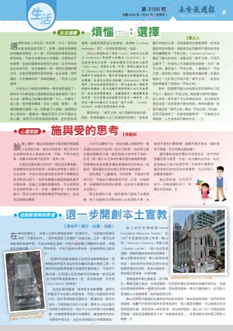 選擇對很多人來說是一件好事。今日,我到街市買食物就感受到了。查實,超級市場標榜的包羅萬有都是一式一樣,不同超級市場買的貨品都很相似,不會令消費者有太多驚喜。消費者似乎有選擇,但這些選擇都是被預先安排,反而街市的貨品有其特色,甚至會嚇你一跳。我們對選擇的嚮往時,也會因要選擇而感到煩惱,甚至疲倦。我所講的,不是購物時的「選擇困難症」,而是人生的選擇。父母為孩子挑選合適學校一事就傷透腦筋了。要按孩子的學習能力選擇還是按社會期望呢?孩子長大後,要聽自己的聲音還是聽「大人」的聲音?成人後,他們要就職業、交友(結婚、離婚)、興趣等範疇中選擇。這一切都會令人煩惱。選擇牽涉個人準則外,還要有一顆能忍受生活中不確定性的心靈,接受不太好或錯誤的選擇,並有勇氣再選擇。就着因選擇產生的煩惱,海德格(Ludwig Heidegger)寫了一段很有意思的話。他說,從他人那邊取走了煩憂(care)而將自己的關注(concern)放到那人的職分(position)上,這就是為他人代勞。這樣的關懷乃是為他人接管(take over)其關注之事,於是,那個人被迫失去了(thrown out)他自身的職分,讓他從已經涉入的事件中向後退回,轉而等待接收已經被處理完成的事務,或者完全將自身抽離(disburden)那個事件。在如此的關懷情形下,那人遂成為一個被宰制者和依賴者,甚至這種宰制對那個人而言是無聲的,並且是持續潛藏的。這種關懷是一種遠離煩憂的代勞,它以更廣泛的範圍決定着另一個存有,並且是一種以附屬的方式成為「應手之物」(readyto-hand)之關注型態的極至表現。簡單來說,「應手之物」指已預備和安排的事,例如,用煮食爐的人以工具價值來認識它,這煮食爐只有指向之意。但當燒飯者在燒飯期間,這煮食爐竟然沒有發熱,燒飯者因此而覺得不順利就將這煮食爐轉變為「手前之物」(present-at-hand),嘗試了解它的特性。煩憂是因「應手之物」不再可以應手了。究竟找人代勞處理我的煩憂、另找「應手之物」還是進入「手前之物」?選擇進入「手前之物」就是親力親為,認識這煮食爐結構,並嘗試維修它。它於我已不再只是「應手之物」,更是有我的煩憂留下痕跡的「手前之物」。原來,因選擇而產生的煩惱就是拒絕將自己假手於人,嘗試以「手前之物」態度看待我們所遭遇,投入其中、思考當下可以和應該如何,並以勇氣和責任迎接「世界原來不像你預期」帶來的震盪。煩惱不會因從「應手之物」轉為「手前之物」而消散,反而可能增添了,但煩惱提醒我們,「不像酒店泊車服務,人生沒有或不應有代泊」。心靈絮語追蹤語言群族教會▲崇真會救恩堂 (2014 年 4 月拍攝 )▲韓山明牧師葬於黃泥涌「香港墳場」(2016 年 7 月拍攝 )第 3100 期 主曆 2024 年 1 月 21 日(禮拜日) http://ChristianWeekly.net 生 6活煩惱(二):選擇 施與受的思考 退一步開創本土宣教臉書上讀到一篇以四屆奧斯卡影后嘉芙蓮協賓之名寫的文章,無法分辨真偽,網上常有旨在吸睛假借名人發表的文章,不過,不管作者是誰,這篇文卻的確引起思考,值得一談。文章記述嘉芙蓮少年時代,跟爸爸去看馬戲,排隊購票時留意到前面一家兩夫婦帶着八個孩子也在排隊。作者仔細地描述那些穿得不算體面但乾淨整齊的孩子,如何有教養地兩個兩個拖着手安靜排隊,從臉上流露的興奮神色,可以猜想那該是他們的第一次。然後,戲劇性地,來到售票窗口,那位父親才知道票價超乎他的能力,他沒有足夠錢去購票。大家可以續寫下去。相信多數人都猜得到,嘉芙蓮的爸爸詐作拾得一張廿元鈔票,告訴那正處於尷尬兩難的父親,錢是他從口袋中掉下來的。於是,那一個十口之家終於歡天喜地進場看馬戲,而慷慨的爸爸和嘉芙蓮就滿懷愉悅地回家去。結論是:嘉芙蓮從此明白施比受更有福的道理。這是典型「心靈雞湯」式的故事,不能說它寫得不好,不能說它講的道理不對,只是,仔細思考,卻總覺得有點過分矯情,以致有欠真實和失去說服力。那位狼狽的父親,既然要帶八個孩子去看馬戲,對入息僅夠日常開支的人必是頭等大事,沒在歐洲的歷史上,由第十五世紀發展起來的「航海年代」,也是歐洲見識全球的「大發現年代」;其中包括除了古遠的「絲綢之路」之外,還可以由海路重新連通中國。可是由明朝至清朝,中華帝國都實行閉關拒外政策。中國直至在鴉片戰 爭中敗落,才被英國佔治香港島,並被逼開放五處港口。這個年代的歐美教會正值普世宣教運動潮起,逐漸開放的中華大地自然成為矚目的龐大傳道工場。守候多年的倫敦傳道會及美國浸信會的教士,可說是行動先鋒,分別建立起香港最早初的教會;就是延展至今的中華基督教會合一堂、長洲浸信會、及英語 Union Church ( 佑寧堂)。這些先鋒的奮進,喚來更多宣教羣體。他們大多數並不志在細小的香港島,而是心向廣袤的中華大地。由於香港島被英國佔治,要建設成一個英式城市,又具有較大的洋人社會;看來洋人在此處生活相對方便和安全。因此不少志向中華大地的傳道會,亦會選擇香港島作為踏腳石,讓宣教者先來此地學習中華文化,並且在香港島設立後援辦事處。道理不事先打聽票價,儲夠所需才前去,臨時發現不夠錢,是否有點自製悲劇?嘉芙蓮的爸爸很體貼地把錢送出,施予時相當顧及對方感受。不過,如此體貼的爸爸,為何卻忽略自己孩子的感受呢?為甚麼不讓嘉芙蓮和爸爸仍然有足夠金錢購