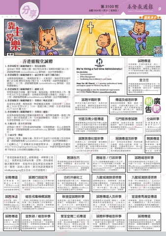 第 3100 期 主曆 2024 年 1 月 21(禮拜日) http://ChristianWeekly.net 分 9享 靈風漫步香港靈糧堂誠聘1. 香港靈糧堂 ( 銅鑼灣總堂 ) - 牧兒部部牧道學碩士畢業,積極主動,制訂牧兒部事工策略和相關行政工作。請繕履歷電郵 [email protected] 陳牧師,並註明應徵職位。2. 香港靈糧堂 ( 銅鑼灣總堂 ) - 福音幹事 ( 兩年全職合約 )支援教會推動線上 / 數碼創意事工、文案設計,協助管理及運用網上社交媒 體和其他電子媒介等 。大專畢業,具神學裝備優先,須週六、日上班。請繕履歷電郵 [email protected] 陳牧師,並註明應徵職位。3. 香港靈糧堂 ( 銅鑼灣總堂 ) - 總務主任管理教會影音設備、樓宇保養、場地設施,督導堂務員工作,懂中英文打字及文書處理,具物業管理相關文憑優先,須週六、日上班。請繕履歷電郵[email protected] 陳牧師,並註明應徵職位。4. 香港靈糧堂 ( 銅鑼灣總堂 ) - 堂務員 ( 晚更清潔 )負責堂址清潔、場地佈置、物資搬運及雜務、定時巡樓。工時由晚上 9:30 至翌日早上 7:30,逢週日晚上例假。有意者請致電 25774216 羅主任。5. 香港靈糧堂 ( 銅鑼灣總堂 ) - 堂務員 ( 維修 )負責教會場地設施定期檢查維修保養、處理緊急維修、跟進工程項目、執行其他指派工作,有相關經驗優先,須週六、日上班。有意者請致電 25774216 羅主任。6. 大埔分堂 - 堂主任兼校牧道學碩士畢業,具牧會或校牧經驗,有開創精神,有心志發展學校堂會,請繕履歷電郵 [email protected] 陳牧師,並註明應徵職位。7. 大埔分堂 - 傳道道學碩士畢業,積極主動,對青少年及成年人的牧養工作有使命感,請繕履歷電郵 [email protected] 陳牧師,並註明應徵職位。( 上述職位之「主要職責及詳細資歷要求」,請瀏覽本堂網頁 http://www.lingliangchurch.org/Facebook。申請者所提供的資料將予保密及 只作招聘有關職位用途。)全職幹事中學畢業熟文書軟件及PPT。繕歷[email protected]海怡浸信教會招聘用全職傳道神學畢業,牧養成人及青年。繕歷[email protected]海怡浸信教會招聘用誠聘半職幹事熟中英文輸入軟件操作,負責任感,週日當值,履歷寄宣道會坪洲堂離島坪洲永興街23號宣道會坪洲堂梁傳道招聘用 堂主任中華基督教會海南堂聘堂主任(牧師或宣教師),七年或以上牧會經驗。牧養教導、堂校合作、領導策劃。履歷電郵至[email protected](資料只供招聘用)誠聘傳道神學畢業,主責牧養長者、成人、婦女及兒童事工,主動熱誠牧養關懷具團隊精神。履歷寄上環蘇杭街91-97號東利商業大廈三樓上環浸信會執事會收只作招聘用屯門區教會誠聘半職幹事,負責日常文書、熟悉電腦操作、會計入帳等職務。有意請電郵履歷至恩景堂[email protected] 安排約見。「招聘用」 聘請傳道牧養兒童青少年,神學畢業。履歷[email protected]基督教恩臨堂黎生收,招聘用誠聘教會社區幹事具事奉心志、成熟勤奮,重視團隊、熟電腦操作懂網頁或剪片更佳,獨立處理文書。負責社關服務需週六日工作。請寄[email protected]新生命浸信會招聘用 聘請告示香港聖樂促進會誠聘總幹事及培訓總監,有關職責、要求及詳情,請瀏覽本會網頁www.hkchurchmusic.org或查詢35902835,請繕履歷[email protected]招聘用 誠聘福音幹事於駐校教會協助青少年福音工作,月薪17K-20K,有意者詳列履歷電郵[email protected]或郵寄石籬邨梨貝街6號中華傳道會安柱堂署理堂主任收。(資料只作招聘用) 誠聘傳道負責兒童、婦女、少年牧養教導。請繕履歷[email protected]深井靈光堂人事小組招聘用九龍城潮語浸信會幹事,中六畢業或以上,負責設計及多媒體事務,具相關工作經驗者優先,應徵者具責任心及團隊精神,有事奉心志,需六日及輪班電郵[email protected]招聘用 九龍城潮語浸信會誠聘傳道多名,神學畢業,具牧會經驗及團隊精神。主動熱誠委身牧養及教導。主責工作分別兒童事工、青少年事工、男士事工。電郵[email protected]。招聘用 「香港宣教會恩盈堂」誠聘傳道,神學學士或以上,負責家庭及婦女牧養,成熟、具牧會經驗及團隊精神,有服侍社區拓展福音經驗更佳。履歷、諮詢人資料、蒙召見證請電郵至[email protected]堂主任收(只作招聘用)誠聘行政助理協助文書、活動及行政工作需外勤,中五或以上,懂電腦。履歷及薪酬期望電郵至金巴崙長老會香港區會行政主任[email protected],招聘用合約外展社工負責策劃協調外展工作,需輪班留宿。善危機應變處事,具建立別人心志。主動熱誠具團隊精神。大專程度註冊社工。履歷致[email protected]基督教互愛中心招聘用福音戒毒機構誠聘1.男成人院舍傳道2.女成人院舍福音幹事。熱心推動事工及牧養學員,配合團隊工作,需留宿;神學畢業具牧養經驗,履歷致[email protected]基督教互愛中心招聘用鞍盛堂誠聘幹事負責堂會一般文書及事務,支援各部事工,熟電腦操作。須週六日上班,五天半工作。請將履歷寄至[email protected]中華宣道會鞍盛堂人事組(只作招聘用)誠聘傳道人及幹事路德會恩光堂誠聘1傳道人,神學畢業具牧會經驗更佳,主責成人事工。2幹事,主責教會行政及青少年福音工作。請繕履歷電郵至[email protected]只供招聘用宣道會馬灣堂傳道神學畢業,委身小型堂會,主動熱誠,牧養關愛成人,青少年及婦女事工,請繕履歷至新界馬灣體育路1號執事會主席收,資料只供招聘用途。誠聘傳道神學畢業負責開展青少年牧養,須主動熱誠具創意有領組能力。重團隊精神,相關經驗優先。請繕履
