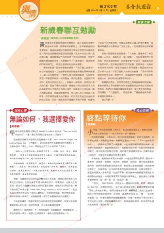 第 3103 期 主曆 2024 年 2 月 11 日(禮拜日) http://ChristianWeekly.net 輿 2情早前介紹過美籍猶太裔拉比 Harold S. Kushner 的作品“The Lord Is My Shepherd”一書,最近得悉他已經在去年 4 月辭世。他在離世前幾年出版相信是他最後一本書“Nine Essential Things I've Learned About Life”(中譯名:《拉比給我們生命最重要的九堂課》),在書末他以「情信」方式,寫給他生活了八十多年的「世界」:「過往八十年來你和我一起經歷了許多——結婚、生子、死亡、圓滿與失望——有些日子你看來簡直美得令人痛心,令我不敢相信你是我的;但你也有時使我心碎,遺下我哭成淚人。但無論如何,我選擇愛你。我愛你,無論你是否值得愛 ( 試問誰又能衡量? )。我愛你,部分原因是,你是我唯一的世界。我愛你,因為當我這樣做,我更喜歡自己。但最大的原因是,愛你令我今天更易感恩,明天更有盼望。這全是愛的功效。」我第一次讀這位拉比的作品已經在四十多年前,依稀記得好像是江大惠先生介紹的,拉比失去了年僅十四歲的兒子,悲慟莫名,走進人生的低谷,對自己作為猶太教教士的信仰產生疑惑,他遂作出深刻反省,幾年後出版了一本小書“When Bad Things Happen to Good people”,他說起初只是他在失去兒子後的心靈札記,但經朋友鼓勵,他才整理出版,誰料出版後一紙風行,成為暢銷書,吸引了無數教內教外的讀者。作為他的讀者,我最欣賞他作品的原因是他情詞懇切,好像父親或長輩對年輕人的叮嚀,說理中有情,甚少高深艱澀的神學。讀他在八十歲時總結一生,他的結論是「但無論如何,我選擇愛你。」我也盼望每一個人,經歷人生高低跌宕,最終也是這樣總結。小時候,有父母等放學;長大了,有男女朋友等放工;成家立室後,有家人等你回家……有人等待你,是一種幸福。我的跑步教練,人稱添 Sir,他不只是長跑教練,更是生命師傅,陪伴學生成長、挑戰學生突破、鼓勵學生堅持。一句:「添 Sir 在終點等待你。」,腦海中就浮現了一幅圖畫:一位無懼日曬和風雨的教練,遙望學生凱旋歸來,無論時間多與少,他都願意等待每一位跑到終點衝線的學生。每次跑馬拉松臨近終點,他的學生都會聽到添 Sir 大聲呼喚自己的名字,令疲乏的身軀以秒速重拾動力。作為牧者,能夠陪伴弟兄姊妹成長,一起走過不同的日子,喜有時、憂有時、成有時、敗有時、怒有時、愁有時,皆因每一個生命故事都是獨特的,他們所經歷的都是有血有淚,有其難以言喻的細節;就如教練在跑步上,為幫助每一位不同的學員克服軟弱和限制,向着目標努力,甚至有時要為人多走千里,也在所不辭。長跑教練的榜樣讓我看到生命師傅應有的態度,如何把事情不再只停留於眼平線上,真的要努力學習看事物要長一點、闊一點、高一點和深一點。「等待」,期盼而未得,本是給人一種無奈的感覺。然而,讀過添Sir《42195.終點等待你》,加上自己的親身經歷,卻讓我體會如何讓「等待」成為生命動力,教我知道無論如何,我都要盡力跑完人生旅程,因為上帝在終點也等待我、迎接我,而且祂也和添 Sir 一樣,一直沒有放棄每一位,也會欣賞我們跑完這趟旅程。同樣,教我也不要忘記對上帝交託的小羊都一樣要抱着相伴同行、有教無類的精神,陪伴他們走過人生的旅程,直到終點。無論如何,我選擇愛你 終點等待你書寫揮春與春聯是我國的民間習俗,華人基督徒也會在農曆新年時期,將揮春或春聯貼上,倍添新春佳節的喜慶氣氛。揮春與春聯的字辭意思不單表示我們可以蒙恩得福,同時也是對整個家庭成員的提醒。正如申命記六章六至九節記載,摩西教導以色列民要將上帝所吩咐的話,在家中或隨時隨地教訓兒女,也要繫在手上、戴在額上、寫在房屋的門框或城門上,即是在當眼的地方作出提醒。筆者曾看過一副很有意義的春聯:「克己讓人非我弱,存心守道任他強。」這使筆者聯想到使徒保羅在哥林多後書十三章八至九節所說:「我們凡事不能敵擋真理,只能扶助真理。即便我們軟弱,你們剛強,我們也歡喜;並且我們所求的,就是你們作完全人。」保羅有一個原則,就是克己讓人的行動,是為了要扶助真理,要使他人得以成為完全。因為保羅要存心守道而任由他人強壯,保羅絕不介意因自己讓人而顯出軟弱。但誠如對聯所指,克己讓人並不代表自己是弱者,只不過是在讓人的行動中,相對而言是自己站在較弱的地位而矣。正如一個奕棋高手會讓對手棋子那樣,能讓棋子的高手仍然是強者,也顯出強者甘心讓人的寬大量度。這種中華優秀文化傳統的「王者之道」,是與基督教信仰相輔相承的。另有一副春聯亦很有意義,「人為善,福雖未至,禍已遠離;人為惡,禍雖未至,福已遠離。」這是教導我們行善得福,作惡惹禍的道理。而春聯更進一步表示,福氣或未因行善而來到,但災禍就會因行善而遠離;反過來說,災禍或未因作惡而來到,福氣卻會因作惡而遠離。摩西在申命記三十章十九節,也對以色列人有相似的教導:「我今日呼天換地向你作見證,我將生死、禍福陳明在你面前,所以你要揀選生命,使你和你的後裔都得存活。」農曆新年伊始,我們可以透過上面兩副春聯同得勉勵。筆者亦撰寫以下的春聯作為對本報讀者和主內各位兄弟姊妹的恭祝,希望各位藉着多讀經和多禱告,蒙上帝更大的賜福。門頂橫批:「八福臨門」,門框對聯:「讀經得啟天天悟,祈禱蒙允事事成。」誠心所願!教會之聲新歲春聯互勉勵