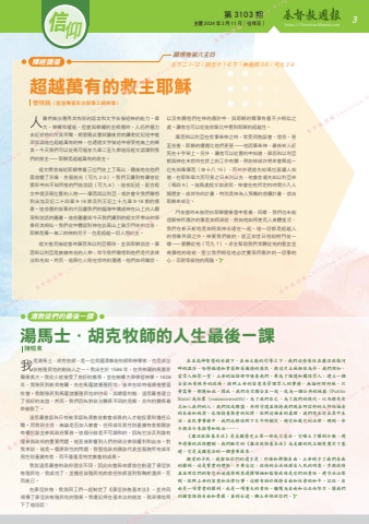 第 3103 期 主曆 2024 年 2 月 11 日(禮拜日) http://ChristianWeekly.net 信 3仰湯馬士.胡克牧師的人生最後一課我是湯馬士.胡克牧師,是一位英國清教徒牧師和神學家,也是康涅狄格殖民地的創始人之一。我出生於 1586 年,在英格蘭的馬雷菲爾德長大。我從小就接受了良好的教育,並在劍橋大學學習神學。1628年,我移民到新英格蘭,先在馬薩諸塞殖民地,後來在哈特福德植墾區牧會。我剛移民到馬薩諸塞殖民地的時候,與總督約翰·溫思羅普建立了很好的友誼,然而,我們因為對政治關係不同的見解,合作的關係最終破裂了。溫思羅普認為只有被承認為清教徒教會成員的人才能投票和擔任公職。而我則主張,無論是否加入教會,任何成年男性財產擁有者都應該有權投票並參與政府事務。這個分歧是不可調和的,因為它涉及到誰有權參與政府的重要問題,這直接影響到人們的政治參與權利和自由。對我來說,這是一個原則性的問題,我堅信政府應該代表並服務所有成年男性財產擁有者,而不僅僅是特定教會的成員。我與溫思羅普的政府理念不同,因此向當局申請前往創建了康涅狄格殖民地,我成功了,並擔任該殖民地的首任牧師直到我鞠躬盡瘁,死而後已。在康涅狄格,我與同工們一起制定了《康涅狄格基本法》,並共同領導了康涅狄格殖民地的發展。我還記得在基本法的前言,我深情地寫下了這段話:顯現後第六主日釋經講道曾培銘(宣道傳意及出版事工總幹事)陳曉東清教徒們的最後一課王下二 1-12;詩五十 1-6 下;林後四 3-6;可九 2-9超越萬有的救主耶穌人雖然無法運用其有限的語言和文字去描述神的能力、偉大、榮耀和權能,但當與榮耀的主相遇時,人仍然極力去記述他的所見所聞,期望藉此嘗試讓後世的讀者從記述中進深認識這位超越萬有的神,也透過文字描述中感受祂無上的榮美。今天我們可以從馬可福音九章二至九節這段經文認識到我們的救主—耶穌是超越萬有的救主。經文開首描述耶穌帶着三位門徒上了高山,隨後祂在他們面前變了形象,衣服放光(可九 2-3)。我們又讀到有聲音從雲彩中向不知所措的門徒說話(可九 6),這些記述,配合經文中提及兩位舊約人物—摩西與以利亞,或許會令我們聯想到出埃及記二十四章 9-16 節及列王記上十九章 9-18 節的情景。這些舊約敘事的片段讓我們的腦海中構成神在山上向人顯現和說話的圖畫。這些圖畫與今天我們讀到的經文所帶出的情景何其相似。我們從中體認到神在此高山上啟示門徒的信息,耶穌是獨一無二的神的兒子,也是超越一切人類的主。經文進而描述當時摩西和以利亞顯現,並與耶穌說話。摩西和以利亞是赫赫有名的人物,常令我們聯想到他們是代表律法和先知。然而,這兩位人物在世時的遭遇、他們如何離世、以及有關他們在神的應許中,與耶穌的職事有着不少相似之處。讀者也可以從這些類比中看到耶穌的超越性。摩西和以利亞在世事奉神之時,常受同胞誤會、埋怨、甚至苦害,耶穌的遭遇比他們更甚—祂因事奉神,最後被人釘死在十字架上。另外,讀者可以從舊約中知道,摩西和以利亞都與神在末世時在世上的工作有關,例如神應許將來會興起一位先知像摩西(申十八 15),而神亦透過先知瑪拉基讓人知道,在耶和華大而可畏之日未到以先,祂會差遣先知以利亞來(瑪四 5)。這兩處經文都表明,神會在祂所定的時間介入人類歷史,成就祂的計畫,特別是神為人預備的救贖計畫,就由耶穌來成全。門徒當時未能明白耶穌變像箇中意義,同樣,我們也未能理解神所應許的事是如何成就,例如祂如何使死人身體復活、我們在新天新地是如何與神永遠在一起。這一切都是超越人的想像界限之外。神要我們做的,就正如昔日祂吩咐門徒一樣—要聽從祂(可九 7)。求主幫助我們常聽從祂的聖言並倚靠祂的助佑,堅立我們相信祂必定實現所應許的一切事的心,忍耐等候祂的再臨。在至高神智慧的安排下,在祂大能的引導之下,我們這些居住在康涅狄格河畔的溫莎、哈特福德和韋瑟斯菲爾德的居民,與這片土地相依為命。我們深知,當眾人相聚一堂,上帝的話語便呼喚着我們,要為了維護和團結眾人,建立一個合宜而有秩序的政府,按照上帝的旨意來管理眾人的事務,無論何時何地,只要需要,都應如此。因此,我們決定聯合在一起,成為一個公共的地區 (Public State) 或社羣 (commonwealth),為了我們自己,為了我們的後代,以及將來有志加入我們的人,我們結成聯盟,共同守護並保持我們現在所信仰的主耶穌福音的自由和純潔,也保持着教會的紀律,依照這福音的真理,我們現在便在其中生活。在民事事務中,我們也將依照下文中所制定、規定和裁定的法律、規則、命令與法令來指導和統治……。《康涅狄格基本法》是美國歷史上第一部成文憲法。它確立了權利分散,週年選舉的政府體制,我們擬定的《康涅狄格基本法》為美國的民主制度奠定了基礎。它是美國憲法的一個重要源泉。親愛的子民,我留給你們的遺言是:珍惜和捍衛自由。上帝賦予了我們自由的權利,這是寶貴的禮物。不要忘記,政府的合法性源自人民的同意。參與政府並且用你們的智慧和道德原則來選擇領袖和監督政府是你們的責任。遵守法治原則,依照上帝的旨意和法律行事,這將有助於保持自由和社會的和平。記住,自由是一項寶貴的權利,也是一項重大的責任。繼續為自由和公正而努力,讓我們