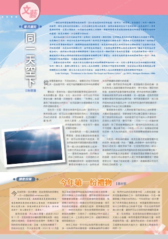 ·文藝同一天空下從某種意義來說,不同信仰的人,確實是活在不同的世界。但這個不同,卻是不能罔顧實存世界中的具體場景。譬如說,香港作為一個由所謂客觀事實組成的世界,有其具體社會、歷史、文化、政治背景。你可以從不同的歷史文獻、教科書、回憶錄等,客觀地、「科學地」去認識和了解這個地方的過去,從而認識它怎樣演變成今天我們所理解的香港。但在另一方面,那些住港島中區半山的,跟那些住九龍東慈雲山的,卻可以說是屬於兩個世界的人。那是指他們出生的背景、長大的環境、所受的教育、生活的圈子,讓他們 的待人處事、人情世故,甚至對生命的意義和目的,有非常不一樣的經驗和理解。從這個角度,一個人身處的客觀環境,跟他主觀認知的意義世界,就可以有相當大的差異。而我們無須將所謂客觀的歷史事實,跟一個人的主觀取態對立起來,彷彿它們非此即彼,必須二擇其一。重點是無論如何,我們無法把自己排除出去,用其他的方式來閱讀這個世界。這個世界的客觀環境和運作方式,自然地成為我們閱讀和理解它的規範。這樣,我們對世界的詮釋,就面臨兩方面的危機:首先是有些人強調客觀世界的歧異性,將它視為一種研究的對象,就像我們溫書預備考試那樣,將內容背得滾瓜爛熟,到最後卻跟我們沒有半點關係。另一個危機,是我們用那被實存環境所塑造的詮釋系統,將所謂客觀世界,納入我們既有的成見和偏見之中;於是我們見盡的所謂客觀世界,其實都走不出自己的主觀偏執。聖經曾多次提到,人間的智慧不能明白上主的事情,大概就是這個原因。耶穌曾經引用以賽亞書第六章指出,除了那些特許的以外,祂的道理不但不能叫人茅塞頓開,反倒叫人視而不見、聽而不聞。(可四 11-12)保羅亦曾經論到,除了那些被揀選的以外,福音的信息對其他人是不可理解、難以嚥下的。(林前一 25-26)這類描述明確地反映,先入為主的成見,往往是那解釋循環最致命的破口。只是另一個致命的錯誤,就是全盤否定這個客觀外在的世界,躲進主觀、內在、「屬靈」的想像中。如作者所言,聖經不是從另一個世界掉下來,它是我們世界的一部分。難道我們不因此必須用我們僅有的思想框架來解釋它嗎?倘如布特曼及其追隨者,拒絕接受歷史事實作為信仰的基礎,信仰又何以跟當代人連上有意義的關係呢?將兩者對立化,就成了信徒從週一至週六,過着跟週日完全不同的生活的原因。施德藩每月眉批·命的意義和目的,有非常不一樣的經驗和理解。觀環境,跟他主觀認知的意義世界,就可以有相當大的差異。而我們無須將所謂客觀的歷史事實,跟一個人的主觀取態對立起來,彷彿它們非此即彼,必須二擇其一。重點是無論如何,我們無法把自己排除出去,用其他的方式一個是由所謂客觀事實組成的世界,認知者無需任何信仰底蘊,就可以「科學地」去認識它;而另一個信仰的世界,則完全取決於信徒個人。正是這種完全對立的差異,值得在福音的亮光下受到質疑。這是我們下一章要處理的問題。這裏必須指出,如果接受這種對立的觀點,那麼布特曼及其追隨者拒絕接受所謂歷史事實作為信仰的基礎,就是正確的。但這確實不該如此。我以如此粗略的方式描述所有(宣教的)策略都有一個共同點:它們都在現代科學世界觀的文化前提下運作。這是顯而易見的。但這不也是無可避免的嗎?我們是否可能將自己排除出去,用其他方式來閱讀聖經?我們能否在所有日常事務和對話中,拋開那塑造我們整個教育,就是我們與當代人共同享有的公理和假設?這些都不是我們刻意選擇,而是在任何抉擇以外,無可避免地要接受,不就因為事情實際上就是這樣的嗎?難道不是作為正常健全的人,我們就必須這樣去理解事情嗎?聖經不是從另一個世界掉下來的外星實體,它是我們世界的一部分。難道我們不因此必須用我們僅有的思想框架來解釋它嗎?事實上,若非作為我們居住的現實世界的一部分,用我們的語言對我們說話,它還能怎樣影響我們呢?在提出這些反問時,我並沒有忘記關於著名的詮釋循環所論及的一切。沒有人會帶着完全空白的腦袋去閱讀任何一個文本。每個人都有自己一套先入為主的理解;否則就不可能有任何理解。但讀者也必須在某種意義上暫時擱懸自己的判斷,讓文本以自己的方式說話,並接受那先入為主的理解轉變為新的理解的可能性…。Leslie Newbigin, “Foolishness to the Greeks: The Gospel and Western Culture”, pp 50-51, Michigan: Eerdmans, 1986.今年第一份禮物 讀者投稿唐志堅今年收到第一份大禮物,是由我預科的同學在一月一日發給我的 whatsapp 短訊 :「告訴你好消息,我媽媽現在是虔誠的教徒,每星期都去教會的活動和上聖經班,阿媽話佢好快上完第三班,在復活節左右可以受洗,在主的庇佑下,佢心情好多了,感謝主!」接到消息後,內心無比興奮!話說於 2022年 11 月,定居美國洛杉磯的舊同學告知我,她在港的父親病危,因當時仍在疫情中,我轉介了醫院的院牧探望她父親。及後,在院牧的關懷下,世伯決志信主,不久安息主懷。2022 年 12 月底我正值新冠病情中未能為同學的父親主理喪禮,然而同學家人仍很感謝我,舊同學更帶同母親來我教會參加聚會,只因往返教會的路途遙遠,我便轉介她們往另一間靠近住所附近的教會。想不到伯母返教會後,逐漸投入起來,更準備信而受洗……神的作為奇妙!我在疫情期間的限制