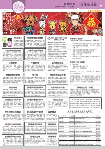 第 3103 期 主曆 2024 年 2 月 11 日(禮拜日) http://ChristianWeekly.net 分 9享 靈風漫步誠聘教會會計幹事中五或以上三年相關經驗,獨立處理教會及社服中心帳目,熟悉會計系統,持註冊會計證書更佳,需主日當值。繕履歷電郵香港華人基督會人事組[email protected]招聘用 誠聘傳道負責兒童、婦女、少年牧養教導。請繕履歷[email protected]深井靈光堂人事小組招聘用誠聘傳道神學畢業,牧養婦女兒童,履歷電郵[email protected]路德會頌恩堂收,招聘用誠聘傳道牧養青少年、職青及男士,履歷寄[email protected]宣道會將軍澳堂招聘用宣道會愛民堂誠聘全職教會幹事,負責行政、文書、財務及自修室管理。中學或以上,成熟委身,熟電腦操作,處事細心重團隊,經驗優先。繕履歷[email protected]高牧師收招聘用九龍城潮語浸信會幹事,中六畢業或以上,負責設計及多媒體事務,具相關工作經驗優先,應徵者具責任心及團隊精神,有事奉心志,需六日及輪班電郵[email protected]。招聘用招聘幹事負責辦公室事務、電腦、文書、會計、支援各事工,需週六日當值,履歷寄[email protected]招聘用。詳見www.kccc.org.hk九龍城基督徒會網頁九龍城潮語浸信會誠聘傳道多名,神學畢業,具牧會經驗及團隊精神。主動熱誠委身牧養及教導。主責工作分別兒童事工、青少年事工、男士事工。電郵[email protected]。招聘用香港華人基督教聯會墓園部 華人基督教墳場認可修墳/執骨承造商注意:1. 墳主自行委託承造商承造工程時,由於墓碑式樣及材料不同、手工各異,故不同承造商之收費可能相距甚大,本聯會建議墳主應盡量聯絡多間承造商作比較,以免引起不必要之爭拗,本聯會亦建議墳主於結算餘款給承造商前,先到墳場查看已承造之工程,如有不妥善之處,可直接與有關承造商交涉。2. 所有本聯會轄下華人基督教墳場之修墳⧸執骨等工程均須由上列已登記認可承造商辦理。3. 市面上可能有些公司與本聯會認可承造商名稱或相同,本聯會建議墳主簽約付款前認清公司名稱、電話及地址。4. 所有墓碑建造或修葺等工程,必須依本聯會墳場管理條例規則申請,經批核後方可動工。5. 墳主若有任何疑問,請賜電本聯會職員查詢。聯會總辦事處:2337 4171 華人基督教墳場:(香港)2817 1821 (九龍)2336 0653更新日期:2022-01-01承 造 商 東主姓名 地 址 電 話忠記石廠 余永忠先生 九龍深水埗福華街43號 2728 0840合盛石廠 譚承東先生 九龍紅磡溫思勞街33號地下 2387 8440德安石廠有限公司 陳紫梃女士 香港柴灣連城道240C 9019 2000江聯基石廠 林潔芳女士 香港域多利道大口環村61號 2817 5796�9027 0334張碩記石廠 張經國先生 香港柴灣小西灣曉翠苑雅翠閣3207室 2817 3744�9305 8157百福營造廠 藍金泉先生 九龍慈雲山蒲英里8號慈華大廈五樓 D 座 2327 7324陳諏建築公司 陳希和先生 香港域多利道大口環977號 2817 74059269 8741朱炎記石廠有限公司 陳鎮藩先生 香港德輔道西343號均益商場16B地下 2382 2445朱新記石廠有限公司 朱耀權先生 九龍紅磡馬頭圍道37-39號紅磡廣場二樓B86舖 2395 96789096 1877賴金記石廠有限公司 陳冠生先生 香港域多利道大口環6485地段 2817 3161�9422 1238李煥記雲石公司(梁華) 曾兆祥先生 九龍土瓜灣譚公道82號香港工商銀行大廈地下 2519 7618助理幹事/副幹事 Administrative Assistant (荔枝角)• 中學畢業或大專程度及兩年或以上工作經驗• 熟悉電腦操作及文書處理(MS Office及中英文輸入法)• 負責主日崇拜周刊及簡報 (PowerPoint)• 負責崇拜影音及其他聚會場地設置• 細心,富責任感及具團隊精神• 需週六、日上班• 有事奉心志,能靈活應變,具教會經驗及即時上班者優先傳道同工 (青少群體) • 神學畢業• 負責教導牧養及福音工作• 成熟主動,重團隊精神福利包括:5天工作、12天有薪年假、醫療津貼、住院保險等。應徵者請繕履歷、要求薪酬及所屬教會(如適用)寄九龍塘窩打老道134號香港九龍塘基督教中華宣道會人事組收 (信封面請註明申請職位名稱)或電郵至 [email protected] (資料只作招聘用)。香港九龍塘基督教中華宣道會 (蝴蝶谷基址) 誠聘傳道同工 (兒童及少年事工)神學畢業,推動兒童及少年牧養事工,主動熱誠,具備團隊及委身的精神。福利包括:5天工作、12天有薪年假、醫療津貼、住院保險等。應徵者請繕履歷、要求薪酬及所屬教會(如適用)寄九龍塘窩打老道134號香港九龍塘基督教中華宣道會人事組收(信封面請註明申請職位名稱)或電郵至[email protected] (資料只作招聘用)。全職幹事電腦文書一般辦公室事務,協助教會行政及推展事工。中學畢業具事奉心志,五天工作須週六上班。履歷寄長沙灣順寧道439號順寧居3樓執事會收,信生會信基堂招聘用誠聘全職行政幹事負責文書會計及教會支援,須週六、日或公眾假期當值。大專以上,熟電腦文書及影音操作。請電郵申請及履歷至[email protected]天頌堂。只招聘用。誠聘傳道同工荃灣區教會。神學畢業經驗不拘,熱誠主動具團隊精神,有負擔教導及傳福音。履歷電郵[email protected]或寄荃灣享和街94號一樓樂道會荃灣堂。(只作招聘用)堂主任中華基督教會海南堂聘堂主任(牧師或宣教師),七年或以上牧會經驗。牧養教導、堂校合作、領導策劃。履歷電郵至[email protected](資料只供招聘用)誠聘教會社區幹事具事奉心志、成熟勤奮,重視團隊、熟電腦操作懂網頁或剪片更佳,獨立處理文書。負責社關服務需週六日工