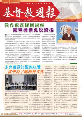 編輯及發行人:香港華人基督教聯會 督印人:陸幸泉 地址:九龍聯合道140號香港華人基督教聯會大樓二樓 電話:2337 4171 圖文傳真:2338 2314網 址:http://ChristianWeekly.net 電子郵箱:[email protected] 承 印:國強印刷制作公司 作者文責自負3104 2024年2月18日 逢禮拜日出版.本期出紙二張半.每份零售五元正本期推介 堅持.不放棄.梁美英 p.2 ∣ 天地人和.林慧琪 p.4-5 ∣ 信任的崩潰.李碧如 p.6多角度探討聖樂牧養從聖詩了解教會文化教會稅務條例講座闡釋機構免稅資格楊彼得律師強調,若教會異象或未來活動性質改變,必須修改章程,否則有機會被追收稅款。香港華人基督教聯會教育部教牧及長執支援組已於1月27日,在聯會教牧中心舉辦「教會稅務條例講座」,多間教會及機構義務法律顧問楊彼得律師強調,獲豁免繳稅之慈善團體須確保舉辦的活動符合其服務宗旨,否則有機會被稅務局追收稅款。楊彼得律師指,慈善團體如欲豁免繳稅,須根據《稅務條例》第88條向稅務局申請確認豁免繳稅資格(俗稱88牌),稅務局亦會定期進行覆查。當局規定,獲豁免繳稅之慈善團體,須確保盈餘用於慈善用途,且大部分盈餘於香港境內使用。當稅務局調查時,除了參閱核數報告外,更重要是查看慈善團體業務及過去舉辦之活動,是否符合其申報的服務宗旨;若發現有關活動不符合機構服務宗旨,稅務局有機會追收稅款,甚至取消慈善機構地位。他舉例,過去有慈善機構與地產商合作興建住宅及出售單位,由於地產業是商業活動,並非該慈善機構宗旨,結果被稅務局追收稅款。他留意到,近年稅務局徵收稅款的做法有所改變,如不少慈善機構成立逾百年,昔日向政府申請土地興建酒店,一直無需繳稅;但兩年前,稅務局突然稱酒店業務不符合慈善機構宗旨,故未來需徵收稅款。此外,如稅務局經調查後發現教會有物業收租,將須繳付物業稅,若有慈善機構頻繁炒賣股票或樓宇,將來亦有機會被追收稅款。他又分享為機構申請豁免繳稅的經驗,指根據社團條例已成立的團體,須呈交過去12個月的核數報告,讓稅務局了解財政和支薪狀況等。另外,機構亦須解釋舉辦之活動是否符合機構宗旨,並闡述新成立之機構與母會/現有機構的關係等。他指,最近為一間營地租借服務的基督教機構申請豁免繳稅,稅務局質疑營地如何促進傳教宗旨。他建議機構向當局解釋,營地裏有不少免費傳教設備,如祈禱室、宗教圖書館、退修設施等,加上不少商業機構會選擇營地作員工活動之用,因此對於向非基督徒傳教十分重要,最終獲批。所以他提醒,教會舉辦之活動內容必須具備基督教傳教色彩,若與坊間商業機構合作的活動更要格外小心。他重申,教會或慈善機構的活動必須符合服務宗旨,如異象或未來活動性質改變,可修改章程並提交稅務局審批,否則將有機會被追收稅款。香港聖樂促進會於今年初上演《約瑟的啟示》感恩獻禮,作品由華人基督徒作曲家黃安倫先生創作,為其首個廣東話聖樂合唱作品。該會隨之舉辦一系列「國際知名作曲家黃安倫專場」,其中於1月26日,在該會聖樂培訓中心舉辦「聖樂牧養座談會」,由一眾聖樂同道分享聖樂牧養經歷及現況。座談會上論到當代聖樂牧養的現況,與會者提及疫情後不少教會合併了詩班及敬拜隊,加上弟兄姊妹或要一人身兼多個事奉職位,難免存在事奉張力及情緒。牧者要具備同理心,聆聽和明白事奉者的難處,並適時調動聚會時間,以致能更靈活地安排人手。此外,教會近年較多本土化詩歌創作,以致詩歌曲目大幅收窄,幾乎各教會都唱頌同一首詩歌,影響了信徒欣賞不同文化、色彩及藝術的能力,難以藉此豐富信仰經歷。至於「美」這個字的本源是上帝的榮耀,如世界是上帝所造,祂看為「好」便代表了美,基督徒要思考如何回歸「美」的根本──聖潔,回復上帝原先創造的榮美。聖樂牧養方面,與會者認為牧養不單是關心同行,更是教導真理、回應呼召、促進人神復和等,所以以聖樂為媒介作牧養時,不可抽離以上元素。至於崇拜則是很好的牧養場景,因大部分教會將崇拜放在核心聚會中,涉及範圍最廣,教會應檢視崇拜內容,確保以基督為中心及聖經為依歸。亦有言,在理性認知角度上,牧養是人被喚醒,知道創造的本源、上帝與人及所有被造物的關係;而在實際體驗上,則是與牧養對象一起生活,發現彼此需要,同時要醒覺與想像,透過終末永恆的概念,以致有力量活在當下,面對黑暗。另外,與會者稱唱聖詩是很好的牧養教材,從中學習樂譜、音調、拍子及句法結構等音樂特色,同時由於聖詩集涵蓋類別及文化廣闊,能幫助信徒認識世界、了解教會歷史等。當信徒見識層面愈來愈多時,自然開拓了視野,在聖詩選材上也不再千篇一律。黃安倫先生分享其創作經驗,他強調創作聖樂必須放下個人意念,每一個音符都要從上帝角度出發,為上主而作。他形容,信主後看事物的角度截然不同,懂得從上帝的觀點看世界,並帶有信、望、愛的盼望,所以音樂創作風格亦隨之改變。他指,其作品的對象是無音樂背景的人,因此不論交響樂或歌劇等作品,哪怕配上世俗的標題,也刻意讓聽眾容易明白和有得着。他直言,很清楚這是宣教的一部分,「為主作工,我的工作就是音樂……這是耶穌給予每個基督徒的使命,也是我信主後的宗旨。」是次座談會由譚靜芝博士主持,出席講員包括:黃安倫先生、何世傑牧師、蔡禮遜牧師、潘凱