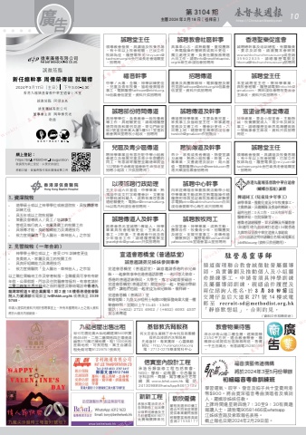 第 3104 期 主曆 2024 年 2 月 18 日(禮拜日) http://ChristianWeekly.net 廣 10告歡欣僱傭嚴格挑選菲印傭工適合不同家庭需要提供專業顧問服務經驗豐富服務真誠查詢21558177信實室內設計工程承 造 各 類 裝 修 工 程 包 括 教 會、NGO、 學 校、 幼 稚 園、 中 西 醫 及牙科診所、商舖、寫字樓及住宅等網 頁 www.bhd.com.hk 電 話24130988WhatsApp94613739新新工程承接水電油漆泥水各項裝修工程取價公道歡迎教會及主內肢體電90819077免費報價陳弟兄招聘傳道盡責及具團隊精神。電郵履歷及蒙召見證[email protected]信義會信望堂。資料只供招聘用福音幹事中學/大專,全職,神學訓練更佳,兒童及青年牧養,協助發展福音事工,電郵履歷[email protected]信義會信望堂。資料只供招聘用九龍居屋出售出租翠竹花園近黃大仙地鐵建築540呎實用484呎,二房二廳間格四正環境清幽售370萬已補地價,租11000元包差餉地稅,可長短租,業主自讓自租免佣可電91239751張弟兄誠聘教會社區幹事具事奉心志、成熟勤奮,重視團隊、熟電腦操作懂網頁或剪片更佳,獨立處理文書。負責社關服務需週六日工作。請寄[email protected]新生命浸信會招聘用 誠聘堂主任領導教會發展,具講道及牧養恩賜,有十年以上牧會經驗,已按立作牧師為佳。履歷電郵至[email protected]金巴崙長老會道顯堂。招聘用誠聘部份時間傳道具神學學位,負責教會一般牧養教導工作,具經驗更佳,請親繕履歷連同得救和蒙召見證,寄屯門新安街2號富益商業大廈5樓501室基石教會興田堂聘牧小組收。招聘用宣道會馬灣堂傳道神學畢業,委身小型堂會,主動熱誠,牧養關愛成人,青少年及婦女事工,請繕履歷至新界馬灣體育路一號執事會主席收,資料只供招聘用途。誠聘傳道及幹事傳道需神學畢業,主要負責兒童、家長事工及協助堂主任。幹事處理堂務及文書工作,懂會計更佳。六日需上班,繕歷寄荃灣潮語浸信會[email protected]作招聘用。誠聘堂主任本堂誠聘堂主任。需神學畢業,具牧會經驗。履歷請電郵[email protected],興田浸信會聘牧委員會主席收。資料只供招聘用。聘請傳道及幹事青少、家長或長者傳道,熱愛宣講及教導、熟悉小組牧養。幹事,大專畢業,文書處理及設計,周六當值。電郵履歷[email protected]香港天樂浸信教會招聘用 兒區及青少區傳道聘神學畢業且有意在駐中學小組教會建立及發展兒童及青少年群體的同工。有意請寄履歷至觀塘翠屏道102號新生命教育協會新生命福音堂招聘小組收(只供招聘用) 誠聘堂主任領導教會發展,具講道及牧養恩賜,有十年以上牧會經驗,已按立作牧師為佳。履歷電郵至[email protected]金巴崙長老會道顯堂。招聘用以浸誠聘行政助理五天半週六日當值,中學畢業,熟電腦中英文打字略懂會計,文書接待聯絡資料輸入,成熟有責任善溝通經驗優先,電郵[email protected]以馬內利浸信會招聘用。 誠聘中心幹事向家庭傳福音策劃推展活動帶小組中學畢業主動成熟並熟電腦操作繕履歷附得救見証教牧推薦信薪酬要求電郵[email protected]白田浸信會愛鄰中心梅生收只招聘用誠聘教牧同工小型堂會,神學畢業,成熟主動,團隊合作,牧養青少年、初職團契及婦女,支援兒童事工、差傳佈道、關懷探訪。履歷電郵[email protected]宣道會富山堂招聘用誠聘傳道人及幹事路德會恩光堂誠聘1傳道人,神學畢業具牧會經驗更佳,主責成人事工。2幹事,主責教會行政及青少年福音工作。請繕履歷電郵至[email protected]只供招聘用香港聖樂促進會誠聘總幹事及培訓總監,有關職責、要求及詳情,請瀏覽本會網頁www.hkchurchmusic.org或查詢35902835,請繕履歷電郵至[email protected]招聘用1. 資深院牧 - 道學碩士或以上神學學位或檢證院牧,具牧關督導訓練尤佳- 具五年或以上院牧經驗- 策劃及督導病人 / 員工 / 培訓事工- 管理及執行病人、家屬及員工的牧關工作- 具領導才能、良好組織能力及溝通技巧- 致力宣揚醫院「全人醫治、榮神益人」之宗旨2. 見習院牧(一年合約) - 神學學士學位或以上,曾受 CPE 訓練者更佳- 負責病人、家屬及員工的牧關工作- 具良好組織能力及溝通技巧- 致力宣揚醫院「全人醫治、榮神益人」之宗旨以上職位需輪班工作及穿著制服。全職僱員可享有有薪年假、公眾假期、門診及住院醫療等福利。有意者請於二零二四年三月三日或之前附履歷及聯絡電話寄香港九龍灣常悅道 9 號企業廣場 1 期 2 座 18 樓香港浸信會醫院人力資源部或電郵至 [email protected] 或傳真至 2339 5769。申請人提供的資料只用於招聘事宜上,所有未獲聘用人士之個人資料將於六個月內被銷毀。1. 資深院牧 2. 見習院牧(一年合約) 福音演藝佈道機構將於2024年3至5月份舉辦 初級福音粵曲訓練班學習運氣、咬字、發音及拍子共十堂費用港幣$900。將由資深福音粵曲演唱者及填詞人,羅娥珍姊妹任教。上課時間逢星期四晚7:30至9:30有興趣報讀人士,請致電90581466或whatsapp江姊妹查詢及索取報名表格。截止報名日期2024年2月29日前。宣道會恩橋堂 (普通話堂)誠意邀請弟兄姊妹參與事奉宣道會恩橋堂 (普通話堂),誠意邀請香港的弟兄姊妹,一起參與事奉在港普通話群體,一起回應大使命。香港的普通話新移民、大學生、專才家庭需要福音。宣道會恩橋堂(普通話堂) 期望與您一起,把福音帶給他們,讓他們也能一起來成為弟兄姊妹、敬拜神。宣道會恩橋(普通話)堂聚會地點:九龍尖沙咀柯士甸路20號保