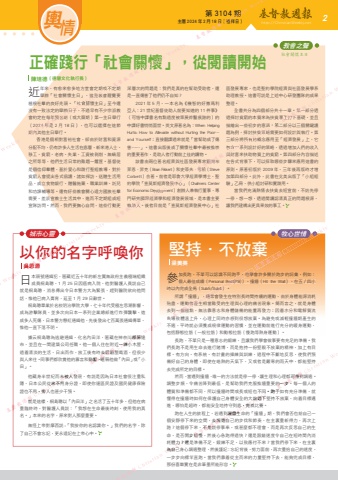 第 3104 期 主曆 2024 年 2 月 18 日(禮拜日) http://ChristianWeekly.net 輿 2情日本頭號通緝犯,匿藏近五十年的新左翼無政府主義極端組織成員桐島聰,1 月 25 日因癌病入院,他對醫護人員說自己就是桐島聰,消息傳出令日本警方大為緊張,趕到醫院欲向他問話,惟他已病入膏肓,延至 1 月 29 日辭世。桐島聰畢業於名校明治學院大學,七十年代受極左思潮影響,成為游擊隊員,並多次向日本一系列企業總部進行炸彈襲擊,造成多人死傷,日本警方懸紅通緝他,先後發出七百萬張通緝傳單,惟他一直下落不明。據云桐島聰為逃避通緝,化名內田洋,匿藏在神奈川縣藤達市,並且在一間建築公司任職。他一個人住在附近一棟小木屋,過着清淡的生活,日出而作,放工後有時去居酒屋喝酒,但很少與人來往。同事們都欣賞他的寡言和勤奮,暱稱他做「內田」或「小田」。他藏身半世紀而未被人發現,有說是因為日本社會很注重私隱,日本公民從來不用身分證,即使你連區民證及國民健康保險證也不用,旁人也甚少干預。就是這樣,桐島聰以「內田洋」之名活了五十年多,但他在病重臨終時,對醫護人員說:「我想在生命最後時刻,使用我的真名。」本來的名字,原來對人那麼重要。無怪上帝對摩西說 :「我按你的名認識你。」我們的名字,除了自己不會忘記,更永遠記在上帝心中。參加長跑,不單可以認識不同跑手,也學會許多關於跑步的詞彙,例如:個人最佳成績(Personal Best(PB))、撞牆(Hit the Wall)、在五/四小時以內完成全馬(Sub5/Sub4)。所謂「撞牆」,通常會發生在特別長時間持續的運動,由於身體能源消耗殆盡,運動者產生相當難受的生理與心理的痛苦現象。簡而言之,就是身體去到一個極點,無法靠意志和身體儲備的能量再發力;因着水分和電解質流失導致體溫上升,心理上同時亦感到很想放棄。為避免或減輕撞牆期產生的不適,平時就必須養成規律運動的習慣,並在運動前進行充分的暖身運動,包括靜態拉筋(一般拉筋)和動態拉筋(慢跑等熱身運動)。長跑,不單只是一種意志的鍛練,且讓我們學會做事要有充足的準備。我們長跑不是用生命去進行賭博,而是抱持一份堅毅不放棄的精神,加上有目標、有方向、有系統、有計畫的操練與訓練,過程中不斷地反思,使我們預備好自己的身體,即使在皓熱的天氣下,又或者是嚴寒的雨天中,都能堅持去完成所定的目標。然而,當遇到撞牆,唯一的方法就是停一停,讓生理和心理都可得到調適。調整步頻,令痛苦降到最低,是幫助我們克服推牆重要的一步。每一個人的體質和準備都不同,所以撞牆時間或長或短也不同。跑手如有充分準備,就懂得在撞牆時如何在保護自己身體安全的大前題下堅持不放棄,向着目標邁進,哪怕是超時,都能安全地持守到底,完成比賽。跑在人生的旅程上,若遇到屬靈生命的「撞牆」期,我們會否也給自己一個安靜停下來的空間,去調適自己的步伐和節奏,在主裏重新得力,再次上路?這個停下來,不是說停事奉,或甚麼都不理會,而是再次反思自己的生命,是否開步過慢,然後心急跑得過快?還是跟錯速度令自己在短時間內消耗體力?還是準備不足,鍛練不足,以致應付不來?當我們停下來,在主裏為自己身心調適整理,然後謹記:忘記背後,努力面前,再次重拾自己的速度,一步步向標竿直跑。當我們靠着從主而來的力量堅持下去,能夠完成目標,那份喜樂實在是非筆墨所能形容。以你的名字呼喚你 堅持.不放棄近年來,有愈來愈多地方堂會定期或不定期舉辦「社會關懷主日」,這是教會醒覺要植根社羣的良好兆頭。「社會關懷主日」至今還沒有一致法定的舉辦日子,不過早有不少宗派教會約定在每年預苦期(或大齋期)第一主日舉行(2024 年是 2 月 18 日),也可以選擇在這節期內其他主日舉行。香港是個相對富裕社會,卻由於財富和資源分配不均,仍有許多人生活在底層,新來港人士、移工、貧窮、老病、失業、工資被剝削、無蝸居之所等等,他們生活日常的難題一籮筐。基督徒是個信仰羣體,基於愛心和踐行聖經教導,對於貧窮人會提出各式倡議,諸如探訪、送贈生活用品、成立食物銀行、贈醫施藥、職業訓練、託兒和功課輔導等。還有好些教會關心遠方國族社羣需要,差派宣教士生活其中,進而不定期組成短宣隊訪問。然而,我們要撫心自問,這些行動更深層次的問題是:我們是真的在幫助受助者,還是一直傷害了他們仍不自知?2021 年 5 月,一本名為《機智的好撒瑪利亞人:21 世紀基督徒助人前要知道的 11 件事》(可惜中譯書名有點過度被策展斧鑿痕跡的)的中譯好書悄悄面世。英文原著名為:When Helping Hurts: How to Alleviate without Hurting the Poor… and Yourself;直接翻譯過來就是「當幫助成了傷害……」。這書出版後成了關懷社羣中最被推崇的重要著作,是助人者行動前上佳的讀物。該書由兩位著名經濟與社區發展專家顧問布萊恩.菲克(Brain Fikkert)和史蒂夫.考柏(Steve Corbett)合著。前者是耶魯大學經濟學博士,聖約學院「查莫斯經濟發展中心」(Chalmers Center for Economic Development)創辦人兼執行董事,專門研究國際經濟學和經濟發展領域,是本書主要執筆人。後者目前是「查莫斯經濟發展中心」社區發展專家,也是聖約學院經濟與社區發展學系助理教授。這書可說是上述中心研發團隊的成果整理。全書共分為四個部分共十一章。第一部分透過探討貧窮的本質來為扶貧事工打下基礎,並且