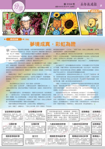 第 3104 期 主曆 2024 年 2 月 18 日(禮拜日) http://ChristianWeekly.net 分 9享 靈風漫步九龍城潮語浸信會幹事,中六畢業或以上,負責設計及多媒體事務,具相關工作經驗優先,應徵者具責任心及團隊精神,有事奉心志,需六日及輪班電郵[email protected]。招聘用 招聘幹事負責辦公室事務、電腦、文書、會計、支援各事工,需週六日當值,履歷寄[email protected]招聘用。詳見www.kccc.org.hk九龍城基督徒會網頁 九龍城潮語浸信會誠聘傳道多名,神學畢業,具牧會經驗及團隊精神。主動熱誠委身牧養及教導。主責工作分別兒童事工、青少年事工、男士事工。電郵[email protected]。招聘用 早上七點左右,我如常到公園晨運。在斑馬線等候過馬路時,抬眼看見一道長長的彩虹高掛天空,彩虹的一端並穿過一棟樓高幾十層的住宅大廈。我心中一陣竊喜,二話不說便拿出手機拍下這個難得一遇的景像。我從不同的角度拍了幾張相後,便站在一旁靜觀彩虹的變化。當我瞪大雙眼凝望着那道彩虹,發現它在陽光的照耀下,閃耀着光彩奪目的光芒。過了一會兒,彩虹的顏色漸漸變淡,若隱若現,最後消失在空中。在我的心目中,彩虹是世界上最美的,由七種鮮艷的顏色組成︰太陽的紅色,朝霞的橙色,黃金的黃色,樹葉的綠色,小草的青色,海洋的藍色,牽牛花的紫色。感謝造物主把我的人生拼圖拼湊成一幅色彩繽紛的圖畫,以致我的生命如彩虹般多姿多彩,豐富盈滿。多年前的一個經歷,不期然在腦海中浮現。事緣有天晚上,我做了一個奇怪的夢。夢見自己逛書店時,看見一本封面印有自己姓名的書靜靜地躺在書架上。在好奇心的驅使下,我拿來翻閱。翻着翻着,不禁思忖︰「怎麼搞的?還附有照片呢,我一向用筆名發表文章,可現在……」「我定意要妳以自己的生命,為別人鋪成一座彩虹橋!」「為別人鋪成一座彩虹橋?」我驀地抬起頭來,環顧四周卻空無一人。心裏正納悶的時候,書店內忽然響起了悠揚的音樂,接着是一把磁性男中音的歌聲︰「當你感覺失望渺小,眼中噙滿淚水,我願守在你的身旁,為你擦乾眼淚。……當你意志消沈,茫然漫步街頭,當夜色漫長難熬,我願在你身旁安慰你、保護你。當人生的黑暗來臨,一切充滿了痛苦,我願如惡水上的大橋,助你度過難關!……閃亮的女孩,向前航行!經歷了這些,你的人生開始輝煌,你所有的夢想就要實現。看看它們多麼耀眼!……」我豎耳傾聽這首耳熟能詳的歌,正欲張口和唱,歌聲戛然而止。這時,我醒了。夢醒時分,「惡水上的大橋」其中一段歌詞,不知怎的總是盤旋於腦海中,久散不去︰「經歷了這些,你的人生開始輝煌,你所有的夢想就要實現。看看它們多麽耀眼!」躺在床上輾轉反側,尋思良久終於如夢初醒——這是神放在我心中夢想的種子,它是來自神的靈︰「我要將我的靈澆灌凡有血氣的。你們的兒女要說預言;你們的少年人要見異象;老年人要做異夢。」(徒二 17)「呵呵,未達老年神就讓我做異夢,真是太奇妙了。」我興奮得差點叫出聲來……在往後的日子,創作的靈感如泉水般湧出,許多美麗的方形文字在我筆尖下跳躍,字裏行間有如一股溫柔的詩韻在流動。芸芸作品中,有的是我的親身經歷,有的是我對身邊人事物的心靈觸動。即使有些苦楚酸澀,但筆尖耕耘下的心血和汗水,是我為夢想而發奮圖強的收獲。在追夢的過程中,我發現原來神在我的人生,早已定下了祂的旨意、願望、目的和祂的計畫。因為若沒有這些跌宕起伏的人生經歷,又或者沒有神參與其中,寫作便成了我紙上談兵的空想。所以當我張開夢想的翅膀,神就賜予我力量、智慧、能力和意念來成就祂的美意。回顧二十年的寫作生涯,若將海內外發表過的文章和得獎作品分類並集結成書,粗略估算以雙位數計 ( 不包括已出版的自傳式散文 )。我常想︰若不是耶和華賜我靈感,即使搜索枯腸也難以下筆;若不是耶和華賜予恩典,就是窮我一生也不能達成從神而來的夢想!為表達對神的感恩之情,我用舊曲譜上新詞創作了《百首靈歌獻給主》歌集。其中一首「彩虹證我愛祢心」是個人特別喜愛的︰請問祢愛我有多深,祢愛我有幾分?祢為我降生,又為我犧牲,十架代表祢的心。我知祢愛我有多深,祢愛我有幾分,比大海更深,比珍珠更真,十架代表祢的心。捨祢尊貴身分,深深感動我的心,主祢的十架情,叫我感恩到如今。祢問我愛祢有多深,我愛祢有幾分?奉獻我身心,報答主恩情,彩虹證我愛祢心。夢境成真,彩虹為證 讀者投稿全職幹事電腦文書一般辦公室事務,協助教會行政及推展事工。中學畢業具事奉心志,五天工作須週六上班。履歷寄長沙灣順寧道439號順寧居3樓執事會收,信生會信基堂招聘用 堂主任中華基督教會海南堂聘堂主任(牧師或宣教師),七年或以上牧會經驗。牧養教導、堂校合作、領導策劃。履歷電郵至[email protected](資料只供招聘用) 聘請教會高級幹事處理教會日常事務,辦公室行政,堂務安排,物業管理懂電腦操作,中英文書,大專程度,須周六日工作,三年經驗。履歷招聘用寄屈臣道維多利中心403室銅鑼灣浸信會 聘傳道及兩名幹事傳道需神學畢業,協助兒童及家長事工。行政幹事需大專畢業,負責策劃統籌事工。幹事需中學畢業負責文書行政。繕履歷[email protected]宣道會筲箕灣堂招聘用聘教會事務幹事中學畢業或以上負責教會行政事務懂電腦影音設備操作協助周日崇拜準備及收拾有會計經驗為佳履歷電