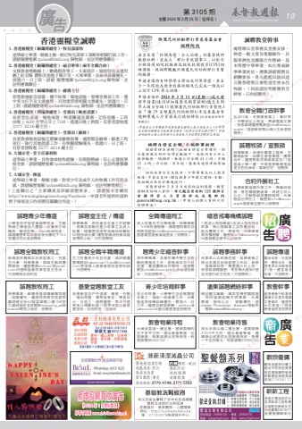 第 3105 期 主曆 2024 年 2 月 25 日(禮拜日) http://ChristianWeekly.net 廣 10告香港靈糧堂誠聘1. 香港靈糧堂 ( 銅鑼灣總堂 ) - 牧兒部部牧道學碩士畢業,積極主動,制訂牧兒部事工策略和相關行政工作。請繕履歷電郵 [email protected] 陳牧師,並註明應徵職位。2. 香港靈糧堂 ( 銅鑼灣總堂 ) - 福音幹事 ( 兩年全職合約 )支援教會推動線上 / 數碼創意事工、文案設計,協助管理及運用網上社交媒 體和其他電子媒介等。大專畢業,具神學裝備優先,須週六、日上班。請繕 履歷電郵 [email protected] 陳牧師,並註明應徵職位。3. 香港靈糧堂 ( 銅鑼灣總堂 ) - 總務主任管理教會影音設備、樓宇保養、場地設施,督導堂務員工作,懂中英文打字及文書處理,具物業管理相關文憑優先,須週六、日上班。請繕履歷電郵[email protected] 陳牧師,並註明應徵職位。4. 香港靈糧堂 ( 銅鑼灣總堂 ) - 堂務員 ( 晚更清潔 )負責堂址清潔、場地佈置、物資搬運及雜務、定時巡樓。工時由晚上 9:30 至翌日早上 7:30,逢週日晚上例假。有意者請致電 2577 4216 羅主任。5. 香港靈糧堂 ( 銅鑼灣總堂 ) - 堂務員 ( 維修 )負責教會場地設施定期檢查維修保養、處理緊急維修、跟進工程項目、執行其他指派工作,有相關經驗優先,須週六、日上班。有意者請致電 2577 4216 羅主任。6. 大埔分堂 - 堂主任兼校牧道學碩士畢業,具牧會或校牧經驗,有開創精神,有心志發展學校堂會,請繕履歷電郵 [email protected] 陳牧師,並註明應徵職位。7. 大埔分堂 - 傳道道學碩士畢業,積極主動,對青少年及成年人的牧養工作有使命感,請繕履歷電郵 [email protected] 陳牧師,並註明應徵職位。( 上述職位之「主要職責及詳細資歷要求」,請瀏覽本堂網頁 http://www.lingliangchurch.org/Facebook。申請者所提供的資料將予保密及只作招聘有關職位用途。)歡欣僱傭嚴格挑選菲印傭工適合不同家庭需要提供專業顧問服務經驗豐富服務真誠查詢21558177新新工程承接水電油漆泥水各項裝修工程取價公道歡迎教會及主內肢體電90819077免費報價陳弟兄新增設網頁版廣告(2024 年 1 月開始實施)詳情可瀏覽 www.christianweekly.net教會物業待售深水埗青山道二樓全層,建築面積2350平方呎,適合教會聚會、機構辦公或提供社區服務用途,售價一千五百萬元,有意請電25280186。誠聘教堂幹事處理辦公室事務及堂務安排,熟悉一般文書及電腦操作,具服事熱忱及團隊合作精神。基本學歷中學畢業,如大專或神學畢業更佳。應徵請繕簡歷及薪酬要求,寄九龍藍田啟田道五號香港聖公會聖道堂曾永昌牧師。(封面請註明應徵教堂幹事。只作招聘用)教會全職行政幹事各項行政,支援教會事工,會計等。中學或以上程度,熟識電腦文書。有意請繕履歷電郵至[email protected](基督教慈雲山潮人生命堂招聘用)誠聘牧師/宣教師神學畢業,承擔牧養事工發展,主動敢創新,回應社會善溝通,團隊合作。履歷寄新界葵涌華荔徑11號基真小學一樓,中華基督教會基真堂主任牧師收,電郵亦可,招聘用合約外展社工負責策劃協調外展工作,需輪班留宿。善危機應變處事,具建立別人心志。主動熱誠具團隊精神。大專程度註冊社工。履歷致[email protected]基督教互愛中心招聘用全職傳道同工成人牧養及主日學教導。神學畢業、3-5年牧會經驗。請繕歷附蒙召及得救見證至[email protected]基督教宣道會真道堂收(招聘用)福音戒毒機構誠聘1.男成人院舍傳道2.女成人院舍福音幹事。熱心推動事工及牧養學員,配合團隊工作,需留宿;神學畢業具牧養經驗,履歷致[email protected]基督教互愛中心招聘用誠聘青少年傳道小學堂校中型堂會誠聘委身、主動熱誠之傳道加入團隊,牧養青少或職青,歡迎全職,slash斜槓牧者,請繕履歷寄馬頭圍邨夜合樓地下103室靈光中文堂招聘用。誠聘全職教牧同工粉嶺區牧養婦女及家庭事工,兒童主日學,神學畢業,熱誠主動具團隊精神。履歷電郵[email protected]中國佈道會祥華堂堂主任收。只招聘用合則約見誠聘堂主任/傳道神學畢業,具牧會及社會工作經驗,領導及推動兒童少年事工及成人牧養。繕履歷見證寄油麻地砵蘭街62號昌威大廈1樓基督教浸信會為道堂聘牧小組。只作招聘用誠聘全職半職傳道主力牧養青少年及兒童,請詳繕履歷電郵至[email protected]香港華人基督會煜明堂黎牧師。只招聘用。青少年培育幹事青少年牧養、小學學生及幼稚園福音事工、協助一般教會工作。大專程度具神學訓練優先。需周六、日工作。履歷及期望薪酬:[email protected]聖公會基愛堂招聘用遠東誠聘網絡幹事網站圖文編輯,構思宣傳把關跟進,同時協調組織不同專案。大專畢業,服侍心志, 經驗優先。諳Adobe Photoshop,Illustrator等軟件。電郵[email protected]。誠聘教牧同工神學畢業,教導佈道領導輔導恩賜;經驗優先。履歷得救蒙召見證寄觀塘曉光街44號富華閣二樓10B室九龍城福音堂或電郵[email protected]聘牧小組收,招聘用。聘青少年福音幹事須中學畢業,負責牧養中學生及推動校園福音工作,跟進栽培及行政支援,重視團隊合作精神。履歷電郵至[email protected]生命頌浸信會收,只供招聘用。基愛堂聘教堂工友負責教堂及戶外清潔、雜務、外勤、場地佈置、懂煮食更佳。需星期六、日返工。請將履歷、要求待遇寄長沙灣廣利道17號香港聖公會基愛堂收。合則約見。招聘用誠聘事務幹事有事奉心志和責任感,負責教會之辦公支援及設施管理工作如:維修