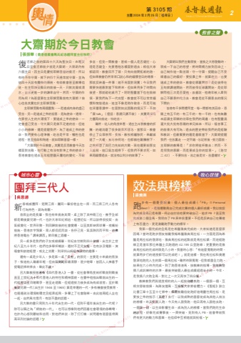 第 3105 期 主曆 2024 年 2 月 25 日(禮拜日) http://ChristianWeekly.net 輿 2情新春親戚團拜,筵開三席,屬同一輩份者坐在一席,而三席三代人各有行為特色,蔚為奇觀。首席坐的是長輩,我也有幸廁身其間,桌上除了其中兩三位,幾乎全部都是戰後嬰兒潮一代。也許大家年紀相若,經歷近似,所以談得很投契,由氣候變化、世界形勢,到回歸前後的社會變遷,以至美斯缺席球賽、夜繽紛措施、香港赤字預算,眾人都侃侃而談,各抒己見,氣氛熱烈而平和,彷彿將香港電台「講東講西」節目搬上酒樓。另一桌多是我們的子女或媳婿輩,年紀由廿餘到四十前後,出生於上世紀八至九十年代,他們也多舉杯暢談,題材不乏兒女經,也有涉及電影、演唱會和旅遊經歷,或北上消費、到深圳山姆超市購物的趣事。還有一桌是少年人,多是第一桌「長者」的孫兒,主要是十來歲的男孩子,惟這枱人雖最年輕,但由頭到尾卻最清靜,甚少喧嘩,皆因人人捧着手提電話掃來掃去,樂此不疲。呂大樂教授曾著有《四代香港人》一書,從社會學角度剖析戰前到戰後直至上世紀九十年代香港人的特性和精神面貌。在書中他指出戰前出生的一代經歷以至目睹戰爭,甚至走過難,但經過努力後多成為有成就者 ; 至於戰後嬰兒潮一代 ( 出生於 1946 至 1965) 算是幸運的一代,多有機會接受教育,也適逢政治環境較穩定及經濟起飛,多攀上了社會階梯。由此這兩組人坐在一起,自然風花雪月,有說不盡的話題。呂大樂的書只寫到九十年代出生的一代,但到千禧年後出生的一代呢?除可以稱之為「網絡的一代」,也可以想像到他們因着社會環境的急轉彎,也許內心感到鬱結和苦悶,對他們來說,除了打打機,試問還有甚麼值得興高采烈討論的話題?跑步 有 一 個 重 要 詞 彙: 個 人 最 佳 成 績(「PB」 = Personal Best),是指運動員自己完成比賽的個人最好成績。我以前認為完成全馬已是奇蹟,何必自討苦吃要突破自己,追求 PB ?直至我完成第二個全馬,我明白了 PB 原來很重要。不但是反映自己在賽道上有否盡力,更是激勵跑手動力的標竿。我第一個完成的全馬是在希臘雅典完成的,大家知道是甚麼原因嗎?當時是跑步朋友鼓勵我報希臘雅典馬拉松,一方面是因為希臘是馬拉松的發源地,雅典馬拉松的起點就是馬拉松鎮,而途經路線正是當年那位希臘士兵跑過的 42.195 公里路線;更重要的是雅典馬拉松的完成時限是八小時。我當時心想:「有這麼寬鬆的時間,就算用步行的速度都可以完成吧!」就是這樣,我在馬拉松和奧運發源地跑完人生的第一個馬拉松。雖然時限寬鬆,但我都盡全力跑,結果在六小時內完成。到了跑香港渣馬,按教練的指導,我能夠發揮八成訓練時的水準,最後突破個人最佳成績超過半小時。今年,是我第八次跑全馬,對比上一次又再快了四分鐘。教練教我們與速度相約的人一起按均速去跑,一個跟一個,互相交替做前鋒,為隊友擋風,互相幫大家節省體力。《聖經》腓立比書三章十五至十七節中,保羅鼓勵信徒跑好這場靈性馬拉松,是要按上帝的指示(真理)去行,以致成熟的基督徒成為其他人效法的榜樣。昨天我跟人跑,今天有人跟我跑,他日再有人跟他去跑,一個跟一個,以生命影響生命,成為別人的榜樣。當我們跑完生命的旅程,好像完成賽事後,一齊突破,見到有人 PB,這會帶給我們有更大的動力和喜樂,在信仰中互相造就與祝福。團拜三代人 效法與榜樣復活節之前的第四十六天為聖灰日,由聖灰日至復活節前夕就是大齋期,大齋期內有六個主日,因主日是慶祝耶穌基督的復活,所以有時不作守齋,餘下的四十天通常就守齋,並為這四十天設有靈修的傳統,有些教會甚至教導信徒,在主耶穌受難日的前後一天,只飲流質或清水,表示更進一步的謙卑自守。然而,守齋的作用為何?為甚麼要在主耶穌受難前有大齋期?核心信息其實在於主耶穌受難。主耶穌受難有兩個重點,一是道成肉身的虛己受苦,另一是達成上帝的旨意,是為使命。通常,在罪世人生的大環境下,要達成上帝的使命,一定會虛己受苦,守大齋只是微不足道的苦,但這小小的修練,還是提醒我們,為了達成上帝的使命,我們要有心理準備,吃苦是平常,犧牲也是過程,甚至捨命和殉道,就如耶穌基督一樣。「大齋期於今日教會」其實是反思教會今天怎樣面對苦難,在行動上有沒有對準上帝的使命?香港教會在過去五年經歷翻天覆地的變化,不需多言,但見一間教會,甚或一個人是否健壯,心理是否健全,先要看他怎樣面對過去;相信大家都認同,教會回不了頭,只有向前開拓新的路,但如果教會仍然常常口說心和的緬懷昔日的場景,那就反映着一件事:她不肯面對現實;今日我們需要快速應對當下和將來,但如果用多了時間向後望,那就磋砣歲月了。明明聖靈當下也在前帥領,要我們為下一代攻堅,教會就不可以常常緬懷和惋惜過去,這並不像是稍作歇息,而是可能在深層意識中,在面對如此困難的境況下,不如「齋 talk」(俚語:意謂只講不做),其實是沒有力量再向前走,怕吃苦。雖然,從人的角度來看,過去五年對教會的折騰,的確消磨了很多銳氣和意志,當那日,教會停止了公眾崇拜,長執、教牧相繼移民,奉獻減退了一大截,無可奈何地,也都躺在羅騰樹下,之前經歷了與巴力先知的大戰,現在還要給那女人追殺,這口氣怎咽得下,但我們不要求死,如果再緬懷過去,就沒有以利沙的故事了。大齋期叫我們主動禁食,當食之大慾發動
