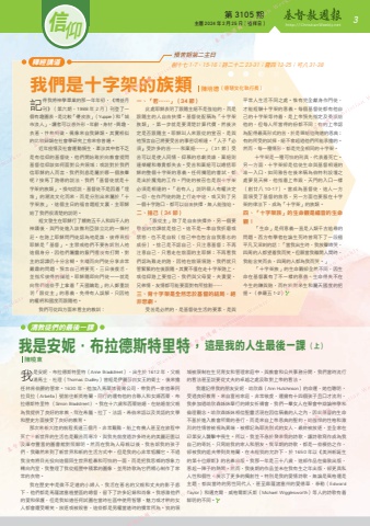 第 3105 期 主曆 2024 年 2 月 25 日(禮拜日) http://ChristianWeekly.net 信 3仰我是安妮.布拉德斯特里特,這是我的人生最後一課 (上)我是安妮.布拉德斯特里特(Anne Bradstreet),出生於 1612 年,父親湯馬士.杜理(Thomas Dudley)曾經是伊麗莎白女王的衛士,後來擔任林肯伯爵的管家。1630 年,他加入馬薩諸賽灣公司,帶我們一家搭乘阿拉貝拉(Arbella)號前往新英格蘭,同行的還有他的合夥人和女婿西蒙.布拉德斯特里特 (Simon Bradstreet)。我在十六歲和西蒙結婚,在結婚前父親為我提供了良好的家教,我在希臘、拉丁、法語、希伯來語以及英語的文學和歷史方面接受了良好的教育。那次來新大陸的航程長達三個月,非常艱難,船上有幾人甚至在旅程中死亡。新世界的生活也是艱苦而寒冷,與我先前度過許多時光的美麗莊園以及庫存豐富的圖書館對照鮮明。然而在我為人母親以後,我告訴我的孩子們,我雖然來到了新世界和新的生活方式中,但是我的心非常牴觸它。不過我沒有將目光投向這個陌生世界粗暴和可怕的一面,而是把我思鄉的想象力轉向內室,我整理了我從經歷中積累的圖像,並用詩歌為它們精心制作了家常的衣物。我在歷史中是微不足道的小婦人,我活在著名的父親和丈夫的影子底下,他們都是馬薩諸塞植墾區的總督,留下了許多記錄和肖像。我感激他們的愛和保護,但是我知道任何試圖在當時社區中使用智慧、魅力或才幹的女人都會遭受嘲笑、放逐或被殺害,這些都是男權當道時的慣常所為。我的領域被限制在生兒育女和管理家庭中,與教會和公共事務分開,我們當時流行的看法甚至說要從丈夫的卓越之處汲取對上帝的看法。我還記得我的朋友安妮·哈欣森(Ann Hutchinson)的命運,她也聰明、受過良好教育、來自富裕家庭,非常敬虔,還擁有十四個孩子且口才流利,我參加過哈欣森姊妹舉行的婦女祈禱會,我們一羣女人在聚會中辯論神學和倫理觀念。哈欣森姊妹相信聖靈活現在因信稱義的人之內,因此基督的生命不基於進入教會所需的善行,而是來自上帝恩典的聖約。她強悍的性格和激烈的性情曾被視為異端,被標記為耶洗別式的女人,最終被放逐,並全家在印第安人襲擊中喪生。所以,我並不急於發表我的詩歌,讓詩歌寫作成為我自己的寄託,只寫給我的家人和朋友。我早期的詩歌,都是一些模仿之作,卻被我的姐夫帶到英格蘭,在未經我的允許下,於 1650 年以《美洲新誕生的第十位繆斯》的名義出版。我那一年是三十八歲,這部作品在倫敦出版,惹起一陣子的熱鬧。然而,我後期的作品並未在我有生之年出版,卻更具私人性和個性,展示了更多的獨創性。特別是我的愛情詩歌,無論是風格還是主題,都與當時的男性同代人,甚至麻薩諸塞州的愛德華.泰勒(Edward Taylor)和邁克爾.威格爾斯沃斯(Michael Wigglesworth)等人的詩歌有着鮮明的不同。預苦期第二主日釋經講道陳曉東清教徒們的最後一課創十七 1-7、15-16;詩二十二 23-31;羅四 13-25;可八 31-38我們是十字架的族類記得我將神學畢業的那一年年初,《博益月刊》(第六期,1988 年 2 月)刊登了一個有趣圖表,是比較「優皮族」(Yuppie)和「城市浪人」,讀者可以憑外形、年齡、身材、興趣、衣著、性格特徵、偶像來自我歸類。其實相似的比較歸類在社會學研究上愈來愈普遍。近年疫情及社會運動頻生,牽涉其中者不乏是有信仰的基督徒,他們開始敢於向教會提問基督信仰該如何面對公共領域;或說對於我們信耶穌的人而言,我們到底是屬於哪一個族羣呢?按馬丁路德的說法,我們「基督徒就是十字架的族類」。換句話說,基督徒不是因着「埋堆」的潮流文化而來,而是分別出來屬於「十字架族」,這個主日的福音題經文裏,主耶穌給了我們很清楚的說明。經文發生在耶穌行了餵飽五千人和四千人的神蹟後,與門徒進入該撒利亞腓立比的一條村莊。在路上耶穌問門徒認為祂是誰,彼得直指耶穌是「基督」。主禁戒他們不要告訴別人祂這個身分,因他們屬靈的竅門還沒有打開,對主的認識仍十分含糊。主繼而向門徒分享非常嚴肅的問題,預言自己將要死,三日後復活,並指斥彼得的攔阻。耶穌隨即向門徒——就是向我們這些手上拿着「天國鑰匙」的人鄭重說明「跟從主」的意義,免得有人誤解,只因祂的權柄和國度而跟隨祂。我們可從四方面來看主的教訓:一、「若……」(34 節)此處耶穌表明了跟隨主絕不是強迫的,而是跟隨主的人自由抉擇。基督徒配稱為「十字架族類」,第一步就是要清楚計算代價,然後決定是否跟隨主。耶穌叫人來跟從的宣召,是與祂預言自己將要受苦的事密切相連。「人子『必須』受許多的苦……和棄絕……」(31 節)受苦可以是使人同情、仰慕的悲劇英雄,棄絕則連榮耀和尊貴都失去。受苦和棄絕可以總括耶穌的整個十字架的意義。任何攔阻的嘗試,都是出於魔鬼的工作。門徒的被召也是與十字架必須是相連的。「若有人」說明個人有權決定一切,在作門徒的路上行走中途,或又到了另一個十字路口,都可以自由抉擇,無人能強迫。二、捨己(34 節)「跟從主」除了是自由抉擇外,另一個要學習的功課就是捨己。這不是一串自我折磨或禁慾,也不是自殺(捨己中也包含自我意志的成份)。捨己是不認自己,只注意基督;不再注意自己,只看走在前面的主耶穌;不再看我們認為難走的路,因祂在前頭領路,我們就只管緊緊的在後跟隨。其實不僅在走十字架路上