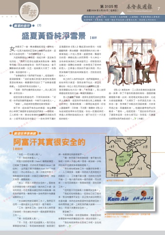 第 3105 期 主曆 2024 年 2 月 25 日(禮拜日) http://ChristianWeekly.net 薈 7萃女侍應呆了一會,轉身鑽進經理室。很快地,一位高大魁梧的巨型紳士向他們走過來,語氣不太友善地問:「你們想幹甚麼?」大姐唯願擋在小弟前面,挑起大樑,直言無忌地回他:「我們只是想在這裏演奏點音樂,賺點零用錢;因為音樂會取消,我們不能演出,拿不到該拿的表演費。況且,這城鎮太冷清了,有點音樂,氣氛會好些。」「音樂會取消?我們都不知道?」經理錯愕,眉頭鎖緊緊:「說好這幾天對面大教堂有免費的黃昏音樂演出,餐廳還特別設計了『音樂會前置晚餐』,怎麼突然取消沒通知?」「是啊,我們也覺得莫名其妙!」四人異口同聲,非常合拍。經理落寞地看着他們,不禁同病相憐。「好吧,你們就到鋼琴邊演奏,今晚不太會有客人。」「謝謝。」四姐弟對他禮貌地微笑點頭。接下來,姐妹倆手執各自的樂器,端坐琴前的小弟彈了幾個單音協助姐姐們調音。一切就緒,三人相視一笑,樂音從唯眷的指縫間涓涓細流而出,小提琴與長笛徐徐跟上,一首純淨得不屬於「你是……尼泊爾人嗎?」「不,我是菲律賓人。」阿富汗首都喀布爾(Kabul)機場候機室,已經拿了登機證,目的地是西邊的 Herat(赫拉特),坐阿富汗最大規模的 Kam Air(卡姆航空)。內心有些忐忑:第一次踏足阿富汗,有點像很多年前第一次踏足北韓的感覺,神祕又負面,戰戰兢兢。「放心,阿富汗其實很安全的!」面前這位菲律賓年輕小姐笑着說。她大約三十歲,說流利英語,也是等着去赫拉特的卡姆航機。她是我們眼所見、機場內唯一沒有用頭巾包裹着頭髮的女士。「你去赫拉特遊玩還是工作?」我們忍不住問,一個外國女士在阿富汗,極不尋常。「工作,當然是工作,沒有太多人來阿富汗旅遊吧!我在赫拉特城外一個美國軍事基地工作。」「嘩,你是美軍人員!」「不,不是,我不是美國軍人。我只是在軍事基地內做工,我是做家務助理,做清潔打掃,有需要也到廚房幫手。」「噢,來阿富汗做家務助理,會不會太危險呢?你家人不擔心嗎?香港、新加坡、沙特阿拉伯不也請很多家務助理嗎?」「我也曾在新加坡工作。這裏好很多啊!一,人工高很多,這裏一年的收入是其他地方的兩年。二,工作量不算太重,住的地方也是不錯。三,每六個月就有一個月假期,可以回家,一年可回家兩次。我剛放完假,現在回來工作。」「但阿富汗不危險嗎?你覺得安全嗎?」「我起初也有點擔心,但現在已住了兩年多,我沒有覺得不安全。反正我大部分時間只在基地裏,市內也沒有甚麼特別值得遊玩的。有時間我會上網,上網是我們最大娛樂。……放心,阿富汗其實很安全的!」要登機了。「你真勇敢,很有冒險精神,我會把你的故事跟家中的菲傭姐姐分享。願主祝福你!」「我也有很多朋友在香港工作呢。主也祝福你們。」混濁塵世的《雪人》飄起潔白的雪花,花絮翩翩飛舞,舞出餐廳,舞過寧靜的大街小巷,漸漸捲起一片迷人雪景。盛夏傍晚,飄着冬日的雪,繚繞在路人的耳際間,令人神往。沒有參與演奏的三弟依窗而立,仰頭發現天空劃過一筆艷紅的晚霞,彷彿看見了肥咚咚的雪人,正牽着小男孩的手漫天飛翔;而小男孩稚嫩可愛的曲奇餅臉蛋兒,活脫脫就是他本人。街上的行人忽然多起來,他們順着樂音,紛紛來到大教堂,發現音樂不在此,相互左顧右盼;有位小男生用食指比向鋼琴的位置,發現寶藏似地大叫一聲:「在那裏!」眾人旋即順着這根食指的方向,蜂擁到餐廳去。客人陸續進了餐廳,使原先昏黃死寂的空間忽然人滿為患,經理和所有侍應生馬上總動員,帶位的帶位,點餐的點餐,一瞬間座無虛席。好些人圍着鋼琴,只聆賞,不消費。動聽的《雪人》,為這城提前帶來白色聖誕,恰似一把魔術掃把,掃盡人世間的陰暗與灰沈,遺下白茫茫一片天堂般的愉悅。盛夏黃昏純淨雪景阿富汗其實很安全的▲阿富汗和鄰國地圖。麗群趙煥明飄零的音符窮遊世界學無窮(7)▲在喀布場的機場候機,目的地是赫拉特,坐阿富汗最大規模的 Kam Air(卡姆航空)。《雪人》演奏結束,三人再合奏幾首浪漫派樂曲。奏畢,除了不會有飢餓感的唯盼,個個都饑腸隆隆作響。此刻,經理嘻皮笑臉走過來,比起大姆指連聲讚:「太精彩了,你們真是天使!先休息一會,我準備了本飯店的頂級晚餐,大家享用過之後,再繼續表演。」他邊說邊帶他們走到餐桌。「還有,」他眨眨眼:「酒店給你們安排了豪華家庭房,住多久都可以,別客氣,只要居住期間為我們演奏就好!」 (待續)飄零的音符(連載小說):四姐弟(大姐唯願、二姐唯盼、中度智障的三弟唯岸、幼弟唯眷)自喪母後,經歷一趟生命成長與心靈醫治之旅;認出路上同行的主。「噢,來阿富汗做家務助理,會不會太危險呢?你家人不擔心嗎?香港、新加坡、沙特「我也曾在新加坡工作。這裏好很多啊!一,人工高很多,這裏一年的收入是其他地方的兩年。二,工作量不算太重,住的地方也是不錯。三,每六個月就有一個月假期,可以回Christian Weekly 零用錢;因為音樂會取消,我們不能演出,拿不到該拿的表演費。況且,這城鎮太冷清了,有點基督教週報大姐唯願擋在小弟前面,挑起大樑,直言無忌地回他:「我們只是想在這裏演奏點音樂,賺點零用錢;因為音樂會取消,我們不能演出,拿不Christian Weekly 侍應呆了一會,轉身鑽進經理室。很快地,一位高大魁梧的巨型紳士向他們走過來,語氣不太友善地問:「你們想幹甚麼?」大