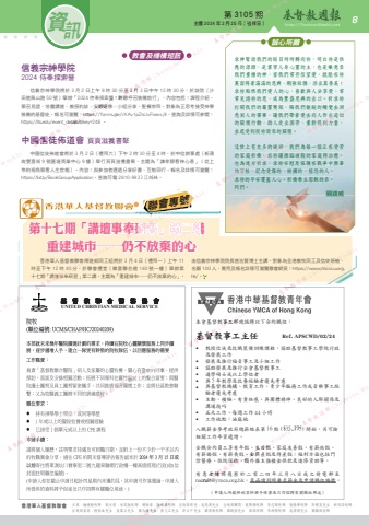 香港華人基督教聯會 主席:鍾健楷牧師 副主席:余英嶽牧師 總幹事:陸幸泉牧師 出版部部長:吳思源先生 出版部顧問:翁傳鏗牧師 李志剛牧師 張振華牧師 許朝英先生 胡明添牧師 出版部委員:植栢燊先生 吳業立先生 蘇永權先生 黃文江先生 許立中先生 鄺偉衡牧師 關銳煊先生 梁銘牧師 李鴻標牧師 吳渭濱先生 關鎮威牧師第 3105 期 主曆 2024 年 2 月 25 日(禮拜日) http://ChristianWeekly.net 資 8訊求神幫助我們的眼目時時轉向祢,明白祢是供應的源頭,是掌管人身心靈的主,也是樂意負我們重擔的神,當我們常存信望愛,就能在祢裏面得着滿滿的恩典,剛強壯膽,活出真善美!求祢點燃我們愛人的心,喜歡與人分享愛、常常見證祢的恩,成為豐盛恩典的出口。祈求祢打開我們的屬靈雙眼,賜我們敏銳的觸覺去洞悉別人的需要,讓我們帶着愛去向人作出適切的關懷行動,助人走出困苦、重新得到力量,並感受到從祢而來的關懷。這世上有太多的破碎,我們為每一個正在受苦的家庭祈禱,求祢讓瀕臨破裂的家庭得治癒。也為遠方祈求,求祢安慰及保護在戰爭中無辜的百姓,記念受傷的、被擄的、惶恐的人。求祢的平安覆蓋人心。祈禱奉主耶穌的名。阿們。關鎮威教會及機構短訊誠心所願信義宗神學院 2024 侍奉探索營信義宗神學院將於 3 月 2 日上午 9 時 30 分至 3 月 3 日中午 12 時 30 分,於該院(沙田道風山路 50 號)舉辦「2024 侍奉探索營:聆聽呼召裝備前行」,內容包括:課程介紹、蒙召見證、培靈講道、教授約談、安靜退修、小組分享、聖餐崇拜。對象為正思考接受神學裝備的基督徒,報名可瀏覽:https://forms.gle/rXAv1pZsUvFsecsj9,查詢及詳情可參閱:https://lts.edu/event_details?pkey=248 。中國信徒佈道會 頁頁滋養書聚中國信徒佈道會將於 3 月 2 日(禮拜六)下午 2 時 30 分至 4 時,於中信辦事處(新蒲崗雙喜街 9 號匯達商業中心 9 樓)舉行頁頁滋養書聚,主題為「謙卑靜看神心意」(從上帝的視角察看人生世態)。內容:與參加者透過分享好書,互勉同行。報名及詳情可瀏覽:https://bit.ly/BookGroupApplication,查詢可電 2810-9933 江姊妹。資訊第十七期「講壇事奉研習」第二講重建城市──仍不放棄的心香港華人基督教聯會傳道部同工組將於 3 月 4 日(禮拜一)上午 11時至下午 12 時 40 分,於聯會禮堂(樂富聯合道 140 號一樓)舉辦第十七期「講壇事奉研習」第二講,主題為「重建城市──仍不放棄的心」,由信義宗神學院院長曾浩賢博士主講。對象為全港教牧同工及信徒領袖,名額 100 人,費用及報名詳情可瀏覽聯會網頁:https://www.hkcccu.org.hk/。https://bit.ly/BookGroupApplication,查詢可電 2810-9933 江姊妹。第十七期「講壇事奉研習」第二講聯會專號本會基督教事工部現誠聘以下合約職位:基督教事工主任 Ref. APSCWD/02/24w 教授信徒及牧職裝備訓練課程,協助基督教事工學院行政及發展工作 w 發展及推行福音事工及小組工作 w 協助發展及推行全會基督教事工 w 道學碩士或以上學位者 w 具 5 年教學及牧養經驗者優先考慮 w 具基督教機構、教育工作、青少年服務工作或音樂事工經驗者優先考慮 w 主動、積極、有責任感、具團體精神、良好的人際關係及溝通技巧 w 五天工作、每週工作 44 小時w 工作地點:油麻地入職薪金參考政府總薪級表第 16 點 ($35,775) 開始,另可按相關工作年資遞增。全職合約員工享有年假、生日假、家庭友善假、有薪病假、有薪婚假、有薪喪假、全薪產假及侍產假;福利方面包括門診醫療、住院保險、額外僱主強積金供款及進修資助等。有意者請將履歷於二零二四年三月八日或之前電郵至[email protected]。來函請列明要求薪金及申請職位編號。(申請人所提供的資料將予保密及只作招聘有關職位用途) 一年制全職「見習院牧」(職位編號: UCMS/CHAP/HCT/20240204崗位職責: 以服務及學習為本,全職於本機構院牧部掌握體驗「院牧職事」的真諦 在「基督教聯合醫院」內服務,關懷病人、其家屬及院內同事,提供探訪,面談及安排相關活動;本部提供督導學習 在社區聯繫及牧關義工培訓籌辦上參與及累積經驗 職位要求及福利: 有志於了解及體驗「院牧職事」的牧者或神學畢業生,無需相關經驗 持有神學學士學位,或同等學歷;具 CPE 課程資歷者優先 若未有 CPE 課程的資歷,期內可享有一單元初級課程的資助 合約為期 1 年,由 2024 年 9 月 1 日至 2025 年 8 月 31 日止。 本機構提供基本薪酬,強積金,14 天有薪年假及員工及家屬醫療等福利 申請手續:請繕個人履歷,證明文件副本,註明可到職日期,並附上一份不少於一千字的異象見證,對院牧認識及抱負的分享,須教會牧師推薦及二位諮詢人,期望參與的緣由等。於 2024 年 4 月 28 日或以前寄往將軍澳坑口寶寧里二號九龍東聯網行政樓一樓高級經理(行政)收(信封面註明職位編號)。 (申請人如在截止申請日起計四星期內未獲約見,其申請可作落選論。 申請人所提供的資料將予保密及只作招聘有關職位用途。) 基 督 教 聯 合 醫 務 協 會UNITED CHRISTIAN MEDICAL SERVICE 刊登日期: 2024 年 2 月 4 日Christian Weekly 中國信徒佈道會 基督教週報 Christian Weekly 田道風山路 50 號)舉辦「2024 侍奉探索營:聆聽呼召裝備前行」,內容包括:課程介紹、蒙召見證、培靈講道、教授約談、安靜退修、小組分享、聖餐崇拜。對象為正思考接受神學裝備的基督徒,報名可瀏覽:https://forms.gle/rXAv1pZsUvFsecsj9,查詢及詳情可參