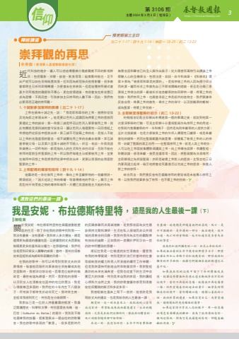 第 3106 期 主曆 2024 年 3 月 3 日(禮拜日) http://ChristianWeekly.net 信 3仰我是安妮.布拉德斯特里特,這是我的人生最後一課 (下)關於我安妮.布拉德斯特里特在麻薩諸塞植墾區的生活,除了你在我的詩歌中找到我——我沒有畫像、沒有墓碑。我和家人多次遷徙,總是選擇更為偏遠的邊疆地區,以便讓我的丈夫西蒙能夠積累更多財產和政治權力。在那個時候,我們很容易受到印第安人襲擊的威脅;當時,富裕的清教徒家庭經常成為綁架和索贖的目標。在我的詩歌中,你可以感受到我對丈夫的深厚情感。每當他因殖民地事務前往英格蘭或其他定居點時,我都深切想念他。西蒙是位能幹的執政官,最終被選為總督。然而,我對他的感情,以及對女人在清教徒社區中的地位的看法,我是心情複雜且多面的。我們在約十年內生下八個孩子,所有孩子都幸免於幼年死亡。我時常生病,並經常預感到死亡,特別是在分娩期間。我對自己是一位詩人持着嚴肅的態度。我廣泛閱讀歷史、科學和文學,特別喜愛吉烏梅·迪·巴塔(Guillaume du Bartas)的著作。我孜孜不倦地磨練我的技藝,逐漸發展出一個自信的詩歌聲音。我在詩歌中表現的「歉意」,很多是對時代的反諷修辭而非真誠道歉,是對那些認為女性應該保持沈默和謙遜,生活在私人領域而非公共領域的清教徒的回應。我對待我作為女性的觀點帶有絲絲的幽默,正如我的一首關於伊莉莎白一世的詩中所體現的那樣。請記住我是一位敬虔的女性清教徒,儘管我有我的神學質疑,特別是對於流行於當時的社會等級制度的權力和男人所表達的嚴苛工作神觀,但是我熱愛神所創造自然和物質世界。我對聖經應許的未來充滿希望,但我也從當下的生活中收獲巨大的快樂,特別是來自我的家庭、我的讀經心得和大自然之美,我的詩歌會讓你感受到清教徒信仰實踐的鮮活和多姿多彩。我曾經躺在產床上寫下一首詩,這首詩是我寫給丈夫的遺言,也是我給你的人生最後一課:親愛的,這一刻在產床上,我把我的心靈寫成這首詩,希望能成為我的最後遺言。生活的脆弱性,尤其是在我們這個時代,讓我深切體會到,死亡的陰影隨時都可能降臨。在這一刻,我想告訴你,生命中所有事物都有盡頭,逆境總是伴隨着我們的喜悅。死亡,是不可撤銷的,是命運的一部分,無法避免。我不知道,死亡何時會降臨,也不知道你是否會失去你的摯愛。我為你和我所擁有的一切,祈求上帝的庇佑。如果我無法看到生命中應有的那麼多日子,那麼就讓自然和上帝賜予你和我應有的。那些我深知擁有的許多缺陷,就讓它們被埋在我的被遺忘之墓中吧。如果我在你的記憶中留下了任何價值或美德,就讓這些價值和美德永遠生動地存在於你的記憶中。當你不再感到悲傷,就像我不再受傷害一樣,仍然愛護着你的逝去的妻子,她曾長時間躺在你的懷中。當你續婚以後,請關心着我的小孩,我的珍貴的遺產。如果你愛自己,或曾愛過我,請保護他們免受繼母的傷害。如果這首詩不幸流入你的眼中,用一些悲傷的嘆息來榮耀我的離世,並為了我深情地告別,親吻這張紙,因為它是我最後的告別,伴隨着鹹鹹的淚滴。預苦期第三主日釋經講道陳曉東清教徒們的最後一課出二十 1-17;詩十九 1-14;林前一 18-25;約二 13-22崇拜觀的再思近代科技的進步,讓人可以透過傳播媒介隨處觀賞不同的影視節目;包括電影、球賽、旅遊、飲食等等;毋需費時前往,足不出戶就可以如在現場親歷其境。近年因為新冠肺炎疫情影響,很多教會都將主日崇拜即場轉播,方便會友在家參與。但是這種崇拜模式會產生崇拜態度的隨便和不專心,更在疫情過後,有些會友在家收看已成為習慣,不再回堂,引致參加主日崇拜的人數下降。因此,我們有必要再思正確的崇拜觀。1. 十誡對參加崇拜的教導(出二十 1-17)上帝在頒佈十誡之先,說:「我是耶和華你的上帝,曾將你從埃及地為奴之家領出來。」這是要以色列人認識因為得蒙上帝的拯救而要遵從上帝的誡命;第一和第二誡是呼召以色列人單單敬拜上帝,與此有關就是第四誡的當守安息日,讓以色列人每週要有一日回想起上帝將他們從奴役中拯救出來。第三誡不可妄稱上帝的名,是指人不能以上帝的名發虛假的誓言,或不誠實地用上帝的名義去做事。第五誡當孝敬父母,以及第六至第十誡的不可殺人、奸淫、偷盜、作假見證和貪戀人一切所有的,都是指向人的生活和生命的清潔,否則不能在崇拜時面對全然聖潔的上帝。所以我們每逢主日都要敬拜上帝,並要在敬拜中回想上帝是將我們從罪中拯救出來,更要以清潔的自我面對聖潔的上帝。2. 上帝配得的尊崇和敬拜(詩十九 1-14)這篇詩是一首在敬拜上帝時,像向上帝呈獻祭物的一首獻祭詩。開頭就說:「諸天述說上帝的榮耀,穹蒼傳揚祂的手段。」顯示上帝是配得所有受造之物的尊崇和敬拜。天體已見證創造主大能的作為,無需言語和聲音已向全人類作出啟示;從太陽普照萬物引出講論上帝察驗人心的全備律法,包括法度、訓詞、命令和典章。《和修本》譯第 9 節為「敬畏耶和華是純潔的」,是指崇敬上帝的人因為遵守律法而純潔。繼而祈求上帝赦免自己不察或隱瞞的過錯,甚至是任隨己意蔑視上帝律法的罪。最後祈求這首獻祭詩如同祭物一樣,得蒙上帝的悅納。我們崇拜上帝,也應當承認上帝是超然的造物主,我們要謙卑反省自我,倚靠上帝的赦免,尋求上帝的保守,以