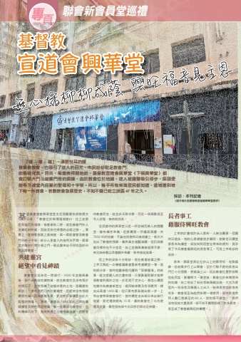 專 聯會新會員堂巡禮 頁基督教宣道會興華堂堂主任張觀運牧師曾撰文分享:「教會位於柴灣連城道口,往上走便是哥連臣角墳場。每逢春秋二祭,就是教會門外人流最旺的時候,因這是前往掃墓的必經之路。」事實上,當掃墓者踏上連城道,第一眼就會瞥見教會門外的十字架,部分人更會入內借用洗手間,興華堂亦樂於打開方便之門,藉此讓來自不同地區的市民認識教會。共建靈宮 絕望中看見神蹟教會堂址前身是一間銀行,2000 年金融風暴後,銀行出售該地鋪物業,就在教會完全沒有預計的情況下,上帝預備了這幅珍貴的土地。張觀運牧師說:「當時我們已有計畫擴堂,但從來沒有想過購買地鋪,因為價錢太貴,更沒有打算購買如此大面積的物業。」原來,教會自 1994 年起已開始籌錢擴堂及物色同區物業,惟一直難覓合適堂址,豈料機緣巧合下,竟突然遇上心儀物業放盤。但對當時教會而言,這並非天降甘霖,而是一項兩難甚至令人苦惱、無奈的消息。全因當時的興華堂只是一所容納百餘人的閱覽室,雖有擴堂準備,但要購買一所樓高兩層、共7000 呎的地鋪,不論在財務和日後規畫上,都大大超出了教會的預算。雖然業主連翻減價,但仍與教會目標存在不少差距,加上金融風暴後經濟不景,弟兄姊妹難以承擔額外奉獻,惟有被迫放棄。但上帝的安排十分奇妙,就在教會放棄之際,上帝又興起一次機會讓教會重新考慮購堂一事。張牧師分享,當時他靈修剛巧讀到「耶穌履海」的故事,經文提醒人的力量有限,只要靠着耶穌才能帶領教會到應許之地。於是他下定決心,憑信心購買地鋪作為教會新堂址,連同裝修費及各項費用,總支出高達 1400 萬。但只要有勇氣踏出第一步,上帝自會帶領教會前行,當時購堂支出部分來自銀行借貸,原定還款期為 15 年,最終教會在 7 年內便還清欠債,難怪張牧師今天回想仍稱這是神蹟。長者事工 藉服侍興旺教會上帝的計畫或許出人意料,人無法籌算,但隨時日過去,祂的心意總會逐步顯明。就像昔日購堂原意本為擴堂,卻沒料到因堂址帶來的便利,竟孕育了今天教會最興旺的長者事工,可見上帝奇妙的安排。原來,興華堂原址位於山上的舊屋邨,地點偏僻,信徒需步行上山聚會;至於行動不便的長者出門已十分困難,更遑論上山,因此教會位置對招聚信徒而言,影響極大。遷堂後,教會位於柴灣鬧市的地鋪,加上增設了斜台等無障礙設施,大大方便區內一眾長者及傷健人士出入。結果長者信徒愈來愈多,教會甚至為他們多開一場崇拜,現時長者崇拜人數已發展至約 80 人。張牧師不諱言:「我們沒有投放大量資源,卻不知不覺間吸納了許多長者,甚至成了教會最興旺的羣體。」頁採訪:本刊記者(部分相片由基督教宣道會興華堂提供)「噹 ... 噹 ... 噹」,清脆悅耳的鐘聲響徹教會,也吸引了途人的目光,市民紛紛駐足教會門前看過究竟。原來,每當崇拜開始前,基督教宣道會興華堂(下稱興華堂)都會打開大門及敲響門旁的銅鐘,由於教會位於地鋪,途人被鐘聲吸引停步,探頭便能看見禮堂內莊嚴的聖壇和十字架。所以,幾乎所有柴灣居民都知道,連城道斜坡下有一所教會,若數教會發展歷史,不知不覺已屹立該區 47 年之久。Christian Weekly 基督教週報 Christian Weekly 基督教週報 Christian Weekly 基督教週報 Christian WeeklyChristian Weekly 下有一所教會,若數教會發展歷史,不知不覺已屹立該區 47 年之久。 基督教週報會打開大門及敲響門旁的銅鐘,由於教會位於地鋪,途人被鐘聲吸引停步,探頭便能看見禮堂內莊嚴的聖壇和十字架。所以,幾乎所有柴灣居民都知道,連城道斜坡下有一所教會,若數教會發展歷史,不知不覺已屹立該區 47 年之久。Christian Weekly 「噹 ... 噹 ... 噹」,清脆悅耳的鐘聲響徹教會,也吸引了途人的目光,市民紛紛駐足教會門前看過究竟。原來,每當崇拜開始前,基督教宣道會興華堂(下稱興華堂)都會打開大門及敲響門旁的銅鐘,由於教會位於地鋪,途人被鐘聲吸引停步,探頭便基督教週報 Christian Weekly 基督教週報 Christian Weekly 基督教週報 Christian Weekly 基督教週報後,銀行出售該地鋪物業,就在教會完全沒有預計的情況下,上帝預備了這幅珍貴的土地。張觀運牧Christian Weekly 絕望中看見神蹟教會堂址前身是一間銀行,2000 年金融風暴後,銀行出售該地鋪物業,就在教會完全沒有預計基督教週報 Christian Weekly 堂亦樂於打開方便之門,藉此讓來自不同地區的市全因當時的興華堂只是一所容納百餘人的閱覽室,雖有擴堂準備,但要購買一所樓高兩層、共7000 呎的地鋪,不論在財務和日後規畫上,都大大超出了教會的預算。雖然業主連翻減價,但仍與教基督教週報時教會而言,這並非天降甘霖,而是一項兩難甚至全因當時的興華堂只是一所容納百餘人的閱覽時教會而言,這並非天降甘霖,而是一項兩難甚至 Christian Weekly 採訪:本刊記者基督教週報 Christian Weekly 基督教週報基督教週報 Christian Weekly 基督教週報借貸,原定還款期為 15 年,最終教會在 7 年內便還清欠債,難怪張牧師今天回想仍稱這是神蹟。Christian Weekly 帝自會帶領教會前行,當時購堂支出部分來自銀行借貸,原定還款期為 15 年,最終教會在 7 年內便信徒而言,影響極大。遷堂後,教會位於柴灣鬧市的地鋪,加上增設了斜台等無障礙設施,大大方便區內一眾長者及傷健人士出入。結果長者信徒愈來愈多,教會甚至為他們多開一場崇拜,現時長者崇基督教週報