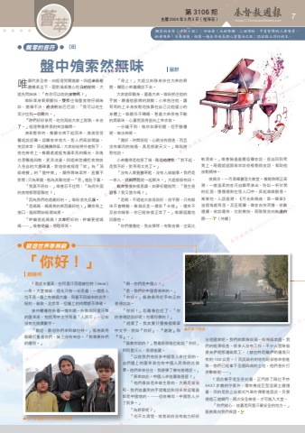 第 3106 期 主曆 2024 年 3 月 3 日(禮拜日) http://ChristianWeekly.net 薈 7萃唯願代表全家,向經理莞爾道謝。四姐弟沿着圓餐桌坐下,面對滿桌賞心悅目的佳餚,大姐先問妹妹:「有你可以吃的食物嗎?」唯盼渾身簌簌顫抖,雙眼往每盤食物仔細端詳,猶豫不決,最後結結巴巴說:「我可以吃生菜沙拉和一些雞肉。」「你們好好享用,吃完再給大家上甜點,辛苦了。」經理帶着得意的笑容離開。演奏暫停時,餐廳彷彿下起雨來,滴滴答答響起說話聲。語聲愈來愈大,客人們高談闊論、笑話家常,蒸起騰騰熱氣;大家紛紛將外套脫下,搭在椅背上。餐廳處處搖曳着柔亮的燭光,玫瑰花香飄逸四散,更添浪漫。四姐弟陸續把食物放入各自的大圓碟裏,對這些被經理「吹」為「頂級晚餐」的「盤中飧」,顯得興味索然,直覺不對胃;只為果腹,勉為其難地逐一「吞」進肚子裏。「我真不明白,」唯眷忍不住問:「為何外面的食物都那麼難吃?」「因為我們吃過最好的。」唯盼首先反應。「是媽媽,媽媽煮的東西最好吃!」唯岸馬上接口,腦部開始暗潮洶湧。「幹嘛提起媽媽?大家好好的,幹嘛要提媽媽⋯⋯」唯眷哽咽,怒瞪哥哥。T 酒店 9 層高,在阿富汗西陲赫拉特(Herat)一角。大堂微暗,燈光只有一半亮着,一個客人也不見。牆上有幾個大鐘,寫着不同城市的名字:紐約、倫敦、北京等,但鐘上的時間都不準確。接待櫃檯旁掛着一塊木牌,外幣與阿富汗幣的匯率表,包括用中文字寫着「人民币」,但卻沒有兌換價數字。「歡迎,歡迎你們來到赫拉特。」服務員用眼睛打量着我們,臉上沒有笑容。「我需要你們的護照。」「啊,你們是中國人?」「是,我們從中國香港來的。」「你好!」服務員用近乎純正的普通話說。「你好!」距離像拉近了,「你的普通話很好呢!在哪兒學的?」「過獎了,我其實只懂幾個簡單中文字,例如『你好』、『謝謝』和『早』。」「誰教你說的?」看着眼前這位能說「你好」的阿富汗人,很感雀躍。「以前我們有很多中國客人來住宿的。我們牆上的匯率表也有中國人民幣的兌換價。他們來來往往,我便學了幾句普通話。」「原來如此。中國人來這裏做甚麼?」「他們應該是來做生意的,大概是貿易吧,我們這裏用的手提電話和很多家庭電器都是中國造的,⋯⋯但這幾年,中國客人少了很多。」「為甚麼呢?」「也不太清楚,或者政府沒有能力好好治理國家吧。我們的軍隊很弱,很倚賴美國。我們的經濟很差,很多人沒有工作,不少人冒險偷渡去伊朗那邊做黑工,(赫拉特距離伊朗邊境只有約 100 公里。)而反政府的塔利班卻愈來愈進取,他們已經拿下全國四成的土地,他們善於打游擊戰呢⋯⋯」T 酒店幾乎是全密封着,正門除了兩位手持AK47 步槍的守衛外,還有幾座巨型混凝土牆擋着,目的是防止自殺式汽車炸彈衝進酒店。另要通過三道鋼門、兩次安全檢查,才可進入大堂。「你們放心,這裏是阿富汗最安全的地方。」服務員向我們保證。「停止!」大姐立刻移身扶住大弟的肩膀,攔阻小弟繼續說下去。大家旋即動身,圍着大弟。唯盼抓住他的手腕,聽着他脈搏的跳動;小弟抱住他,讓哥哥的上半身放鬆地挨靠在自己比他瘦小的身體上。唯願目不轉睛,看着大弟停格不動的黑眼珠,心裏慌張得直向上帝求救。一分鐘不到,唯岸如夢初醒,但手腳僵硬,無法伸展。「還好,時間很短,心跳沒有過速,而且沒有劇烈的抽搐,真是感謝天父。」唯盼欣慰地說。小弟覺得是他惹了禍,難過地道歉:「對不起,是我不好,對哥哥太兇了。」「沒有人需要對不起,沒有人做錯事。我們是一家人,遇到問題就一起解決。」大姐振振有詞。唯岸慢慢恢復意識,如夢初醒般問:「發生甚麼事?我又發作嗎?」「是啊,不過這次表現很好,很平靜,只有眼珠不會轉動,像海派星一樣很『卡通』,還來不及給你錄影,你已經恢復正常了。」唯願逗趣地回應他。「你們慢慢吃,我去彈琴,有點音樂,空氣比盤中飧索然無味「你好!」 ▲阿富汗街道。麗群趙煥明飄零的音符窮遊世界學無窮(8)的阿富汗人,很感雀躍。我們牆上的匯率表也有中國人民幣的兌換價。他們來來往往,我便學了幾句普通話。」吧,我們這裏用的手提電話和很多家庭電器都是中國造的,⋯⋯但這幾年,中國客人少了很多。」▲孩子冒着嚴寒住在簡陋的帳篷。較清新。」唯眷臉羞羞壓低聲音說,逕自回到琴凳上。兩個姐姐跟唯岸說些輕鬆俏皮話,幫助他放鬆精神。夜微涼,一月清輝灑落大教堂。餐館熱鬧正高潮,一道溫柔的音河自鋼琴滲出,恰似一杯甘潤的紅酒,慢慢啜飲在客人口中,昇起微微醉意。漸漸地,人語退潮,《月光奏鳴曲:第一樂章》溢過每處角落。及至尾聲,樂音由快而慢,欲斷還續、欲說還休,沈寂幾拍,再殘殘流向無邊的靜⋯⋯ (待續)飄零的音符(連載小說):四姐弟(大姐唯願、二姐唯盼、中度智障的三弟唯岸、幼弟唯眷)自喪母後,經歷一趟生命成長與心靈醫治之旅;認出路上同行的主。▲阿富汗街道。Christian Weekly 了。」經理帶着得意的笑容離開。基督教週報詳,猶豫不決,最後結結巴巴說:「我可以吃生菜沙拉和一些雞肉。」「你們好好享用,吃完再給大家上甜點,辛苦Christian Weekly 願代表全家,向經理莞爾道謝。四姐弟沿着圓餐桌坐下,面對滿桌賞心悅目的佳餚,大姐先問妹妹:「有你可以吃的食物嗎?」唯盼渾身簌簌顫抖,雙眼往每盤食物仔細端詳,猶豫不決,最後結結巴巴說:「我可以吃
