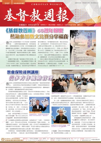 編輯及發行人:香港華人基督教聯會 督印人:陸幸泉 地址:九龍聯合道140號香港華人基督教聯會大樓二樓 電話:2337 4171 圖文傳真:2338 2314網 址:http://ChristianWeekly.net 電子郵箱:[email protected] 承 印:國強印刷制作公司 作者文責自負3107 2024年3月10日 逢禮拜日出版.本期出紙二張半.每份零售五元正本期推介 基督徒的現實主義.施德藩 p4 ∣真正的尊重.李碧如 p.6 ∣全家送走遠大前程.麗群 p.7教會保險條例講座從多方作風險管理《基督教週報》60週年報慶鼓勵參加徵文比賽分享福音香港華人基督教聯會教育部教牧及長執支援組舉辦「教會保險條例講座」,由曾任保險公司資深區域總監及行政顧問、特區政府保險業培訓顧問委員會委員劉國明先生,以及符致鍇律師從教會管理角度,講解教會財物、公眾責任、僱員補償保險等所涉責任及條例。符致鍇律師鼓勵堂會要自立登記,因為早年宗派教會由法例成立,及後的就改用有限公司、社團或慈善團體方式成立,如各堂會分開登記,有問題時就可分開處理。他提醒,不少教會都是由執事擔任董事,他們應了解其董事責任,特別是新公司法開始後,每年均須舉行會友週年大會。「以往遲交公司週年財務報表只會出信提醒,有時拖一年、兩年、三年都沒有事,最多罰錢。但今年再也不同,屬刑事罪行,要上法庭處理。」他指,曾有客戶未在42日內交回週年財務報表,第46日已收到公司註冊處告票,最後罰款連律師費逾萬元;也有機構在疫情期間未留意到報稅,結果被取消了「88牌」(免稅慈善團體);此外,所有法定文件及表格,特別是新增的「重要人物表格」,如突擊檢查時未能提交,亦有可能被處罰。他指,近日有不少教會機構收到消防署通知不符合消防要求,需要作出處理,所以防火牆和走火通道也要多加留意,他建議教會應派員參加業主立案法團,熟悉大廈情況。符律師指出,有教會希望購置工廈來做堂址,但他提醒需要查看官批、入伙紙(樓宇用途)、大廈公契(業主和管理處的關係),「港英政府年代隻眼開隻眼閉,讓教會可以在住宅、工商業鋪辦教會,但嚴格而言是不合規的,沒有一項條例清楚寫明可以辦教會,除非是獨立建築物。」另一方面,他勸籲教會應做良心僱主,例如為年資較長的同工提供比一般僱主更高的強積金供款比率,讓他們在退休後過一個較為合理的生活,「有些同工在任時住教會宿舍,但退休無準備就很可憐。」他續提到要留意歧視條例、個人資料(私隱)條例、防止賄賂條例,如「車敬」是否有上報?應該要協調清楚,如有不明白,可向相關機構了解求助。他勉勵:「希望教會不止做得好,而是做得比其他人好。」 劉國明先生從教會管理角度,提醒可從職員同工薪酬福利、長老執事外訪、教會資產、戶外及外訪活動四方面留意風險管理,是否購入足夠保險。他提醒,當提出保險索償時,應詳細閱讀保險合約內容,在報案時間內確保提供正確資訊,收集及保存相關證據,與保險公司聯繫索償,保留及複製文件副本,有疑問時與專業人士諮詢。來自不同堂會的教牧同工出席,了解教會保險條例。劉國明先生以教會管理角度,提醒教會要從多方面作風險管理。香港華人基督教聯會於1964年創辦《基督教週報》,一直秉持報道基督教消息、培育基督徒靈性、宣揚基督教真理三大宗旨,多年來鼓勵信徒閱讀屬靈刊物以增長靈命,同時透過寫作分享信仰人生,在文字事工上作出貢獻。適逢《基督教週報》60週年鑽禧報慶,聯會特別舉辦徵文比賽,鼓勵信徒加入寫作行列,彼此共勉發揮文字事工傳揚福音的使命。參賽者可選主題「基督教文字事工與我」或「《基督教週報》與我」,每位參賽者只可提交一篇(800-1000字)文章,作品可自訂題目,但必須符合主題。為確保評審公正,提交的作品不得載有可識別參賽者及/或所屬教會的名稱、標記或其他記認。在評審過程中,所有提交的作品均不予具名。比賽作品中將選出冠軍一名(獎金港幣3000元);亞軍一名(獎金港幣2000元);季軍一名(獎金港幣1000元)及優異獎三名(每名獎金港幣500元)。 評審準則包括內容(50%)、結構(25%)及修辭(25%)。徵文比賽評審團由吳思源先生、張振華牧師、鄺偉衡牧師、許立中先生及吳渭濱先生擔任。徵文比賽現已開始接受參賽作品,截止收稿日期為6月30日,並將於9月公布結果及頒獎。有關參賽辦法、比賽章程及規則,可瀏覽:www.christianweekly.net,查詢可電2337-4171。符致鍇律師指,管理層應熟悉與教會相關之法例及政府要求,避免違法。Christian Weekly 香基督教週報 鼓勵參加徵文比賽分享福音 Christian Weekly 基督徒的現實主義.施德藩 p4 ∣真正的尊重.李碧如 p.6 ∣全家送走遠大前程.麗群 p.7《基督教週報》60週年報慶鼓勵參加徵文比賽分享福音基督徒的現實主義.施德藩 p4 ∣真正的尊重.李碧如 p.6 ∣全家送走遠大前程.麗群 p.7 基督教週報 Christian Weekly 基督教週報 Christian Weekly 逢禮拜日出版.本期出紙二張半.每份零售五元正Christian Weekly 從多方作風險管理 基督教週報教會保險條例講座從多方作風險管理教會保險條例講座 Christian Weekly 合主題。為確保評審公正,提交的作品不得載有可基督教週報徵文比賽現已開始接受參賽作品,截止收稿(800-1000字)文章,作品可自訂題目,但必須符合主題。為確保評審公正,提交的作品不得載有可日期為6月30日,並將於9月公布結果及頒獎。有關參賽辦法、比賽章程及規則,可瀏
