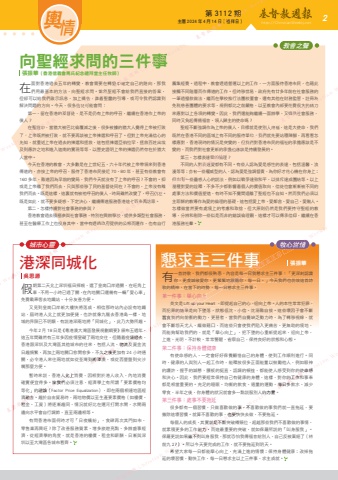 第 3112 期 主曆 2024 年 4 月 14 日(禮拜日) http://ChristianWeekly.net 輿 2情假期第二天北上深圳福田探親,選了皇崗口岸過關,在旺角上車,不用一小時已過了關,在內地關口還備有一輛「愛心車」免費載乘客去地鐵站,十分友善方便。又見到皇崗口岸新大樓快將落成,相信那時站內必設有地鐵站,屆時港人北上就更加便捷,也許就像九龍去香港島一樣,地域的界限已不明顯,有說港深兩地將「同城化」,此乃大勢所趨。今年2月18日是《粵港澳大灣區發展規劃綱要》頒布五週年,這五年間雖然有三年多因疫情窒礙了兩地交往,但隨着疫情過去,香港跟深圳及大灣區其他城市的往來,包括人流、物流及資金流日趨頻繁,再加上兩地關口愈開愈多,不久之後更加有 24 小時通關,必令港人來往兩地就如從荃灣到將軍澳,或從西營盤到尖沙嘴那麼方便。暫時來說,香港人北上消費,因相對於港人收入,內地消費確實便宜得多。惟我們必須注意,經濟學上有所謂「要素價格均等化」的理論(Factor Price Equalization),即在兩個相連地區經濟融合、趨於自由貿易時,兩地物價以至生產要素價格(如樓價、租金、工資)將逐漸趨同,情況就好比在運河打開水閘,水閘兩邊向水平會自行調節,直至兩邊相等。有問香港市面何時才可「日夜繽紛」,食肆再次其門如市,零售業再興旺?除了改善服務質素、增多旅遊亮點、多辦盛事經濟,從經濟學的角度,就是香港的樓價、租金和薪酬,日漸與深圳以至大灣區各城市看齊。有一首詩歌,我們都很熟悉,內容是每一日我懇求主三件事:「更深刻認識你,更虔誠敬愛你,更緊緊地跟隨你,每一日。」今天我們也仿效這首詩歌的精神,在當下的時勢,每一日懇求主三件事。第一件事:舉心向上英文是Lift up your Heart ,即提起自己的心,迎向上帝。人的本性常常犯罪,而犯罪的結果是向下墜落,狀態低沈,小信、沈溺難自拔。這些壞因子會不斷蠶食我們向前衝的動力,更甚者,當我們自覺缺乏動力時,為了轉移視線,就會不斷怨天尤人、編做藉口,而這些只會使我們陷入更痛苦、更無助的境地,而能夠幫助我們的,就是「舉心向上」,把下墜的心重新提起來,迎向上帝,上進、光明、不計較、常常警醒,省察自己,保持良好的狀態和心態。第二件事:保持身體健康有使命感的人,一定會好好保養顧惜自己的身體,使到工作順利進行。同時,健康的人與別人一起工作時,能釋放很多正面能量以鼓勵他人,例如眼神的讚許、握手的誠懇、腰板的挺直、語調的頓挫,都能使人感受到你的使命感和決心。因此,我們要經常保持自己有健康的身體,這樣,對你的工作和事奉都是相當重要的。充足的睡眠、均衡的飲食、適量的運動、每日多飲水、減少零食,半年之後,你身體的狀況就會多一點說服別人的力量。第三件事:處事不要拖延很多都有一個習慣,只做喜歡做的事,不喜歡做的事我們就一直拖延,要撇除這壞習慣。就算不喜歡的事,也要快快去做,不要拖延。每個人的成長,其實就是不斷突破樽頸位,超越那些我們不喜歡做的事情,就累積更多的工作能力,而這最重要的突破,就如保羅所說的「叫身服我」。保羅更說如果做不到叫身服我,那就恐怕我傳福音給別人,自己反被棄絕了(林前九 27)。所以今天要完成的工作,就不要拖延到明天。希望大家每一日都能舉心向上,充滿上進的情懷;保持身體健康;改掉拖延的壞習慣,勤快工作,每一日懇求主以上三件事,求主成就。港深同城化 懇求主三件事 在面對香港過去五年的轉變,教會需要在轉變中確定自己的路向,那我們用最基本的方法,向聖經求問。當然聖經不會給我們直接的答案,但卻可以給我們啟示訊息,加上禱告,靠着聖靈的引導,或可令我們認識到解決問題的方向。今天,很多信徒可能會問:第一,留在香港的基督徒,是不是仍有上帝的呼召,繼續在香港作上帝的僕人?在聖經中,當猶大被巴比倫覆滅之後,很多被擄的猶大人覺得上帝被打敗了,上帝既然被打敗,就不要再談被上帝揀選和呼召了。但對上帝充滿信心的先知,就重述上帝在過去的揀選和拯救,這包括揀選亞伯拉罕,拯救百姓出埃及到應許之地和進入迦南的實現等等,以歷史證明上帝的揀選仍然存在於猶大人當中。今天在香港的教會,大多數是在上世紀五、六十年代被上帝帶領來到香港傳道的,亦按上帝的呼召,服侍了香港市民接近 70、80 年,甚至有些教會有160 多年,難道因為早前的變局,我們今天就沒有了上帝的呼召?不會的。抑或是上帝離了我們而去,只與那些移了民的基督徒同在?不會的,上帝沒有離我們而去。既是這樣,這裏就有被祂呼召的僕人,時局雖然改變了,呼召仍在。既是如此,就不要多疑惑,下定決心,繼續傳道服務香港這七百多萬坊眾。第二、怎樣持續對社會事務的參與?香港教會過去積極參與社會事務,特別在興辦學校,提供多類型社會服務,甚至在醫療工作上也投身其中,當中有透過政府提供的公帑而運作,也有自行籌集經費。過程中,教會透過營運以上的工作,一方面服侍香港市民,也藉此接觸不同階層而作傳道的工作。但時移世易,政府先有廿多年前在社會服務的一筆過撥款做法,繼而在學校推行法團校董會,還有其他在財務監管、註冊為免稅慈善團體的要求等,規例都比之前嚴格,以至教會內部要花費很大的精力來應對以上各項的轉變。因此,我們還能夠繼續一面辦學,又提供社會服務,同時又負起傳揚福音、領人歸主
