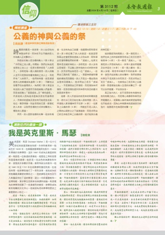 第 3112 期 主曆 2024 年 4 月 14 日(禮拜日) http://ChristianWeekly.net 信 3仰我是英克里斯.馬瑟英克里斯.馬瑟 (Increase Mather ) 是一位十七世紀的美國清教徒牧師、作家和教育家。他出生於 1639 年,在麻薩諸塞灣殖民地長大。1656年畢業於哈佛學院,並於 1661 年成為北教堂的牧師。馬瑟是一位敬虔的清教徒,他堅信上帝的旨意和基督教的道德;他更是一名出色的演講者和作家,曾發表許多關於宗教、教育和政治的著作。他從 1681 年至 1701 年在哈佛學院擔任院長,在這段時間,他對學院進行了一系列改革,使其成為新英格蘭最具聲望的學府之一。他的課程改革包括引入希臘語和拉丁語的學習,建立一座新圖書館和一座博物館,要求學生定期參加演講和辯論。馬瑟還為哈佛學院招募了一些最優秀的教授,使學院成為新英格蘭的文化中心。他被認為是哈佛學院歷史上最重要的人物之一。聽着,年輕人,我是英格里斯.馬瑟,我的名字在這個塵世已經逐漸被遺忘,但我的精神,如同堅韌的橡樹,將在未來世代繼續傳遞智慧。牢記這些字句,它們是經歷烈火的洗禮和反思的錘鍊而成心血結晶。首先,請銘記聖約:我們是上帝的兒女,受縛於神聖的盟約,這份承諾刻在我們的靈魂深處,而不是在紙張上。請你堅定不移地遵守它的律令和典章,因為這是我們社會的基石,是引導我們在罪惡的險灘中航行的指南針。年輕的朋友們,上帝選擇了這塊新迦南美地,這是新的伊甸園,作為祂選民的家園。我們不僅僅受縛於神人之間的聖約,也受縛於神聖的大使命,要建立一座城在高高的山峰,發出照亮全世界的公義之光。其次,守護信仰的火焰:不要讓信仰的火種在懷疑的狂風或誘惑的陰雨中熄滅。用虔誠來挑旺火焰,用祈禱來維繫它,讓它明亮的光芒照亮你和你周圍的人的道路。要知道人世間的荒野廣闊而危險,只有堅定不移的信仰之光才能引導你穿越黑暗。年輕的棟樑們,基督信仰不僅僅是個人的安慰,也是在神公義的火焰中鍛造出來的兵器,它是我們建立國度的基石,是上帝榮耀的見證,也是全世界追隨的閃亮典範。第三,用知識作為正義的利劍:讓我們對學習充滿無限的渴望,因為這是解開上帝創造奧祕的鑰匙。讓你的思想成為抵擋無知的堡壘,棄絕迷信的屏障,以及生命的智慧源泉。但要記住,年輕的棟樑們,知識不是孤獨的追求,而是可以分享的火炬,能照亮他人航道的燈塔,讓你的知識不僅限於世俗世界,也與上主的神聖計畫相關聯,因為只有通過理解上帝的旨意,我們才能建立一個真正卓越的家國。第四,為正義而戰:讓你的聲音與受壓迫者的呼喊和呻吟共鳴。為寡婦和孤兒辯護,對有權力者說出真相,不知疲倦地為上帝公義的律法辯護。年輕的棟樑們,正義不僅是一個原則,也是我們信仰的基石。我們不僅僅被呼召要正義,也要成為全世界的正義燈塔,證明上帝賦予每個人固有的權利和尊嚴。最後,永遠不要忘記看不見的世界:雖然我們的眼睛被束縛在人間,但我們的靈性在天空中翱翔。這個世界只是一個短暫的舞台,是靈魂的試煉場。我們努力爭取戴上永恆的冠冕,讓人在世上的行動成為在天上的抱負的證明。年輕的棟樑們,願你們知道我們在世間的努力並非徒勞無功。它們是高峰的基石,是我們將建立反映上帝榮耀的國家的基石。年輕的棟樑們,這是我在你們心中播下的心語,精心呵護它們,勤奮澆灌它們,看着它們綻放成一片正義的森林,在未來世代的風景中增添光彩。現在,出發吧!帶着信仰的火炬、正義的利劍和對天堂的堅定目光,去成為實現先輩承諾的一代,成為渴望光明的希望之光,成為亞美利堅永恆遺產的見證。願上帝保佑你們,願祂的光永遠照亮你們的道路。復活期第三主日釋經講道陳曉東清教徒們的最後一課徒三 12-19;詩四 1-8;約壹三 1-7;路二十四 36 下 -48公義的神與公義的祭詩篇第四篇是一首哀歌,詩人迫切地向神發出呼求,因為有不公不義的惡人作為敵人正攻擊詩人。到底這班敵人是怎樣的敵人?第 2 節以「你們這上流人哪」作開始,我們以為這是指那些上流人士,但原文看來卻是「人的眾子」,亦即是每一個人類的意思。詩人的敵人並不只是那些有權有勢的上流人士,而是所有「人的眾子」,他們的特質,就是期望使詩人的榮耀成為羞辱(2 節),不斷地以各種手段去羞辱詩人,為何呢?第 2 節並沒有說詩人做了甚麼而引致他被敵人們羞辱,而是這班敵人「喜愛虛妄」及「尋找虛假」,代表這班人因為追求虛無及謊言而羞辱詩人,所尋求的虛無及謊言有可能是指名氣、地位、戰爭得勝、利益等等的元素,便眼紅詩人本身,以致用各樣的方式來攻擊詩人,導致詩人蒙羞。然而,詩人面對這樣的攻擊,他沒有報復,也沒有為自己辯護,他選擇向耶和華祈求。第 3 節記載了詩人的宣認,他宣認耶和華必定會把那些虔誠人分別出來,耶和華必定會聆聽他們的祈禱,「虔誠人」在原文看來是忠誠於神的人。亦即是說,詩人沒有以惡報惡,不以敵人對待他的方式來對待對方,反而求問自身是否一位「虔誠人」,若果自己真的是「虔誠人」,那麼神便會聆聽他的禱告而回應他。詩人不是以一種自我的出發來回應敵人,他求問自己是否「虔誠人」,不是憎恨自己所憎恨,而是憎恨神所憎恨,把恩怨情仇提升到神喜悅與否的層次與高度來看待。這樣,詩人所重視的就是神的聆聽與喜悅,過於自己是否能在敵人面前得勝。詩人呼籲敵人要畏懼