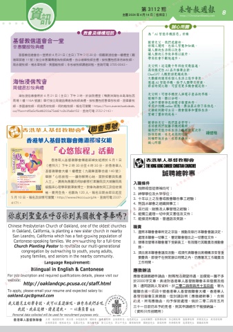香港華人基督教聯會 主席:鍾健楷牧師 副主席:余英嶽牧師 總幹事:陸幸泉牧師 出版部部長:吳思源先生 出版部顧問:翁傳鏗牧師 李志剛牧師 張振華牧師 許朝英先生 胡明添牧師 出版部委員:植栢燊先生 吳業立先生 蘇永權先生 黃文江先生 許立中先生 鄺偉衡牧師 關銳煊先生 梁銘牧師 李鴻標牧師 吳渭濱先生 關鎮威牧師第 3112 期 主曆 2024 年 4 月 14 日(禮拜日) http://ChristianWeekly.net 資 8訊為「AI 智能手機困惑」祈禱親愛天父,我們感謝祢,祢賜人聰明,也給人智慧和知識,讓人類的生活得以改善,讓人類的工作效率得以提升,帶來社會不斷地進步。天父啊!近這數十年科技突飛猛進,高效穩定性 AI 晶片推陳出新,ChatGPT 人機對話更趨成熟,大數據的運用在個人生活上逐步普及,透過 AI 智能手機,給予人類帶來便捷,節省時間之餘,可望有更多機會親近祢。天父啊!可惜手機使人與電子產品的界線,模糊不清,難以分明,人與不需要停息的電子裝置共存,常處於待機 online 狀態,無法真正停下來休息,更難談到勤守主日、教會服事和靈修生活,窒礙了靈命的成長。親愛的天父,我們真是苦呀! 求祢救我們脫離手機的羈絆,讓我們有能力在生活上選取優先次序,仿效耶穌,在天未亮的時候,到曠野地方去,在那裏禱告。誠心所願鍾健楷教會及機構短訊誠心所願基督教信道會合一堂辛惠蘭按牧典禮基督教信道會合一堂將於 4 月 21 日(主日)下午 2 時 30 分,假觀潮浸信會一樓禮堂(觀塘翠屏道 11 號)按立辛惠蘭傳道為牧師典禮。由李德榮牧師主禮;按牧團包括李芳妹牧師、周永健牧師、褚永華牧師、黄國維牧師﹔李思敬牧師講道訓勉。查詢可電 3705-0043。海怡浸信教會周健昌按牧典禮海怡浸信教會將於 4 月 21 日(主日)下午 3 時,於該院禮堂(鴨脷洲海怡半島海怡西商場 1 樓 116A 號舖)舉行按立周健昌傳道為牧師典禮。按牧團包括曹偉彤牧師、屈偉豪牧師、李國雄牧師、何袁秀琼牧師、何約翰牧師。報名可瀏覽:https://form.everestwebdeals.co/?form=df0a5cf6d46203a75dd21c2b3fa8d152,查詢可電 2552-2143。資訊香港華人基督教聯會傳道部婦女組「心悠旅程」活動香港華人基督教聯會傳道部婦女組將於 6 月 1 日(禮拜六)下午 2 時 30 分至 4 時 30 分,於香港華人基督教聯會大樓 1 樓禮堂(九龍樂富聯合道 140 號)舉辦「心悠旅程──讓你解開心結.面對抑鬱與焦慮人士」,講員為雅麗氏何妙齡那打素醫院及大埔醫院高級臨床心理學家劉澤俊博士。對象為教牧同工及信徒領袖,費用全免,名額為 120 人,報名日期由即日起至5 月 10 日。報名及詳情可瀏覽:http://www.hkcccu.org.hk,查詢可電 2337-4171。co/?form=df0a5cf6d46203a75dd21c2b3fa8d152,查詢可電 2552-2143。香港華人基督教聯會傳道部婦女組「心悠旅程」活動聯會專號(讓你解開心結面對抑鬱與焦慮人士)日期:2024年6月1日(禮拜六)時間:2:30 - 4:30 p.m.地點:香港華人基督教聯會大樓一樓禮堂 (九龍樂富聯合道140號)對象:教牧同工及信徒領袖名額:120人費用:全免截止日期:5月10日(額滿即止)香港華人基督教聯會傳道部婦女組專題講員:劉澤俊博士(雅麗氏何妙齡那打素醫院及大埔醫院高級臨床心理學家)查詢電話:2337 4171 網址:www.hkcccu.org.hk誠聘總幹事入職條件1. 牧師或信徒領袖均可;2. 神學學位及大學學位;3. 十年以上之牧會或教會聯合事工經驗;4. 熟識本聯會之組織與事工;5. 具行政、財務及人事管理之經驗;6. 能獨立處理一切中英文書信及文件;7. 能操流利粵語、普通話及英語。職責1. 遵照本聯會會章所定之宗旨,推動及執行本聯會會議決定,處理本聯會一切事工,審定聯會發出之一切書信文件。2. 領導及督導本聯會屬下受薪員工,有效履行其職責及推動會務。3. 須出席本聯會會議及活動,或須代表聯會出席機構及堂會重要慶典,即使不在例常辦公時間之內,仍應屬其工作職責及工作時間。應徵辦法應徵者請親繕申請函,附履歷及期望待遇,並撰寫一篇不多於2000字文章,表達對香港華人基督教聯會未來發展及抱負;連同諮詢人等資料,於二零二四年四月十五日前,寄九龍聯合道一百四十號香港華人基督教聯會大樓,香港華人基督教聯會主席親啟,信封請註明〔應徵總幹事〕,合則約見。所有應徵函,均予保密處理。倘於二零二四年五月三十一日前仍未予約見者,則其申請視作不被接納論。(資料只作招聘用)Christian Weekly 海怡浸信教會將於 4 月 21 日(主日)下午 3 時,於該院禮堂(鴨脷洲海怡半島海怡西基督教週報海怡浸信教會周健昌按牧典禮Christian Weekly 塘翠屏道 11 號)按立辛惠蘭傳道為牧師典禮。由李德榮牧師主禮;按牧團包括李芳妹牧師、周永健牧師、褚永華牧師、黄國維牧師﹔李思敬牧師講道訓勉。查詢可電 3705-0043。海怡浸信教會基督教週報基督教信道會合一堂將於 4 月 21 日(主日)下午 2 時 30 分,假觀潮浸信會一樓禮堂(觀塘翠屏道 11 號)按立辛惠蘭傳道為牧師典禮。由李德榮牧師主禮;按牧團包括李芳妹牧師、Christian Weekly 基督教週報主曆 2024 年 4 月 14 日 Christian Weekly第 3112 期 (禮拜日)Christian Weekly (九龍樂富聯合道140號)對象:教牧同工及信徒領袖名額:120人基督教週報 月1日(禮拜六)30 - 4:30 p.m.香港華人基督教聯會大樓一樓禮堂(九龍樂富聯合道140號)教牧同工及信徒領袖(雅麗氏何妙齡那打素醫院及大埔醫院高級臨床心理學家)Christian Weekly 「心悠旅程」活動香港華人基督教聯會傳道部婦女組將於 6 