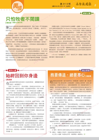 第 3113 期 主曆 2024 年 4 月 21 日(禮拜日) http://ChristianWeekly.net 輿 2情在書店無意中看到也斯的著作《也斯的香港》,翻閱數頁即被深深吸引,遂把書買下。也斯(1949-2013),原名梁秉鈞,香港著名作家及詩人,曾任教嶺南大學。這書內容如書名,是也斯眼中的香港,共有 39 篇文字和 179 幀照片,照片都是也斯的傑作,原來他也是一位攝影家。書中有一章提到他曾被「突破出版社」婉拒出版的經歷。他說1991 年初曾將以香港為題材的詩及攝影作品交出版社,並口頭上給確認可以出版,但到了翌年初,他將補充的材料交上,才知道要吃閉門羹。「我們帶着完成的初稿在九二年初回港,交給了出版社,才發覺情況已經不同。出版社的雜誌和書籍多少改變了風格。我幫忙編的兩本文學書,銷路並不好。發行方面有困難,有壓力。我們的書總之無法出版了。我可以理解,在香港目前的情況下也無法苛求。只不過,帶着我們種種意見的詩和攝影找不到歸宿,散亂地扔在抽屜和影室的一角,變成無家可歸的詩與攝影了。」也斯宅心仁厚,雖有點無奈,但沒有怪責出版社。我很想告訴也斯先生,當年我就是突破出版社的負責人,那個決定我是有份的。但我再想告訴你—在天上的也斯先生,昔日的攝影和文字,今日竟然再一次在我手中,我愛不釋手地細閱每篇散文、欣賞每幀相片。你的作品讓我們更愛香港,更珍惜香港的過去和每一處地方。《傳道書》說:「已有的事,後必再有;已行的事,後必再行。」(傳一 9)人生就是如此奇妙,你曾因種種緣故婉拒了某些人和事,但好多年後,你發現這一切拐個彎,或者以另外一種形式,又回到你身邊。在剛過去的復活節,做了很多事情,百事紛陳,但想深一層,卻也真的忽略了領人歸主的事!回想這幾年,疫情加上移民潮,在領人歸主的事情上,的確令我們分心,起碼有幾個原因:第一是教會內部多了人事轉變,急於要處理好應對的工作,自然就將長年累月的領人歸主的工作放慢了;另外疫情之下聚會減少或停止,自然亦少了福音小組、餐會和佈道會,再加上過去我們「儲備」了的福音對象或弟兄姊妹未信主的配偶又一家大小的移民了,自然就失卻了這些機遇。但我們不要忘記我們的使命,就是要傳道,這幾天翻開提摩太後書四章二節,卻有新的體會,保羅勉勵提摩太「務要傳道」時,原來後面還有一句,就是「無論得時不得時,總要專心」,原來這節經文有兩個層次,一是「務要」,另外則是「專心」。保羅知道提摩太在教會中,受很多事情的牽扯,於是保羅就勉勵提摩太:務要傳道,總要專心,即不要被其他事物分了傳道的初心。我們現時好像遺缺了一些動力,所以也要用一些計畫來重新鍛鍊我們的意志,以下建議一些提升領人歸主動力的做法:1. 在堂會的祈禱會,要特別提名為一些有參與教會聚會的慕道者禱告,因這是上帝感動他們繼續參與聚會,莊稼漸熟,我們要預備好為主收取已熟的莊稼。2. 要教導每一位弟兄姊妹,心裏設定一位福音對象,在未來一段時間,無論得時不得時,總要邀請他參與教會聚會、或崇拜、或團契。3. 在未來半年,堂會要開辦福音小組,要在堂會內大肆宣傳,最低限度:三人成團,然而那宣傳的作用,就是告訴弟兄姊妹,無論得時不得時,務要傳道。4. 還有,教牧同工或弟兄姊妹必須以分別為聖的態度,將一個禮拜中某一個晚上,奉獻給上帝使用,與福音對象見面和代禱。以上是小小建議,盼望為主所用,務要傳道,總要專心。始終回到你身邊 務要傳道,總要專心 筆者由於幼童時期在教會學校裏認識基督,開始了超過一甲子返教會的習慣。對於講台信息,大多時候只感到是「行禮如儀」,期待不大,甚是可惜!記得約在小四時,可能是受到國語科老師影響,漸漸愛上流連圖書館、書店和書檔間,還讀完了簡化版的中國四大章回小說。在教會裏,也留意到堂會週報、免費取閱刊物(或需訂閱)如《福幼》、《福音報》、《聖經報》、《中信月刊》、《燈塔》等流傳,上中學後出現了《抉擇》、《突破》、《中學生月刊》等期刊,間中還會獲贈書籍,印象最深有《新約聖經》(基甸會)、《真道手冊》、《為主受苦》(以上中信)、《萍踪感言》(基督徒送書會)等,實屬「小確幸」。閱讀成了我成長的動力。香港原是個華洋雜處的社會,在中文獲得法定語文地位後,中、英文混用成了生活日常。但在接受教育過程中,英語是主要教學語文,又遇上中文書寫語文和粵式日常口語夾雜運用,徒增學習和表達的困難性和複雜性。教牧雖然都具備基礎聖經和神學訓練,但個別語文掌握能力和辨析能力卻極其參差。若是因個人生活體驗狹窄,又不願意多騰時間空間閱讀,在當前瞬息萬變的網路世界裏,牧者便容易迷失自己,無法滿足會友的需要和期許。英國聖公會第一○四任坎特伯利大主教羅雲.威廉斯(Rowan Williams)在廿九歲時出版處女著作 The Wound of Knowledge: Christian Spirituality from the New Testament to St. John of the Cross(1979 年初版;中譯為《知識的傷痕──從新約到路德與十架約翰的靈修學史》,乃根據 1990 年修訂版本翻譯)。書名乃出自威爾殊詩人托馬斯(R. S. Thomas)詩作〈羅傑.培根〉(Roger Bacon)中的一個片語。威廉斯以神學小品形式,回應詩人托馬斯的片語,為「知識的傷痕」作出神學注腳。開篇第一頁就以「矛盾」、「陌生性」,來道出威廉斯心中的信念,認定信仰的知識核心是因着上帝臨在的奧祕而負傷。全書爬梳基