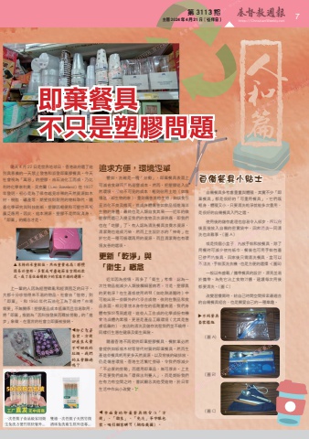 http://ChristianWeekly.net7 第 3113 期 主曆 2024 年 4 月 21 日(禮拜日)自備餐具小貼士自備餐具多考慮重量與體積,其實不少「即棄餐具」都是很好的「可重用餐具」。它們既輕身、體積又小,只要清洗乾淨就能多次重用,是很好的自備餐具入門之選。使用後的儲存處理也容易令人卻步,所以用後直接放入自備的密實袋中,回家連袋一同清洗也非難事。( 圖 A)或是找個小盒子 , 內放手帕和放餐具,除了用餐時可減少使用紙巾,餐後也可用手帕包着已使用的餐具,回家後只需清洗餐具,盒可以不清洗,手帕丟洗衣機,也是方便的選擇。(圖B)一般以布盛載 / 攜帶餐具的設計,漂亮並易於攜帶,為免它沾上食物汁醬,建議每次用後都要清洗。( 圖 C)改變習慣需時,給自己時間空間探索最適合的自備餐具組合,也是關愛自己的一種樂趣。明天 4 月 22 日是世界地球日,香港政府選了這別具意義的一天禁止發售和派發即棄膠餐具。今天社會視為「萬惡」的塑膠,由石油化工而成,乃比利時化學家利奧·貝克蘭(Leo Bakeland)在 1907年發明,初心是為了保存越見珍稀的天然資源如木材、樹脂、礦產等,期望找到耐用的物料取代。隨着化學研究與科技創新,塑膠因輕便和可塑性高被廣泛應用。因此,追本溯源,塑膠不是問題真身,「即棄」的概念才是。追求方便,環境埋單譬如,洗碗是一種「勞動」,即棄餐具表面上可減省食肆可見的經營成本。然而,把塑膠送入自然環境,卻有不可見的成本:輕則佔用土地 ( 如堆填區,即生物的家 ),重則傷害其他生物,如誤食引至消化不良及餓死,造成身體傷害如飲品插進海洋生物的身體;最終也是人類自食其果——近年的微塑膠問題已入侵至我們的食物及水源供應,即我們也在「吃膠」了。有人認為清洗餐具浪費水資源,清潔劑也造成污染.然而上主設計水的「神奇」在於它是一種可循環再用的資源,而且清潔劑也有環境友善的選項。更新「乾淨」與「衛生」概念近年因為疫情,再多了「衛生」考慮,認為一次性物品能減少人類接觸細菌病毒。可是,塑膠真的更乾淨?在生產或使用過程(如吃熱湯麵時)中可能出現一些額外的化學合成物,依附在製品和食品表面。相比環境本身存在的低劑量病菌,我們身體有預設機制處理,這些人工合成的化學成份有機會造成體內累積,更甚是產品工廠環境(尤其是售價低廉的)、食店的清洗及儲存流程我們並不曉得,同樣衍生潛在健康及衛生風險。 隨着香港不再提供即棄塑膠餐具,餐飲業必然會提供如紙或木材等替代材質的即棄餐具。然而生產這些餐具耗用更多天然資源,以及背後的碳排放,仍是傷害環境。香港生活繁忙勞碌,令我們想減少「不必要的勞動」而選用即棄品,無可厚非。上主不是要我們成為「環保法利賽人」,而是期盼我們在有力有空間之時,嘗試顧念其他受造物,於日常生活中作出小改變。上一輩的人因為經歷戰亂和經濟困乏的日子,大都十分珍惜得來不易的物品。社會由「惜物」到「即棄」,和 1960 年代石油化工為了保持「巿場需要」不無關係:塑膠產品成本低廉而且容易取用,將「即棄」推銷為「因科技發展而釋放勞動」的「進步」象徵,在富庶的社會立即廣被接納。▲木椅的承重較佳,然而重量也高;膠櫈因易於塑形,多製成可疊起節省空間的款式,成了居住面積較少的家庭不錯的選擇。▲即棄聖餐套裝,方便卻產生大量不可回收的垃圾,我們的主會難過嗎?▲巿 面 賣 的 即 棄 餐 具 總 會 以「 方便」、「衛生」、「免洗」等字眼包裝,吸引顧客購買(網絡截圖)。( 圖 A)( 圖 B)( 圖 C)▲不同餐具套裝樣版第 3113 期 主曆 2024 年 4 月 21 日(禮拜日)Christian Weekly 基督教週報 Christian Weekly 基督教週報 Christian Weekly 基督教週報主曆 2024 年 4 月 21 日 基督教週報 Christian Weekly第 3113 期 (禮拜日) Christian Weekly Christian Weekly Christian WeeklyChristian Weekly 基督教週報 Christian Weekly 着化學研究與科技創新,塑膠因輕便和可塑性高被廣泛應用。因此,追本溯源,塑膠不是問題真身,填區,即生物的家 ),重則傷害其他生物,如誤食引至消化不良及餓死,造成身體傷害如飲品插進海洋基督教週報可減省食肆可見的經營成本。然而,把塑膠送入自然環境,卻有不可見的成本:輕則佔用土地 ( 如堆填區,即生物的家 ),重則傷害其他生物,如誤食引Christian Weekly 追求方便,環境埋單譬如,洗碗是一種「勞動」,即棄餐具表面上可減省食肆可見的經營成本。然而,把塑膠送入自基督教週報 Christian Weekly 基督教週報 Christian Weekly 基督教週報 Christian Weekly 套裝,方便卻產生大量基督教週報會造成體內累積,更甚是產品工廠環境(尤其是售價低廉的)、食店的清洗及儲存流程我們並不曉得,即棄聖餐套裝,方便Christian Weekly 的更乾淨?在生產或使用過程(如吃熱湯麵時)中可能出現一些額外的化學合成物,依附在製品和食品表面。相比環境本身存在的低劑量病菌,我們身體有預設機制處理,這些人工合成的化學成份有機會造成體內累積,更甚是產品工廠環境(尤其是售基督教週報近年因為疫情,再多了「衛生」考慮,認為一次性物品能減少人類接觸細菌病毒。可是,塑膠真Christian Weekly 或是找個小盒子 , 內放手帕和放餐具,除了用餐時可減少使用紙巾,餐後也可用手帕包着已使用的餐具,回家後只需清洗餐具,盒可以不清洗,手帕丟洗衣機,也是方便的選擇。(圖B)基督教週報後直接放入自備的密實袋中,回家