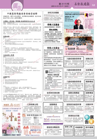 第 3115 期 主曆 2024 年 5 月 5 日(禮拜日) http://ChristianWeekly.net 廣 10告九龍城潮語浸信會聘傳道多名,神學畢業具牧會經驗及團隊精神。主動熱誠委身牧養及教導。主責分別兒童事工、青少年事工、男士事工。電郵[email protected]王小姐收合則約見歡欣僱傭嚴格挑選菲印傭工適合不同家庭需要提供專業顧問服務經驗豐富服務真誠查詢21558177新新工程承接水電油漆泥水各項裝修工程取價公道歡迎教會及主內肢體電90819077免費報價陳弟兄祝福搬屋提供各類型優質搬遷,住宅唐樓寫字樓鋼琴拆裝傢俬,收納入箱,用心服務,查詢61392582佐敦物業出租佐敦突破中心高層寫字樓物業出租,鄰近佐敦港鐵站,建築面積約2050平方呎,租金每月港幣58,000,獨立冷氣,不包差餉、管理費及水電煤,有意請電27132528黃小姐。資助如下福⾳事⼯:醫療及戒毒、弱勢群體、邊青及家庭、監獄牧養等。有意申請者請即時在青牧基⾦網站下載表格填妥,2024年5⽉18⽇中午12時前親送或寄到九⿓鑽⽯⼭鳳德邨紫鳳樓地下4-5號。查詢23223613 葉姑娘∕梁姑娘侍奉⼈⽣基⾦基⾦會按照聖經教訓,樂意提供:緊急⼩量撥款誠聘傳道神學畢業,四分三職,委身團隊合作,履歷[email protected]宣道會坪洲堂招聘用教會物業待售深水埗青山道二樓全層,建築面積2350平方呎,適合教會聚會、機構辦公或提供社區服務用途,售價一千五百萬元,有意請電25280186。招聘幹事兼或全職,主責會計及支援事工。請繕履歷耀東浸信會[email protected],只招聘用。聘請傳道牧養50人堂會,附設功輔班,履歷寄馬鞍山耀安邨耀頌樓地下G003耀頌 堂 人 事 招 聘 用 九龍城潮語浸信會聘會計幹事,具LCCI高級簿記文憑或以上,3年工作經驗,獨立處理賬目能力,有意繕履歷,要求待遇,電郵[email protected]王小姐收,合則約見。招聘用九龍城潮語浸信會聘事務幹事,負責場地安排及物資管理,協助辦公室電腦文書及外勤工作,中學畢業持水電牌優先,需輪班。電郵[email protected]王小姐收,合則約見。招聘用誠聘全職傳道牧養婦女及長者或兒童,視乎經驗及負擔。道學碩士、神學學士或同等學歷。履歷寄葵芳盛芳街葵芳商業中心13樓基立浸信會方牧師收或電郵[email protected]招聘用香港神託會招聘基督教機構一直推動各項精神復康、青少年、社企、醫療、教育等服務,致力宣揚基督福音。現邀請願意一起肩負使命應徵者加入。最新空缺stewards.hk/recruitment宣教師及福音幹事宣教師須神學畢業,主力兒童及家庭事工,宿舍或房津,5天半工作。福音幹事,協助教牧推動福音事工。履歷至[email protected]中華基督教會長洲堂招聘用按牧及就職禮香港路德會於五月十九日(日)下午三時假香港路德會沙崙堂(大角咀樓桃街十八號)為曾志澎教士、劉景駿教士舉行按牧及就職典禮,由會長戎子由博士主禮及證道。誠聘傳道負責兒童、婦女、少年牧養教導。請繕履歷[email protected]深井靈光堂人事小組招聘用中國基督教播道會港福堂誠聘港福堂是一個多文化的教會。我們歡迎各種職業、能力和技能水平的人才加入我們的團隊。夫婦區 / 弟兄區 / 英語區 牧區傳道同工各乙名職責﹕有關牧區工作資歷:信仰純正神學院畢業、具專責年齡牧區之教導、牧養及佈道恩賜每周工作 6 天,每天 8 小時;需周六及周日值班。福利包括:銀行假期、有薪年假、住院及門診團體醫保、進修假期及津貼。申請者請將詳細履歷及三位推薦人資料寄往-香港金鐘夏慤道 16 號遠東金融中心一樓本堂,或電郵至本會聘牧小組收 [email protected],合則約見。( 申請人資料將予保密及只作招聘用途 )網頁:www.kongfok.org 電話:2521 2500行政主任職責 :• 負責統籌及督導全教會之行政工作,包括辦公室管理、策勵及協調行政事務同工 • 協調教會各牧區及部門行政安排 ( 包括日常教會聚會、資訊科技、多媒體設計及影音事務等 ) • 負責對外聯絡及應變教會各項事務等要求 : 清楚得救、且有服事心志,並有穩定教會生活及事奉 性格主動、成熟、注重人際關係及溝通、具親和力及團隊合作精神 需大學畢業或以上程度,具 10 年或以上相關經驗,有教會行政管理經驗者優先 需周六、周日及輪班工作行政助理 / 幹事職責 :• 負責牧區各類聚會,文書及日常行政• 統籌部門舉辦之各類活動及協助籌備講座• 負責牧區及部門會眾資料整理及記錄• 管理部門資源 ( 包括刋物、書藉及其他物資 ) 及協助管理部門財政• 執行由行政主任所指派的其他職務要求 : 清楚得救、且有服事心志、成熟,並有穩定教會生活 人際關係良好,善於溝通;樂於與人協作、聯絡,具團隊精神 大專或以上程度,中英語文能力良好 熟悉中 / 英文電腦文書、熟悉 Microsoft Office 軟件;懂運用 Zoom,設計軟件及影片剪接軟件更佳 有 5 年或以上相關工作經驗者優先; 需周六及周日值班。堂務幹事職責 :• 負責日常教會場地運作安排及確保場地清潔• 預備教會恆常聚會的影音運作• 預備各項活動所須的設施• 負責簡單拍攝及剪片工作要求 : 清楚得救、且有服事心志、成熟,並有穩定教會生活 人際關係良好,善於溝通;樂於與人協作、聯絡,具團隊精神 中學畢業或同等學歷 懂電腦操作及教會工作經驗者優先 需周六、周日及晚上值班以上行政事務職位每周工作 5 天半,每天 8 小時。福利包括:銀行假期、有薪年假、住院及門診團體醫保、進修津貼等。有意應徵者,請將詳細履歷及薪