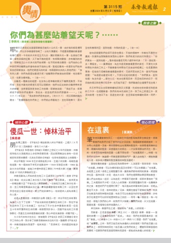 第 3115 期 主曆 2024 年 5 月 5 日(禮拜日) http://ChristianWeekly.net 輿 2情朋友傳上噩訊,《宇宙光》雜誌創辦人林治平教授,上週六(4 月27 日)因病辭世,享年八十六歲。《宇宙光》和香港的《突破》同樣於上世紀七十年代初創辦,林教授和他太太張曉風女士亦很熟悉蘇恩佩,因此兩間雜誌社曾有一段很親密和深厚的關係,尤其在早期的《突破》,也常有張曉風女士的賜稿。林治平教授 1938 年生於湖南省長沙市,生逢八年抗戰,母親抱着他逃難,有一個妹妹不幸死於逃難途中。1949 年移居台灣,1966 年政大外交所畢業,後進入中壢中原理工學院 ( 今中原大學 ) 任教,展開長達 37 年的大學教師生涯。林教授最為人所知的是在他三十五歲那年 (1973 年 ) 創辦《宇宙光》雜誌,從此以義工身分投入只賠不賺的「傻瓜事業」,後來更由一份雜誌擴大至「宇宙光全人關懷機構」。往後他又以義工身分在港、台、金三角毒窟毒蟲出沒之區,參與晨曦會福音戒毒工作,以至在世界各地設立福音戒毒村,成立門徒訓練中心,培訓過來人成為戒毒工作人員。走過人生漫長路,林教授於自傳《傻瓜一世:林治平的生命故事》為自己人生下了註解:「宇宙光做的就是賺取生命的工作,我在宇宙光固然作了五十年的義工,也付出了不少生命中寶貴的東西。但是五十年來所獲得的生命回饋,親眼看到許多人,因着宇宙光的工作潛移默化,而產生生命終極意義的改變,我心中就充滿感激、深覺不配。」九十年代末有次在台北,曾被邀到《宇宙光》的同工祈禱會分享文字工作的心得,我分享了與蘇恩佩姊妹交往的片段。臨離開《宇宙光》時,林教授趨前向我握手,他笑笑說:「思源弟兄,你的國語有進步了。」筆者曾與屬會教牧同工,一起前往中環的聖母無原罪主教座堂。感激導賞們為我們介紹了堂內的設計及設施,每個細節都娓娓道來,十分用心與盡責。及後,筆者靜靜地坐在寬闊的聖堂內,抬頭看着高聳的空間,環顧四周的聖畫,仰望着前方的祭台,一片安寧清靜油然而生。那一刻,很享受整個神聖的氛圍,心裏不禁在想,「在這裏真好!」的確,在我們的城市中,無論哪一所教堂願意開放門戶,讓人自由進入,總能夠讓進入者,或多或少體驗到聖堂裏面的神聖氛圍吧!筆者牧養的教會,坐落在旺角的鬧市中,人流甚眾。我常常想,作為「在這裏」的教會,可以怎樣祝福社區及坊眾呢?可以怎樣讓人「在這裏」去經歷上主呢?感恩上主藉聖靈引領,讓長執們都有相同的異象,期望服侍社區,服侍坊眾。於是,過去大半年,我們在週間開始學習開放教堂,讓人們自由進出!起初,以為這是一件簡單不過的事,卻原來事前的「預備」工夫還真的不少呢!尤其人心的預備,更須要聖靈的引領。在籌備多時之後,教堂的門戶在週間打開了,每天進出的來賓或弟兄姊妹,初期人數並不太多,只是,前來的朋友/兄姊,偶爾也會留下便條給我們,有表示在教堂內感到神聖的氛圍;有表示可以在教堂內好好休息及靜禱;亦有表示在教堂中可以好好經歷神對自己說話……等等。每一個留言、每一句說話,都進入我們的心中,給我們不少鼓勵!讓我們知道,天父在這裏,藉着這裏,祝福每位前來這裏的人!弟兄姊妹,教會所在之處,可以成為「身邊」人的祝福。而教會,正是基督的身體(弗五 23)。《聖經》教導,教會—基督的身體—正是由你與我所「組成」,故此,我們在某個意義來說,就是「教會」!(參羅十二 5、林前十二 27、弗四 12)那麼,我們「在這裏」或「在那裏」之時,我們又能否成為身邊的人的祝福呢?我們能否讓人在我們身上,感受到神的同在?能否讓人從我們的身上,體會到耶穌基督的真實呢?但願我們都是基督耶穌的見證者,都能成為身邊人的祝福!傻瓜一世:悼林治平 在這裏耶穌升天節是紀念基督耶穌復活後四十日升天一事,由於每年都是禮拜四,所以許多教會都忽略了,沒有大事慶祝,不過重視禮儀的教會都有舉行禮拜。今年的升天節是五月九日,關於耶穌升天一事,在使徒行傳第一章有詳細的記載,天下無不散的筵席,有相聚的歡愉,亦有離別的悲哀,耶穌復活四十天多次與門徒相聚,在不同的場合顯現,在門徒的心目中對耶穌的離開自然會有依依不捨的心情,聖經記載有一朵雲彩在門徒的眼前把耶穌接去,他們定晴望天的時候,有兩個穿白衣的人對他們說:「加利利人哪,你們為甚麼站着望天呢?這離開你們被接去的耶穌,祂怎樣升上天,也要怎樣來臨」。(徒一 11)分離是一種痛苦的經歷,在沒有心理準備的情況下離開是難受,不知所措,呆若木雞地定晴望天是可以理解的,他們忘記此刻的分離將帶來更大的榮耀,並將要面對更多的工作挑戰,耶穌曾說過:「我若不去,保惠師就不會到你們這裏來,我若去,就差他們到你們那裏來……。」(約十六 7)祂又說:「我去對你們是有益的」(約十六 7),何況耶穌的臨別贈言:「聖靈降臨在你們身上,你們就必得着能力,並在耶路撒冷,猶太全地和撒瑪利亞,直到地極,作我的見證。」(徒一 8)這句話提醒我們信仰不是停在懷念、不捨的情緒中,宗教也不應停在讚美、欣賞和自我陶醉與享受的心境中,我們有更大的託付和責任。「你們要去……直到地極。」整本福音書是可用八個字來代表:「來!跟從我,去!傳福音」—廣傳福音,為主作證是教會最重要的責任,不要花太多時間在外表的工作上。不錯教會花時間在行政會議和組織上,也是重要的事務,但這些只是輔助教