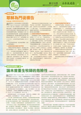 第 3116 期 主曆 2024 年 5 月 12 日(禮拜日) http://ChristianWeekly.net 信 3仰論未曾重生牧師的危險性我是田能特(Gilbert Tennent)牧師,1703 年 2 月 5 日出生於愛爾蘭阿馬郡的 Vinecash 村。父親是一名愛爾蘭國教牧師。他在我十五歲的時候帶領全家移民到美國賓夕法尼亞州。我在愛爾蘭和美國接受了父親的古典教育。我在二十歲時經歷了一次重要的信仰轉變,從此決心投身於牧職事奉。1725 年 5 月,我被費城長老會授予牧師執照,同年還獲得了耶魯大學的榮譽碩士學位。1726 年,我在新澤西州紐布朗斯維克開始了長達 38 年的牧會事奉。1740 年,在我人生的盛年,我在賓夕法尼亞州諾丁罕發表了著名的《論無重生牧師的危險》講章。這場講道引發了長老會內部的大辯論。後來我努力促成了長老會的重新合一,這在 1758 年實現了。我一生致力於復興信仰,人稱我是大覺醒運動中的重要領袖人物之一。(田能特牧師於 1764 年 7 月 23 日在費城去世,享年 61 歲。)親愛的弟兄姐妹們,我今天站在這裏,不僅是作為一名傳道者,更是真理的使者,向你們敞開心扉,分享我人生的最後一課:今日之際,我所要講述的話語,絕非輕浮,乃是對我們教會內部現狀的深切關懷。我所見到的,是許多教會內部的傳道者,他們未曾真正蒙恩,內心缺乏真正的靈性更新。這些「未重生的傳道者」我視他們為聖經中的法利賽人,外表虔誠,內裏卻是腐朽的。這些傳道者的所言所行,已導致了許多信徒走上了歧途,因為他們傳講的是一種沒有真正悔改認罪的錯誤福音。我呼籲你們,親愛的聽眾,要有覺醒之心,不要盲目跟隨那些缺乏真正信仰的傳道者。我也呼籲你們——傳道者,你必須悔改,經歷更新和變化,在向他人傳道之前,自己先要得到「重生」。我深信上帝呼召了我來揭示你們未蒙恩傳道者的虛偽,並敦促你們真正悔改。否則,你們將要面對上帝的審判,因為你們導致眾生誤入歧途,未盡到忠心的牧者責任。請你審視自己,確保自己確實經歷了救贖,才能宣講真理。我敦促會眾要有覺醒之心,不要盲目跟隨缺乏真正蒙恩標誌的傳道者。只有真正蒙恩的傳道者才能有效傳揚福音,帶領人靈魂得救。我受上帝的呼召,挑戰教會靈性的死寂。我的言辭激烈,我也無畏地面對批評者的指責,我今天站在這裏,不是出於自以為是,而是遵循神的呼召。我有責任揭露我們中間的偽善,呼籲這些未蒙恩的傳道者悔改,轉向主的光明。我深知對真實性的熱切呼籲必然引起更多的反對聲浪。但讓我們明白那些敢於指責我是偽君子的人,你們自己正陷入了自己所譴責的偽善之中。然而我在弟兄中間發義怒,並非要製造分裂,我願伸出手來尋求和解。讓我們共同努力,治癒這些威脅我們信仰生命中潰爛的傷口。以真理和真實為基礎的團契,將指引我們走向光明。所以,在虛假面前我的筆永不止息。我將繼續捍衛我們的信仰真理,倡導屬靈爭戰的正義,闡明福音的顯赫之光。願這篇佈道所引發的爭議不會白費;願它成為復興的催化劑,點燃我們土地上靈性覺醒的火焰。願我們變得更強壯、更堅定地站在基督的信仰中,對真理的承諾不動搖。我親愛的後代讀者,讓我們聽從主真實的呼喚,因為其中蘊藏着屬靈的更新之路。願我們作為傳道者和信仰團體,被真正的蒙恩改變,以致我們在黑暗籠罩的世界中照亮真理的道路。阿們。復活期第六主日釋經講道陳曉東清教徒們的最後一課徒一 15-17、21-26;詩一 1-6;約壹五 9-13;約十七 6-19耶穌為門徒禱告約翰福音十七章常被稱為大祭師的禱告(Prayer of Consecration)。正如馬太福音第六章 9-13 節一樣,約翰福音十七章 1-26 節也可稱為主禱文,因為顧名思義是耶穌的禱告,但當中也不是沒有分別的,因為在馬太福音六章 9-13節耶穌是教導門徒禱告,而約翰福音十七章 1-26節主要是耶穌為門徒祈禱,並且發生在最後晚餐及耶穌被捕之前。全段禱文粗略可分成三段:耶穌為自己禱告(約十七 1-5);為門徒禱告(約十七 6-19);以及為門徒的門徒禱告(約十七20-26)。作主門徒真是有福,有主為他們禱告,主是值得我們稱頌的!1. 主耶穌求神在危難中保守門徒耶穌此時與門徒分離在即,祂知道自己將要往神那裏去(13),過去祂一直保護他們(12),祈求神保守他們脫離惡者(魔鬼)的攻擊(15),因為門徒要和耶穌一樣,被差到世界去。世界恨他們,因為他們跟從了主,再不屬於世界,但他們要和主一樣,承擔在世界尋找亡羊的使命,以致無論圈內和圈外的,都要成為神的產業。(約十 15-16)耶穌知道此時正是極其危急的時候,因為門徒有如一粒芥菜種子,要能在風雨中生存、成長,以致頂天立地必須神的保守,正如詩篇一二七篇 1 節說:「若不是耶和華建造房屋,建造的人就枉然勞力;若不是耶和華看守城池,看守的人就枉然警醒。」2. 主耶穌求神幫助門徒懂得保護自己在約翰福音十七章中,耶穌數次提到門徒要合而為一(11,22,23)。門徒要合而為一,彼此相愛,才能成為暗世的明燈,完成主的託付。這是不錯的,但合而為一也是門徒保護自己和保護信徒羣體的祕訣,因為合一就是力量,不單能抵禦魔鬼的攻擊,也不給牠留有地步。門徒為何不能合一?因為中間存有嫉妒爭端,有人自高自大,輕看別人及高抬自己,以致彼此論斷,甚至毆鬥。這樣一來,在敵人面前必是不戰而敗,境況危矣!不能合一是私慾作怪(雅四 1),因此門徒必須警醒,攻克己身,爭取合一。耶穌求神說:「叫他們合而為一,像我