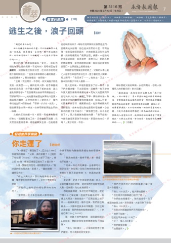 第 3116 期 主曆 2024 年 5 月 12 日(禮拜日) http://ChristianWeekly.net 薈 7萃「親愛的華人女兒:世上有種強大無比的力量,可以陪妳和家人走過一切風暴,就是禱告。女兒啊,放下對父親的恨,向耶穌哭訴吧!主都聽見,一定會出手幫助你們……」喬治的信,處處稱個案為「女兒」,盼盼也視他為可信任的長輩。早起時刻,見母親已在客廳晨跪,她就躲進主臥房浴室,在冰涼涼的地板跪下跟耶穌說話。「直接告訴耶穌妳心裏的難處,這就是禱告。」喬治這樣說,她照做。「主啊!我沒胃口、不想吃,卻又滿腦子都是食物,很難受……」幾回夜深人靜,她手執圓規躲在廚房角落,在手臂大腿畫下新的血痕,滿心羞恥與罪惡感。「我答應喬治伯伯不再傷害自己,可都辦不到……」她的靈魂被困在狹窄的斗室裏,黑暗猛烈襲來,斗室愈來愈小;她窒息了,奮力尋找逃生門,仰頭吶喊:「耶穌,求求你,救我!」眼前偶爾會出現一線光,彷彿耶穌推開逃生門的一隙縫……父親的反常持續一年。期間,母親率先整頓好身心,積極勤奮地工作,活得自信而踏實;兒女們見她重現喜樂,通通拾回安全感,也能適應爸爸缺席的日子。唯盼欣見耶穌終於推開逃生門,使媽媽走出創傷;她也逃出漆黑的斗室,不再自殘。每逢母親領到薪水,大家就興高采烈外出用餐,挑盼盼最愛的「健康主題」餐廳,一起陪她吃些菜式新穎、綠意盎然、清爽可口、耐吃不飽的精緻套餐,享受融融家庭樂。唯盼因此微微恢復胃口,往康復路上緩緩前進。某個歡愉用餐後返家的晚上,父親的日本三菱七人座中古車居然停泊在外。屋子裏的男人聞聲,馬上開門。「我回來了──」他欲言、又止,一臉未刮的鬍子令家人傻眼……男人返家後,幸福氛圍窒息了好一陣子;孩子們亦驚亦懼,不太理睬他,深怕另一枚不定時炸彈又要引爆難得傷癒的家。是為父的愛鍥而不捨地為家人付出,接送上下學、購物操家務、熱切參與兒女的家長會和音樂表演、給四人各買一片蘋果平板等等;最要緊的是,他對母親顯出柔情與體貼,前未有過地陪在廚房料理晚餐。心淡如水的妻子多方暗示:「事情發生過,回不去從前了!」男人黏膩膩抱着她的腰:「對不起啦!今後我會是更愛孩子的爸爸、更愛妳的老公,好嗎?」妻子笑笑,不語。「K,要醒了,要落船了。」亞力士(Alex)拍着我的肩頭,「兄弟,真的要醒了!已經到了地拉那(Tirana),所有人都下了船。」晚上近 10 時,橫渡亞德里亞海花了 4 個小時。入境,雙腳返回陸地,感到穩妥不少。「剛才真的很大風大浪,是嗎?」一邊向前擠,一邊問亞力士。「何止大風大浪,我以為這條船會被吹爛,覺得會死在地中海呢!」亞力士有點誇張地說。「那他們上船時派的嘔吐膠袋有沒有用?」「當然有,差不多全船的人都有嘔吐,你嗅不到船內酸酸臭臭嘔吐物的惡臭味嗎?」「我真的很累,睡得不醒人事,甚麼也不知道。」「兄弟,你也真是厲害,坐著都可以睡足全程。你知嗎?全船只有你和船員沒有嘔吐!我不是說笑的,K,你真的走運了!」是走運,更是上主奇妙的恩典:從小坐車也暈浪嘔吐的我,這次竟然在昏睡中逃過大難。是神蹟,內心充滿感恩。想起保羅傳道,多次在地中海往返,使徒行傳二十七章記載:他被押去羅馬途中,船遇上大風浪,險些送命。「狂風從島上撲下來……船被風抓住,敵不住風,我們就任風颳去……太陽和星辰多日不顯露,又有狂風大浪催逼,我們得救的指望就都絕了。」(使徒行傳二十七 14-20)第一次踏上地中海的船,與保羅相隔近2,000 年,開始明白多些他傳道旅程上的凶險。「每人 100 美元。」入境移民官看了我們護照,用不清晰的英文要求。逃生之後,浪子回頭你走運了▲一名逃至地拉那的科索沃難民孩子。麗群趙煥明飄零的音符窮遊世界學無窮(18)▲由地拉那到愛爾巴桑(Elbasan)的崎嶇山脈。阿爾巴尼亞人相信保羅曾經穿過當代的愛爾巴桑地區。飄零的音符(連載小說):四姐弟(大姐唯願、二姐唯盼、中度智障的三弟唯岸、幼弟唯眷)自喪母後,經歷一趟生命成長與心靈醫治之旅;認出路上同行的主。▲一名逃至地拉那的科索沃難民孩子。唯盼懷疑父親的舉動,去信問喬治,想男人該懂男人的把戲兒吧!對方回覆:「據妳描述,我相信妳的父親已經『浪子回頭』,將心歸家了;男人果真從糊塗混帳中蘇醒過來,會對家庭有無比強烈的熱愛,想方設法要彌補對你們造成的傷害。請妳學習原諒父親,與他和好,別再舊事重提。至於妳的母親,她仍然愛着妳的父親,只是不再像從前那種愛;因為她已找回自己,熱誠投入喜愛的工作。我深信妳的父母學會了尊重彼此,只要忘記背後,努力面前,家庭關係是會修好的……」 (待續)「我們在意大利巴里的辦事處已拿了簽證,你看看。」「每人 100 美元。」他大聲地重複。「但在意大利辦事處已經付了錢。」「你們站在旁邊等。」移民官命令,叫了後面的旅客上前。直到最後,大堂只剩下我倆。「每人 100 美元。」「但意大利那邊說我們不用再付款。」「他們不知道。」已經差不多午夜 12 時了。「好了,每人 50 美元。」「我們需要收據。」「這個當然。」 Weekly 視他為可信任的長輩。早起時刻,見母親已在客廳晨跪,她就躲進主臥房浴室,在冰涼涼的地板基督教週報喬治的信,處處稱個案為「女兒」,盼盼也視他為可信任的長輩。早起時刻,見母親已在客Christian Weekly 世上有種強大無比的力量,可以陪妳和家人走過一切風暴,就是禱告