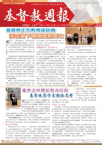 編輯及發行人:香港華人基督教聯會 督印人:陸幸泉 地址:九龍聯合道140號香港華人基督教聯會大樓二樓 電話:2337 4171 圖文傳真:2338 2314網 址:http://ChristianWeekly.net 電子郵箱:[email protected] 承 印:國強印刷制作公司 作者文責自負3117 2024年5月19日 逢禮拜日出版.本期出紙二張半.每份零售五元正本期推介 亞洲主日.王家輝 p2 ∣兩日一夜.龔立人 p6 ∣禍不單行昨已行.麗群 p7基督教生死教育座談會活在當下積極面對死亡亂世之中別忘努力付出基督徒寫作需換位思考現代人除了發信息、發帖文外,需要寫作的機會着實不多,加上閱讀風氣日益薄弱,不禁讓人思考文字在今天的價值。基督教常以文字作為傳播信息的媒界,面對「寫」與「讀」都疲弱的世代,文字事工該如何更新變化?基督教出版聯會於5月2日,假浸信宣道會明基堂舉辦講座,台灣著名基督徒作家張曉風以「A+B=C」為題,鼓勵基督徒在不可控制的環境中,不忘拿出自己的能力,抓緊華文創作的空間,為別人帶來祝福。張曉風先闡釋講座題目,指出A是指人不可能控制的事物,B是自身的努力,有了A加上B,最後就會出現C,那是人在這個世界上所能夠建立的成就;或者是給別人帶來的好處,而文字正是基督徒能付出「B」的部分。望以文字作奉獻張曉風回憶自己在十二歲信主,十五歲時曾把一張福音單張傳給父親看,以為這樣會讓父親信主,誰知父親卻說:「你們基督教啊,如果能夠把文字寫好,就不是今天這個局面啊!」從那時開始,張曉風就立志,希望能為主而寫作,及後在十七歲那年,她於《燈塔月刊》徵文比賽中奪得第一名,張曉風一方面感到高興,但也感到悲哀,「基督教的人都死光了嗎?怎麼讓我一個十七歲的小女孩得到第一名呢?那其他的人都去哪裏了?那時張曉風分享文藝創作與信仰的關係。面對死亡,人總是無能為力,但只要仍有呼吸氣息,就應把握機會與摯愛道別,以免終生抱憾。香港浸信會神學院信徒神學教育部於5月5日,假牛頭角浸信會主辦「基督教生死教育座談會」,主題為「在我們說再見那天 ……之前」,各講員分享其生命故事,從中反思信仰和基督教生死觀。香港醫院院牧事工聯會專業發展及牧關教育督導盧惠銓牧師指,每個病人都有後悔或想了結的事,可惜並非所有願望都能實現,然而,只要活着便仍有選擇的機會。他坦言,與摯愛「說再見」絕非易事,亦難以啟齒;但如果明白死亡是驟然而至,便應珍惜對方仍可溝通和表達感受的時間,透過道別令離世者有盼望、在世者得以從哀傷中重新上路。他又指,「善終」與去世年齡無關,關鍵在於離世過程中是否穩妥和有盼望,更重要是與自己、他人和上帝復和,尤其不要帶着苦毒和怨恨離開。他表示,早於十四歲時已知道自己是長期病患者,罹患癌症的機率比一般人高出800倍,只是永遠不知道「那天」來臨的時間。他直言,生死非人所能控制,若終日恐懼只會庸人自擾,不如活在當下,履行上帝給予他的使命,思考如何在往後日子為祂所用。認識臨終狀況 反思五道人生香港浸信會神學院講師劉永生先生分享,數年前因患急性胰臟炎入院,情況曾嚴重至主要器官衰竭,正當逐漸康復之際,竟突然發現患上癌症,故馬上被安排進行腫瘤切除手術。至今回想,整個治療過程長達120天,相比入院前,體重下跌了約26公斤,可以想像患病過程的艱苦。經歷死亡的邊緣,他深深體會時間並非掌握在自己手中,雖然這是老生常談,但人總有想做的事,以為自己能掌握一切。他稱,家人笑言他走過了死蔭幽谷,但他卻認為這是經過「青草地溪水旁」的經驗,以致他可以靈魂蘇醒,有所啟發。善別輔導員陳敏兒女士是已故藝人廖啟智的妻子,她憶述自己曾對病重的丈夫說:「為何你這麼怕死?難道你不知道死後會上天堂嗎?」她坦言,昔日的她並不了解臨終病人的心理困擾,以致說出了這種話,忽略了臨終者複雜的心理狀況。事實上,臨終者對死亡和未能預計的事都感到不安迷惘,一方面恐懼病情帶來的痛苦,一方面又失去康復和生存的希望,甚至被動地等待死亡。她表示,人雖然不能控制生死,但卻可選擇對死亡的態度及應對死亡的方式。她認為,當親人離開時,可以「五道彩虹」的概念回應──道謝,感恩對方給予自己的祝福;道愛,向對方表達感情;道歉,積極承擔自己的責任;道諒,寬恕各人的不足;道別,承諾和約定對方天家再見,並延續生命連結。至於如何與逝者建立延續聯繫,她認為可透過儀式、舊地重遊、對方的照片物件甚至價值觀等,將關係延續下去。「智叔(廖啟智)很喜歡幫助別人,現在他走了,我可以延續他這份生命特質,繼續幫他關顧其朋友 ……逝者的生命力,可以透過你,好好地活着。」最後她強調,「五道」不是臨終的課題,而是屬於生活的態度。(左起)座談會由盧惠銓牧師、劉永生先生、陳敏兒女士分享生命故事,梁梓敦先生主持。心裏特別難過。」而在往後的寫作生涯中,她也觀察到,華文的文字宣教工作,也只有華人才能做到,「外籍宣教士能在華人地方辦醫院、辦學校,甚至殉道,但寫作則十分困難,非華人來做不可。」作為世界上其中一個大族羣,張曉風認為能向華人傳福音,也是一種福氣。文貴於「為人設想」問答環節中,有出席者表示基督徒寫的文章一般較沈悶且說教味甚濃,如何透過不同寫作方式,讓未信的人看了高興,同時能把基督教信仰放在心裏?張曉風分析,基督徒寫的文章有時候太單向,不