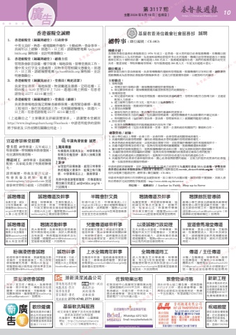 第 3117 期 主曆 2024 年 5 月 19 日(禮拜日) http://ChristianWeekly.net 廣 10告新新工程承接水電油漆泥水各項裝修工程取價公道歡迎教會及主內肢體電90819077免費報價陳弟兄祝福搬屋提供各類型優質搬遷,住宅唐樓寫字樓鋼琴拆裝傢俬,收納入箱,用心服務,查詢61392582教會物業待售深水埗青山道二樓全層,建築面積2350平方呎,適合教會聚會、機構辦公或提供社區服務用途,售價一千五百萬元,有意請電25280186。總幹事 ( 職位編號:CE-HO)機構介紹:基督教香港信義會社會服務部自 1976 年成立,是香港一家大型的綜合社會服務機構。本機構以創新、關愛和以人為本的精神,為基層和弱勢社群提供多元化的服務。機構目前管理著超過五十個服務單位和五十個特別計劃,擁有超過 1,500 名員工,服務範圍遍佈全港。我們的服務對象由幼兒至長者,覆蓋家庭、學校和職場等領域,每年服務超過 200 萬人次,年度支出超過 8 億元。職位概述:總幹事需向執行委員會匯報,負責領導機構的發展和管理服務。根據機構的宗旨和目標,總幹事將推動機構成為基督教社會服務的積極參與者,並致力於推動變革創新,以應對時代的需求。主要職責:1. 策略規劃a. 領導並執行策略計劃,確保機構持續提供優質服務。b. 制定願景和使命,確保機構實踐具備基督教理念的社關服侍。2. 領導與管理a. 制定適當的政策,有效地管理服務,確保財政資源的產生、管理和分配符合指導方針,並適當配置人力資源。b. 建立凝聚力強的工作文化,提升員工士氣和積極性。c. 發展專業技能,推動更好的績效。3. 企業管治與聯繫a. 確保有效的企業管治,配合執行委員會的審議和問責要求。b. 管理和控制各方面的風險,包括識別管理威脅,處理對機構產生負面影響的不確定因素。c. 與相關持份者(包括執行委員會、委員會、管理層和員工)就關鍵問題進行溝通。4. 持份者管理a. 促進各界對機構提供的服務範圍和內容有所了解。b. 與不同持份者(包括本會董事會、堂會、業界、企業和政府相關部門)聯絡和合作。專業資格 / 經驗:1. 碩士學位或以上學歷,社會工作、社會科學、社會管理或相關領域者優先。2. 具備相關的高級管理經驗,擁有社會服務或非營利組織的管理經驗者優先。3. 熟悉香港社會服務的政策、法規和最佳實務守則,並能貫徹於機構的運作和服務提供中。4. 具備卓越的領導及管理才能,能夠有效地領導和激勵團隊,推動機構發展和創新。5. 擁有優秀的策略規劃能力,能夠根據機構的使命和目標,制定長期和短期的發展策略。6. 具備財務管理和預算編制的經驗,能夠有效管理機構的財務資源並確保合理的配置。7. 具備出色的溝通和人際關係技巧,能夠與不同的持份者進行有效的溝通和合作。8. 具備強烈的社會責任感和服侍使命,關心社會弱勢群體的福祉,並致力於提供高質素的社會服務,弘揚基督教社關服侍精神。申請者請附詳細履歷,並於 2024 年 5 月 31 日或之前請寄交九龍窩打老道 50A 信義樓一字樓基督教香港信義會社會服務部執行委員會主席收或以電郵發送致 [email protected]。信封面、信內及電郵主題請註明 - 總幹事 ( 職位編號:CE-HO) 。申請者所提供資料只作招聘用途及絕對保密,如 2 個月內未獲回覆,即其申請不獲接納,其個人資料亦將會於完成招聘程序後銷毀。http://www.elchk.org.hk/service持信如一 起動前行 / Anchor in Faith Step up to Serve總幹事 ( 職位編號:CE-HO)誠聘聘課餘託管導師教導小學生課後功課輔導具教學經驗有愛心領兒童認識主耶穌。週一至五部份時間工作。履歷電郵青山浸信會[email protected](申請課餘託管導師職位)招聘用誠聘幹事中學畢業,行政/電腦操作,全職,需週六日上班電郵[email protected]誠聘傳道學士畢業、委身牧養青少年及職青,履歷[email protected]宣道會太和堂招聘用香港靈糧堂誠聘1. 香港靈糧堂(銅鑼灣總堂)- 行政幹事中英文良好,熟悉一般電腦軟件操作,主動成熟,委身事奉,具兩年以上經驗,須週六、日上班。請繕履歷電郵 [email protected] 陳牧師,並註明應徵職位。2. 香港靈糧堂(銅鑼灣總堂)- 總務主任管理教會影音設備、樓宇保養、場地設施,督導堂務員工作,懂中英文打字及文書處理,具物業管理相關文憑優先,須週六、日上班。請繕履歷電郵 [email protected] 陳牧師,並註明應徵職位。3. 香港靈糧堂(銅鑼灣總堂)- 堂務員 ( 晚更清潔 )負責堂址清潔、場地佈置、物資搬運及雜務、定時巡樓。工時由晚上 9:30 至翌日早上 7:30,逢週日晚上例假。有意者請致電 2577 4216 羅主任。4. 香港靈糧堂(銅鑼灣總堂)- 堂務員(維修)負責教會場地設施定期檢查維修保養、處理緊急維修、跟進工程項目、執行其他指派工作,有相關經驗優先,須週六、日上班。有意者請致電 2577 4216 羅主任。(上述職位之「主要職責及詳細資歷要求」,請瀏覽本堂網頁 http://www.lingliangchurch.org/Facebook。申請者所提供的資料將予保密及 只作招聘有關職位用途。)半職會計文員財務行政工作,中學畢業具L C C Higher及3年以上會計經驗熟電腦文書試算表,成熟勤懇。履歷[email protected]荃灣基督教惠荃堂堂主任收招聘用聘請傳道及幹事為擴堂需要,傳道需神學畢業,協助婦女牧養及兒童事工,經驗不拘,有事奉心志。幹事需中學畢業負責文書行政。繕履歷[email protected]宣道會筲箕灣堂招聘用以浸誠聘行政助理五天半週六日當值,中學畢業,熟電腦中英文打字略懂